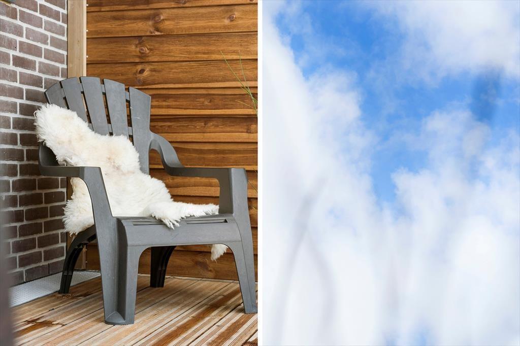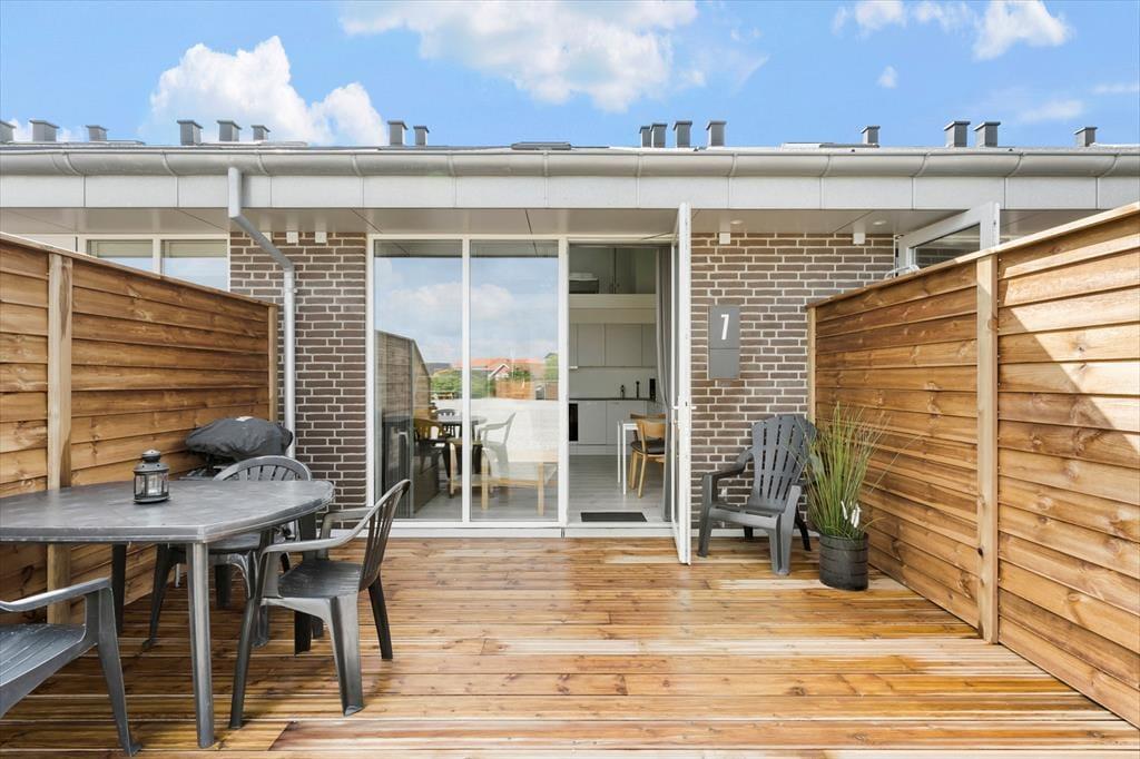 Eine kleine gemütliche Terrasse mit Gartenmöbeln. Die Terrasse ist von einem Zaun umgeben, sodass Sie in Ruhe draußen sitzen können.