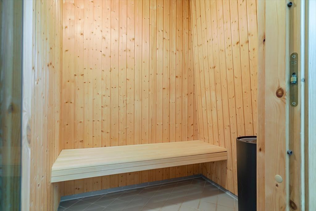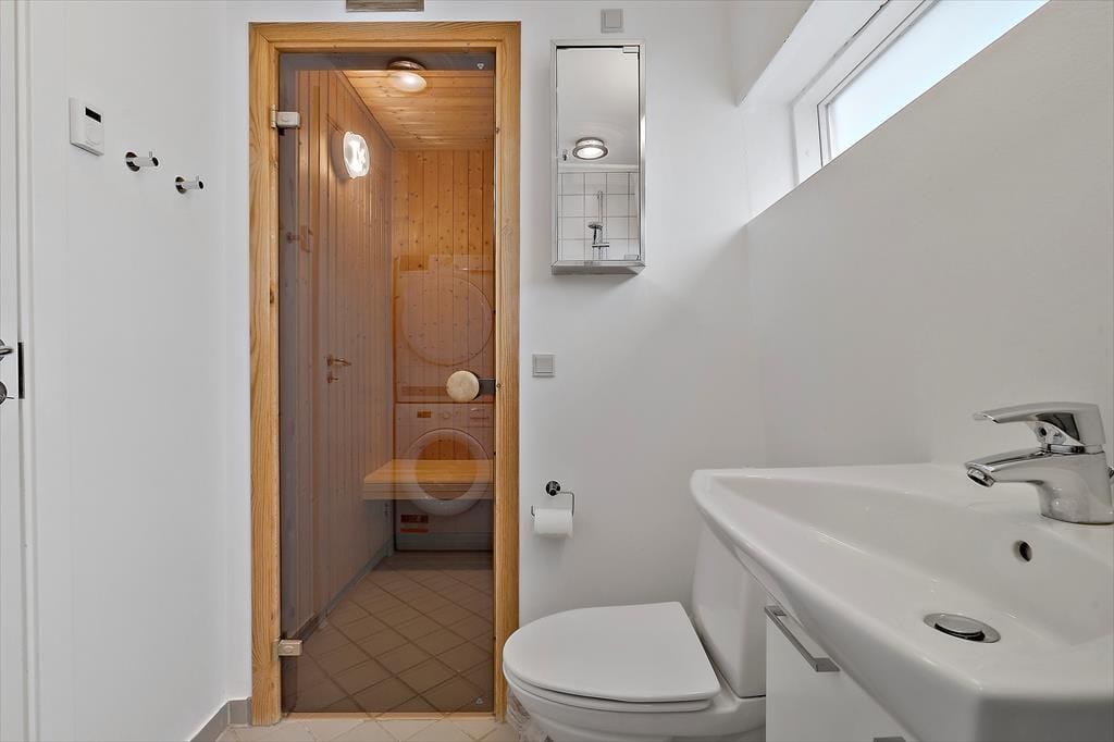Im Erdgeschoss gelangt man direkt in die Küche, die einen Essbereich und eine Spülmaschine enthält. Weiter vorne im Boot befindet sich ein großes Badezimmer mit direktem Zugang zur Sauna. Außerdem gibt es ein Badezimmer mit Whirlpool. Beide Bäder haben Fußbodenheizung. Das Hauptschlafzimmer hat Zugang zu einer privaten Terrasse mit Blick auf den Hafen.