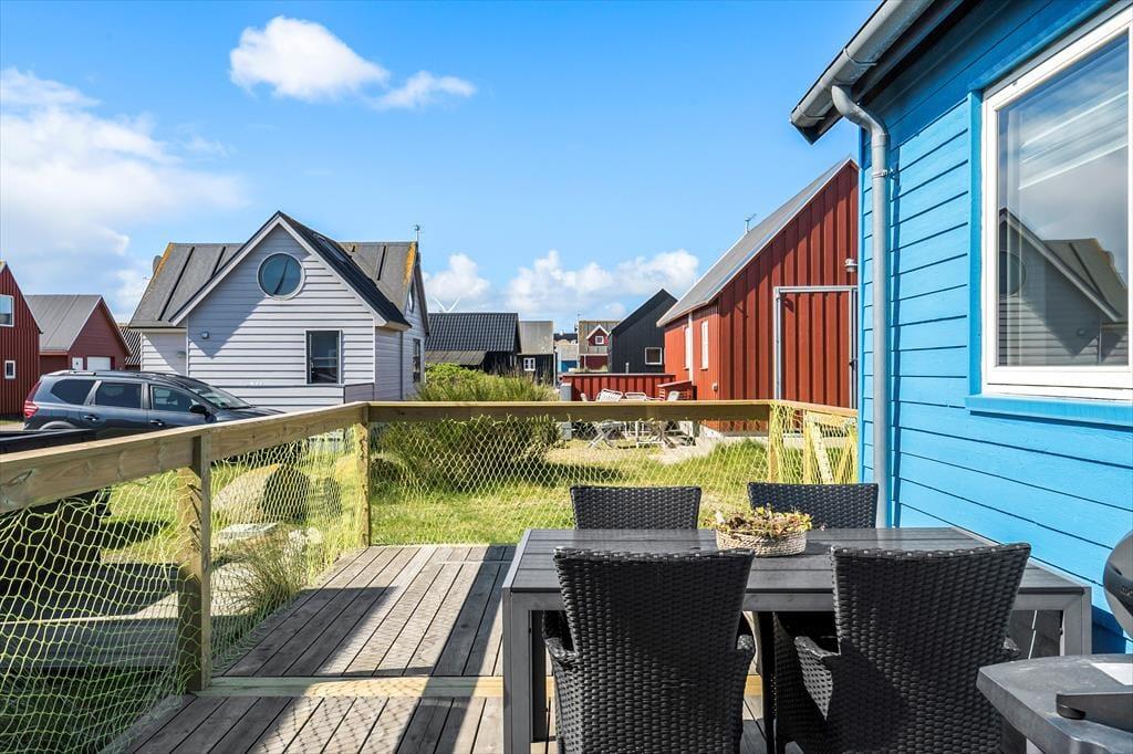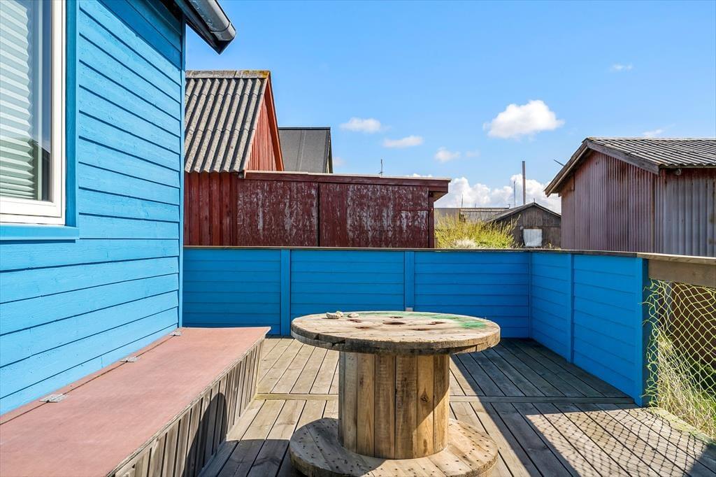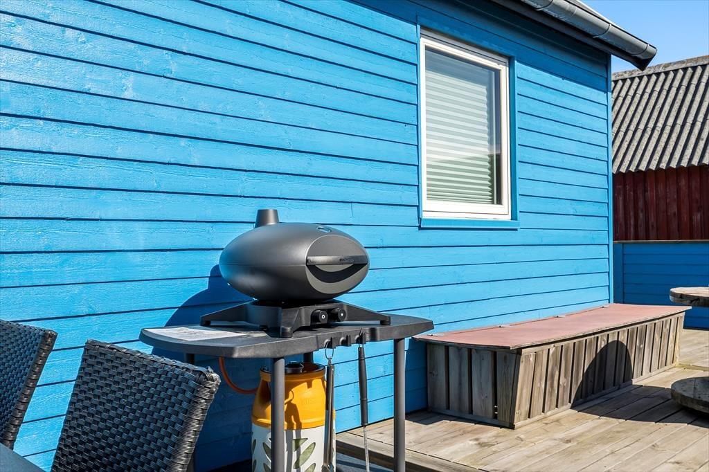 Eine 30 m² große Holzterrasse erstreckt sich entlang der Süd- und Ostseite des Ferienhauses. Zu jeder Tageszeit werden Sie hier einen schönen Aufenthaltsplatz finden. Gartenmöbel und ein Grill sind vorhanden. Den abschließbaren Abstellraum können Sie beispielsweise zum Lagern Ihrer Angel- oder Surfausrüstung nutzen.
