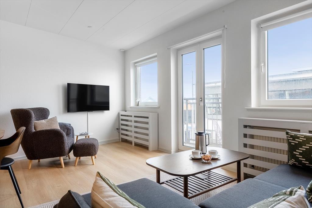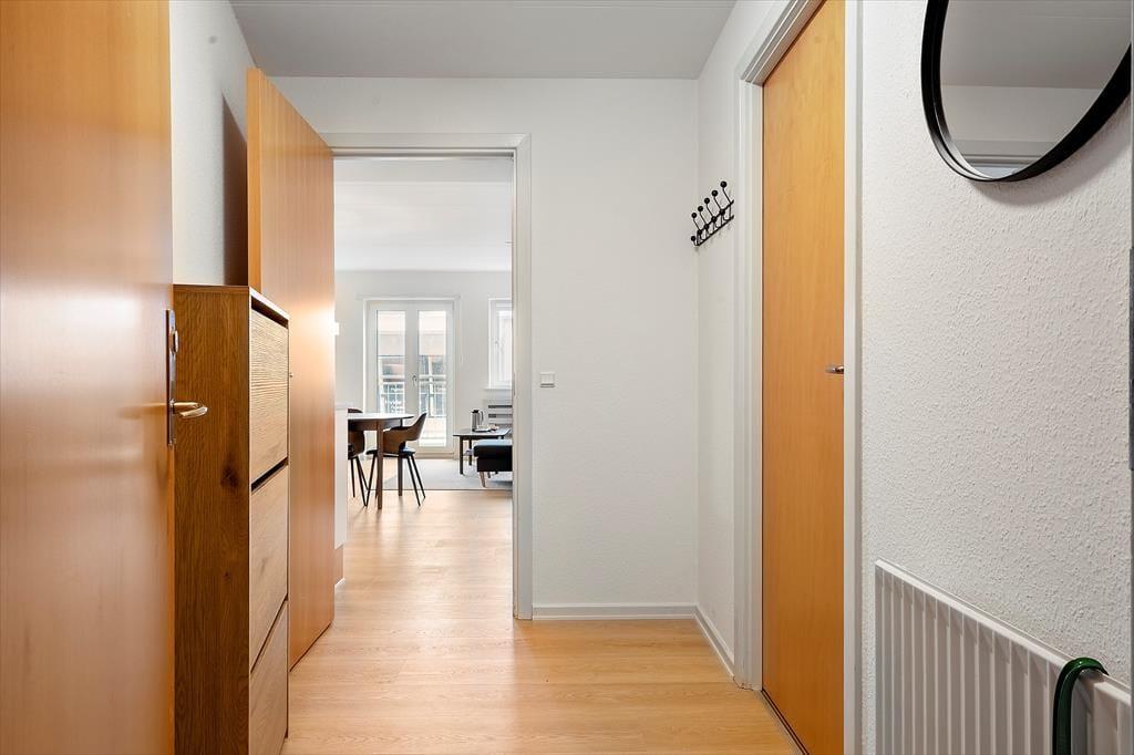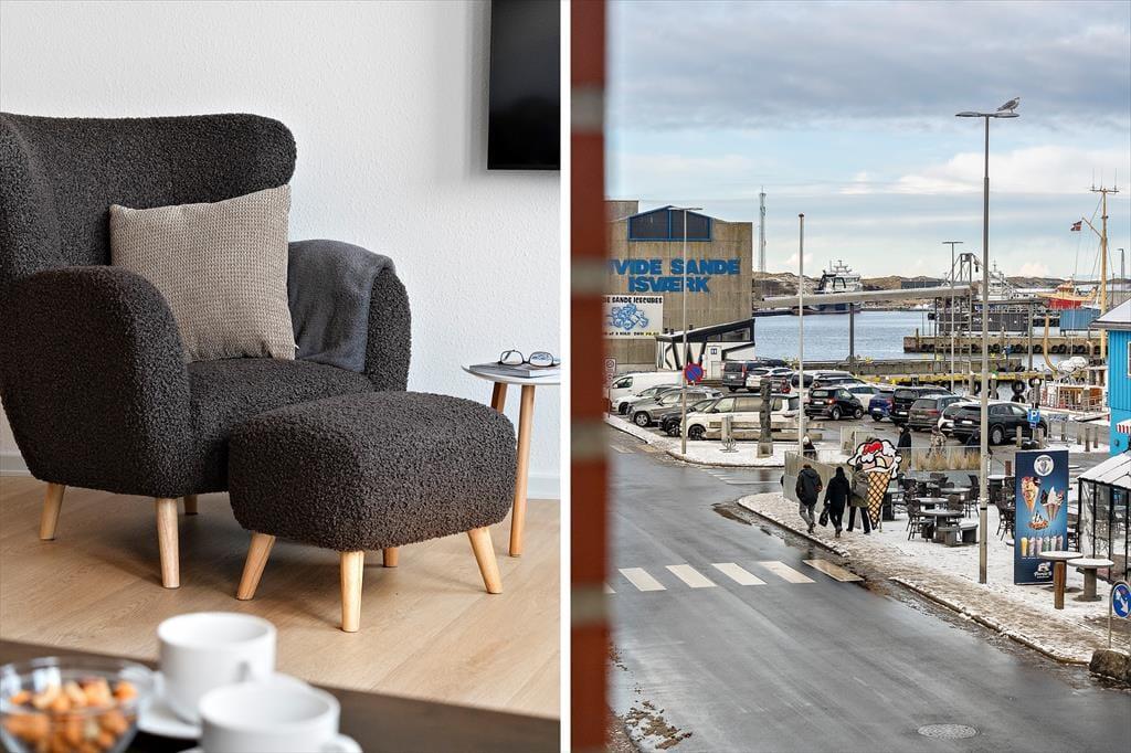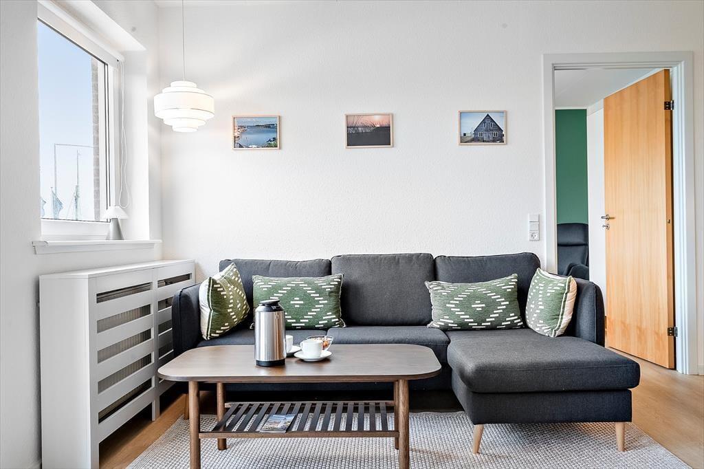 Die Wohnung befindet sich im ersten Stock eines Hauses mit Aufzug – ein komfortables Detail, das die Anreise mit Gepäck oder Einkäufen erleichtert. Innen empfängt euch eine helle und freundliche Einrichtung. Das Wohnzimmer bildet das Herzstück der Wohnung und lädt dazu ein, es sich auf dem Sofa bei einem Film oder geselligem Beisammensein gemütlich zu machen, während der Esstisch Platz für gemeinsame Mahlzeiten bietet. Die funktionale Küche ermöglicht es euch, frische Gerichte aus dem Fang des Tages oder regionalen Zutaten zuzubereiten. Das großzügige Schlafzimmer sorgt für erholsame Nächte, und im Wohnzimmer können zwei Personen auf dem Schlafsofa übernachten – ideal, wenn ihr zu mehreren reist. Das Badezimmer ist praktisch mit Dusche ausgestattet, und auch eine Waschmaschine steht euch hier zur Verfügung. Von der Wohnung aus könnt ihr über den Hafen blicken und das charmante Treiben am Kai beobachten – eine ganz besondere Stimmung, die man nur in Hvide Sande findet.