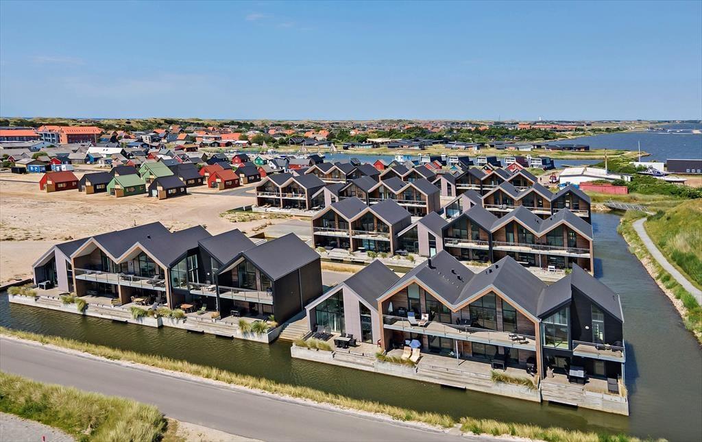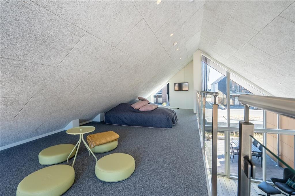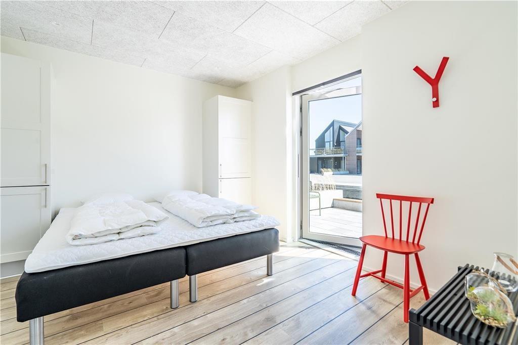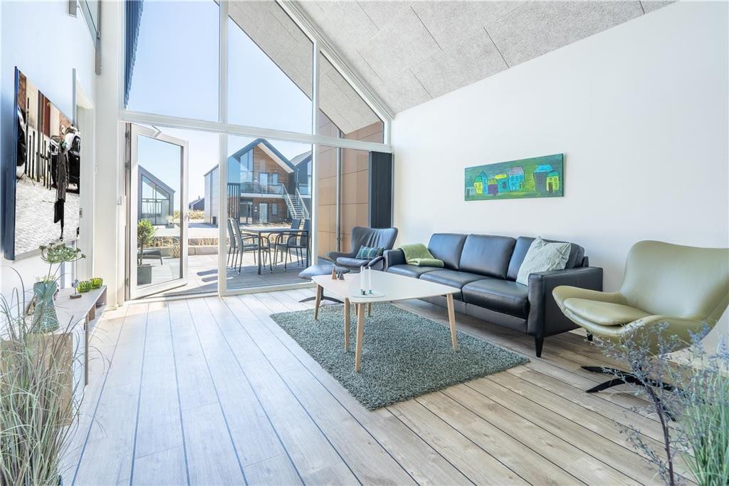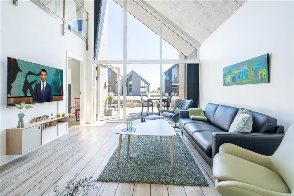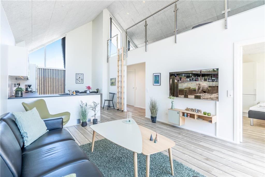 Konkreter ist hier die Rede von einem Reihenhaus, das Teil des von Architekten entworfenen Gebäudekomplexes Langsand Langs Vand ist. Hier hat jede Ferienwohnung einen eigenen Charakter, und das gilt auch hier in der Wohnung Nr. 108, die auf 74 m² sehr ansprechend für vier Personen eingerichtet ist. Innen ist die Atmosphäre hell und leicht - unter anderem in den zwei Schlafzimmern und dem Badezimmer, das mit Fußbodenheizung, Dusche und Waschmaschinen-Trockner-Kombigerät ausgestattet ist. Das Wohnzimmer ist jedoch der Raum, der mit seinen großen Fensterflächen und der schönen Deckenhöhe am meisten beeindruckt. Eine Leiter führt hinauf zu einem gemütlichen Schlafboden, wo Sie sich mit einem guten Buch entspannen können, wenn Sie nicht einfach in der Sofaecke die Füße hochlegen wollen.