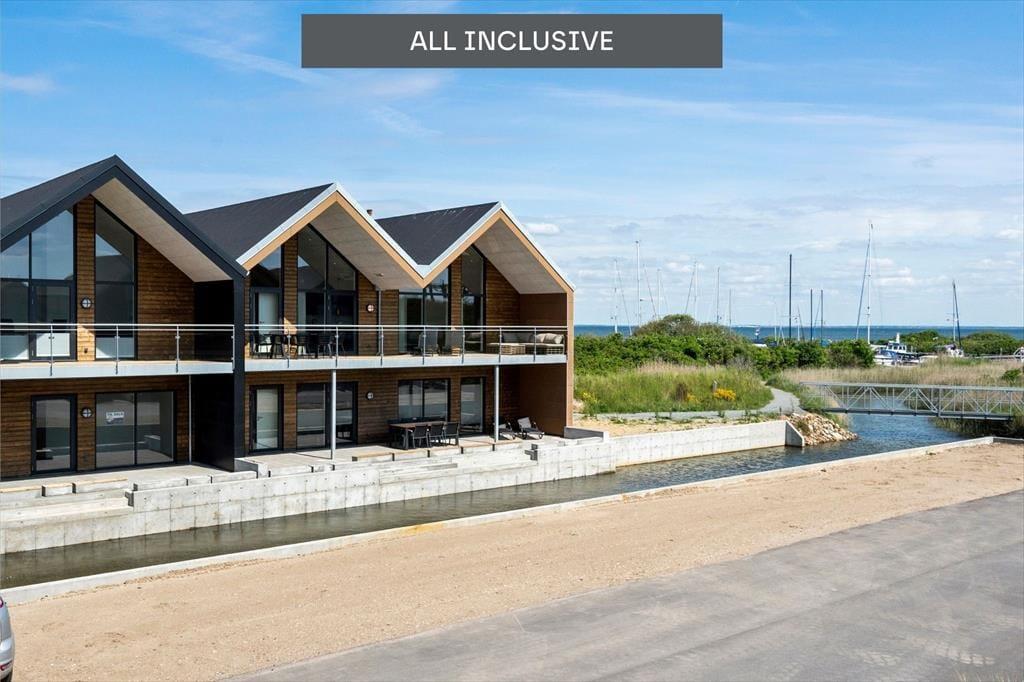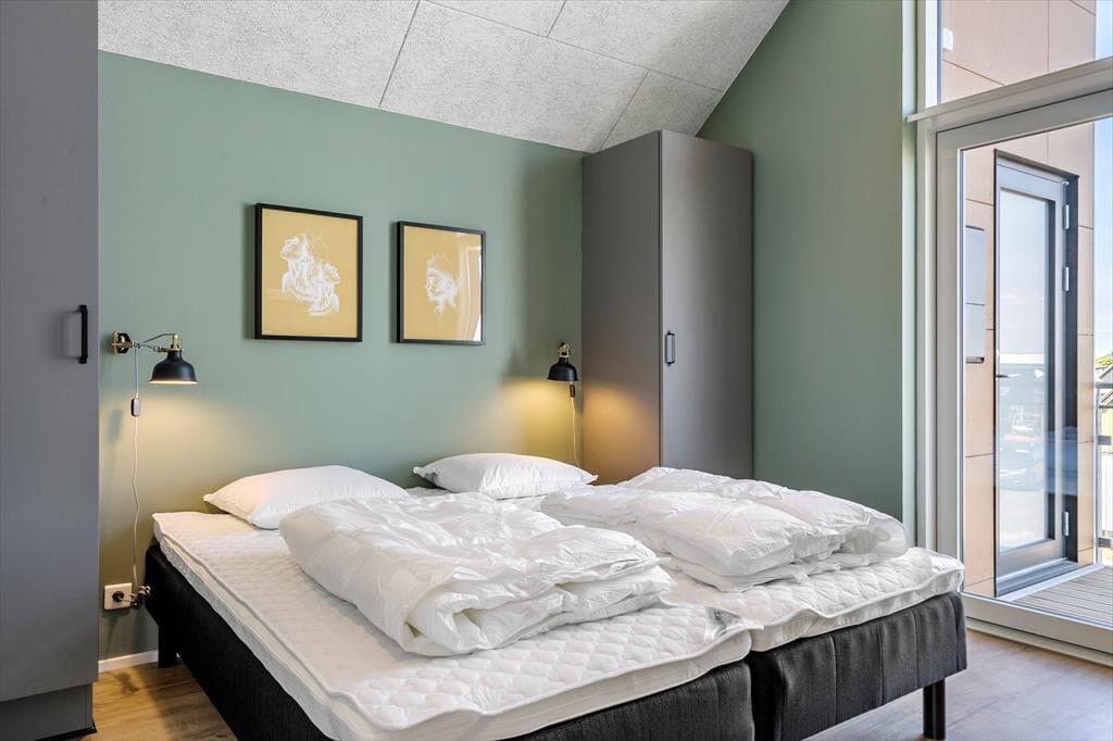 Die Ferienwohnung befindet sich im ersten Stock eines architektengezeichneten Wohnkomplexes aus dem Jahr 2022, genauer gesagt an dessen nordöstlichem Ende. Die bedeutet, dass Sie durch die Fenster an der Außenseite der Wohnung auf den Sportboothafen und den Fjord blicken. Mit diesem Blick verwöhnt nicht nur der Wohnraum, sondern auch eines der drei Schlafzimmer. Besonders während des Sonnenaufgangs ist der Ausblick ein frühes Aufstehen wert. Ein reines Vergnügen ist der Aufenthalt im Wohnraum, der mit seiner tollen Deckenhöhe, den großen Fensterpartien und der stilvollen Einrichtung zu überzeugen weiß. Die offene Küche bietet Ihnen alles, was Sie zum Kreieren köstlicher Urlaubsmahlzeiten benötigen. Die Mahlzeiten servieren Sie im Anschluss am schönen Esstisch oder auf dem angrenzenden Balkon. Entspannte Stunden verspricht die Polstersitzgarnitur und der Flachbildschirm mit Apple-TV. Zur Wohnfläche zählen darüber hinaus zwei attraktive Badezimmer, die ebenso wie der Rest der Wohnung über eine Fußbodenheizung verfügen.