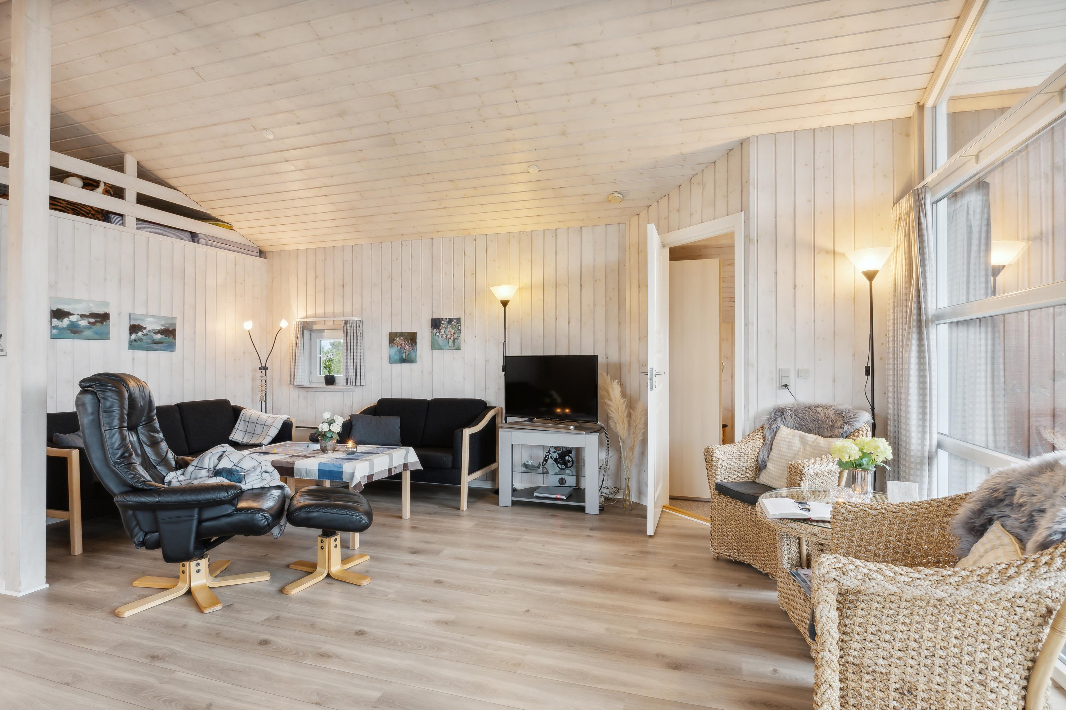 Hier finden Sie alles, was Sie für einen erholsamen Urlaub brauchen. Die offene und funktionale Küche macht das Kochen zu einem Vergnügen, während der Rest der Familie vor dem Fernseher entspannen, ein gutes Buch im Sessel lesen oder Gesellschaftsspiele am Esstisch spielen kann. Nach dem Abendessen übernimmt die Spülmaschine den Abwasch, während Sie einige entspannende Stunden im warmen Whirlpool oder in der Sauna genießen.