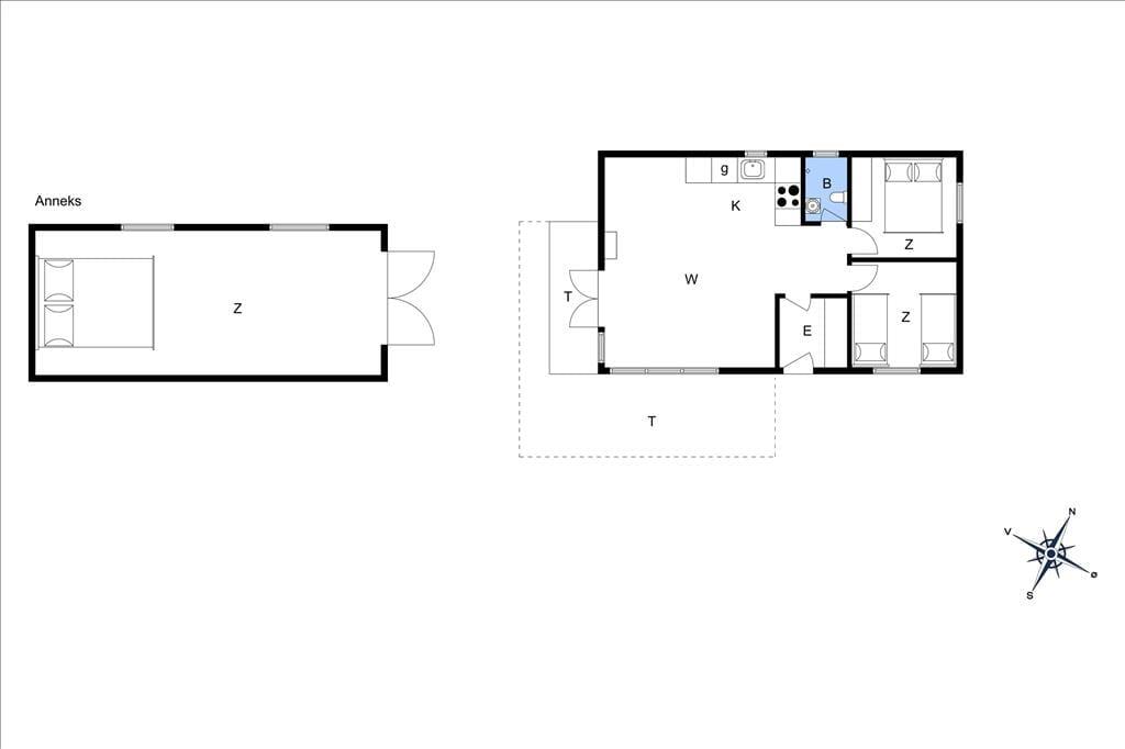 Das Ferienhaus begrüßt Sie mit zwei guten Schlafzimmern, von denen eines mit einem Doppelbett und das andere mit zwei Einzelbetten samt ausreichend Schrankfläche ausgestattet ist. Im Wohnraum sorgt ein Fernseher mit Chromecast dafür, das Sie selbst im Urlaub Ihre Lieblingsserien streamen können. Die Küche fügt sich praktischerweise offen in den Wohnraum ein. Vom Wohnraum aus genießen Sie direkten Zugang zur gemütlichen, überdachten Terrasse, auf der Sie wunderbar grillen und es sich entspannt auf den Gartenmöbeln gemütlich machen können. Während Sie sich auf der Terrasse in vollen Zügen erholen und entspannen, beobachten Sie Ihre Kinder, die vergnügt im großen Garten und im gemütlichen Spielhaus spielen oder auf das Fußballtor schießen. Das Annex enthällt ein Dobbeltbett und TV.