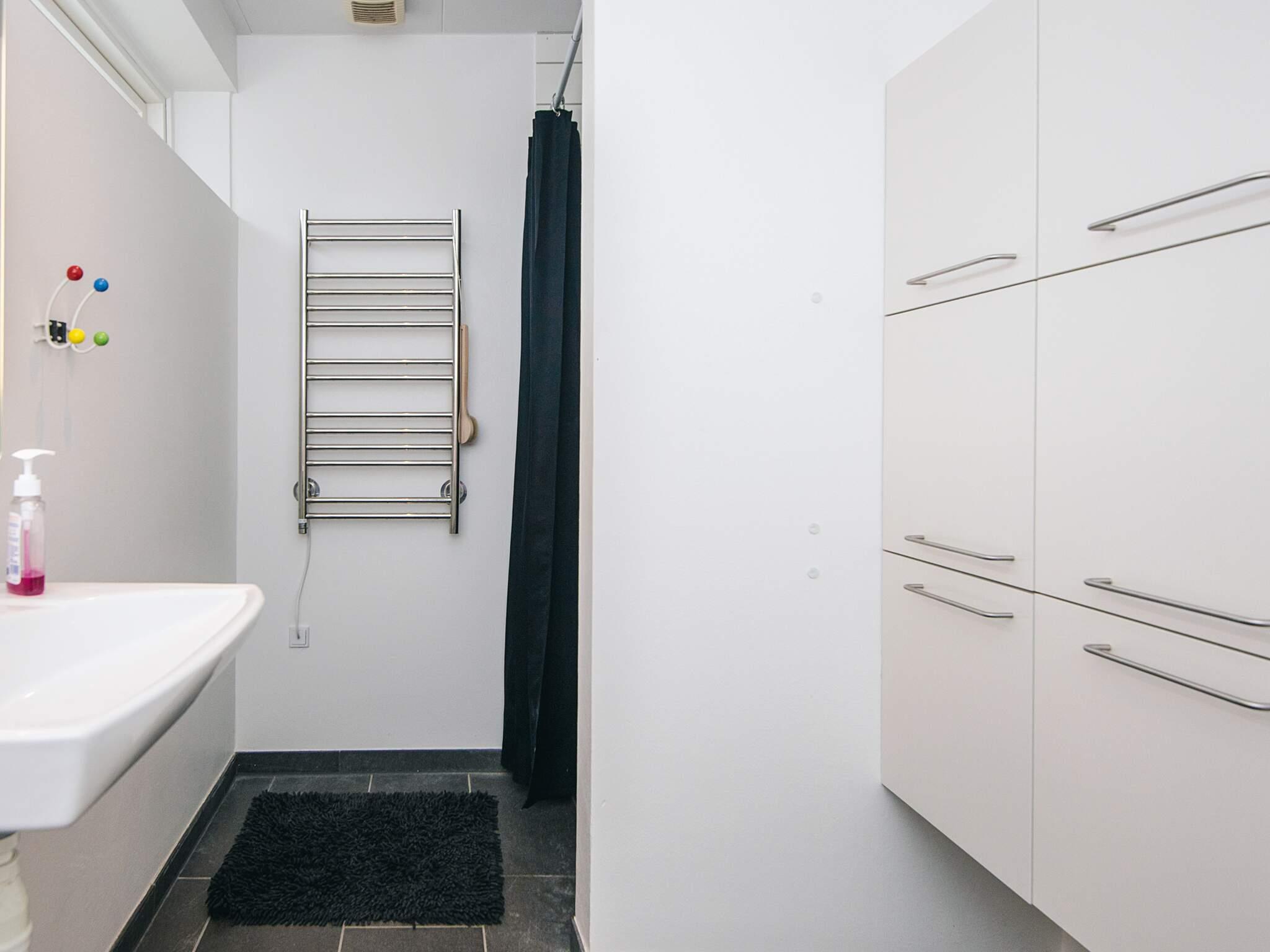 Im Erdgeschoss befinden sich außerdem ein großes Schlafzimmer mit Doppelbett und ein Badezimmer mit Toilette, Waschbecken, geräumiger Duschkabine, Handtuchtrockner, Waschmaschine und Trockner. Die großen Fenster im Erdgeschoss sind mit fernbedienbaren Lamellenjalousien/Rollläden ausgestattet.