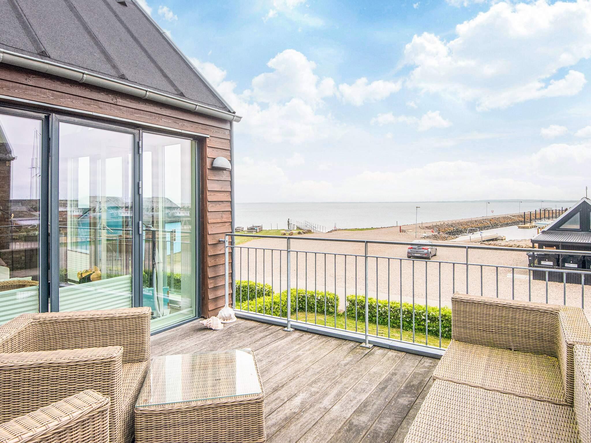 Das Ferienhaus ist modern und farbenfroh eingerichtet. Im Erdgeschoss befinden sich Eingangsbereich und Flur, die zum Wohnküchenbereich hin offen sind. Die Küche ist gut ausgestattet und verfügt unter anderem über einen 60-Liter-Gefrierschrank. Von hier aus haben Sie einen Blick auf das Wasser. Angrenzend an die Küche befinden sich ein Essbereich und ein Schlafsofa für zwei Personen. Ein Fernseher mit Chromecast zum Streamen Ihrer eigenen Inhalte ist vorhanden. Von der Küche aus führt eine Terrassentür auf die Terrasse vor dem Haus.