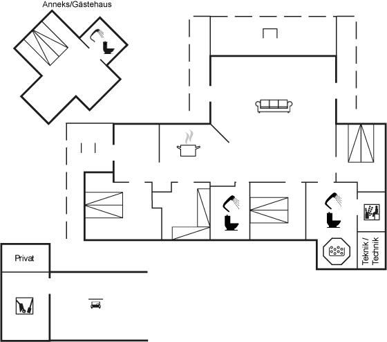 Im Haus finden Sie einen großen Hauswirtschaftsraum mit viel Platz für Schuhe und Jacken sowie Waschbecken, Waschmaschine und Wäschetrockner. Das Haus verfügt über 2 Badezimmer; 1 großes mit einem schönen 6-Pers.-Whirlpool (Standwasser), Duschnische und direktem Zugang zur Sauna des Hauses sowie ein etwas kleineres mit Duschnische (behindertengerecht).