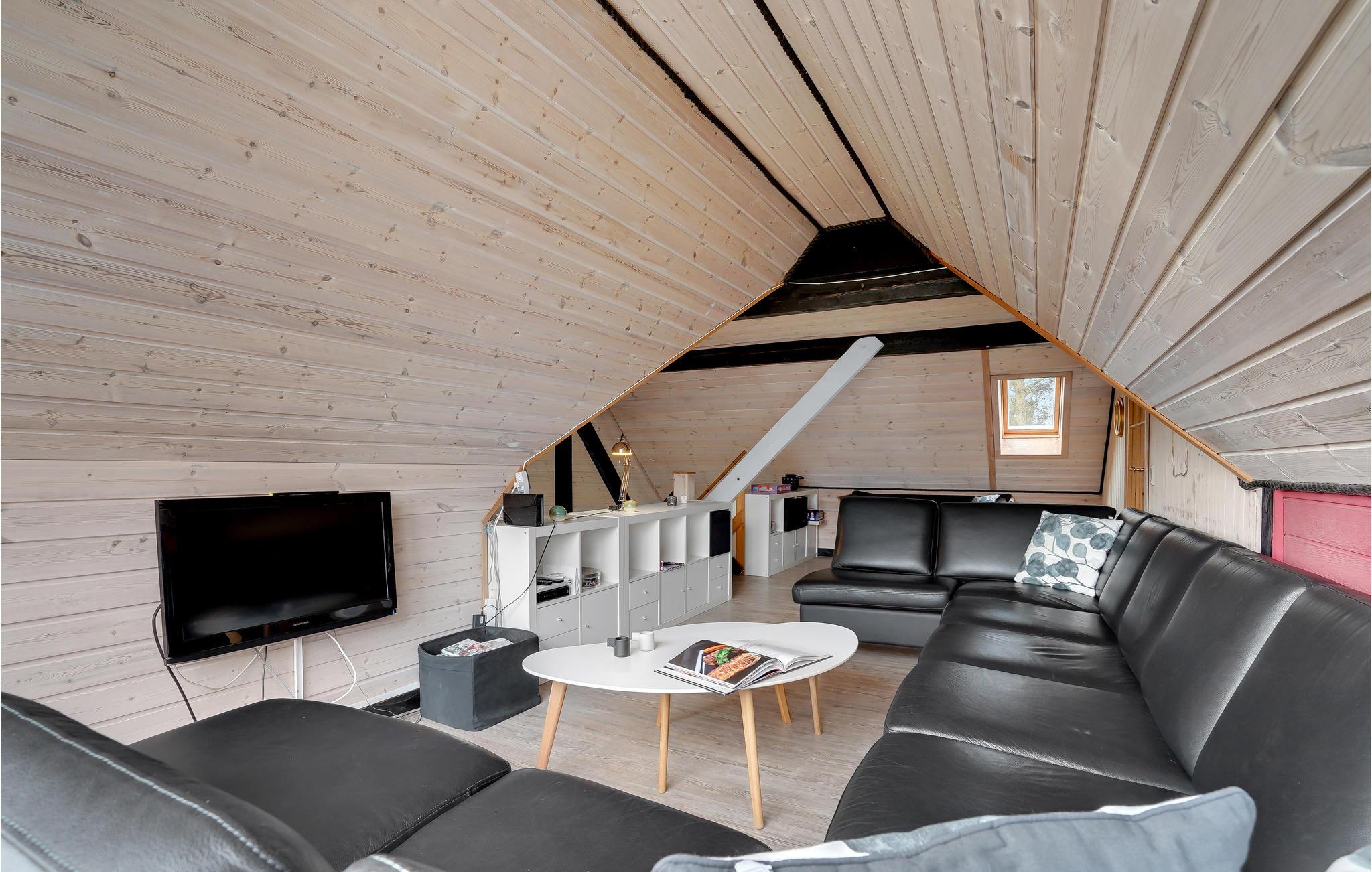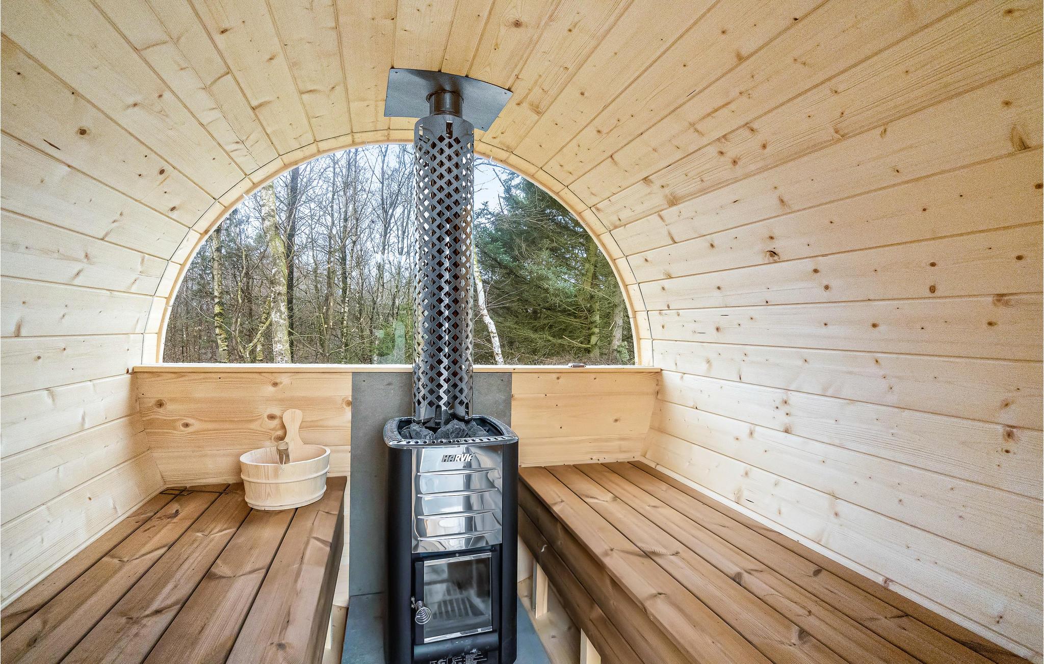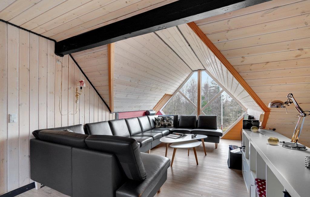 Von hier aus haben Sie Zugang zur Holzterrasse, auf der Sie in die Badetonne springen können. Im ersten Stock, wo auch das Schlafzimmer liegt, ist ein gemütlicher Aufenthaltsraum mit großem Panoramafenster.