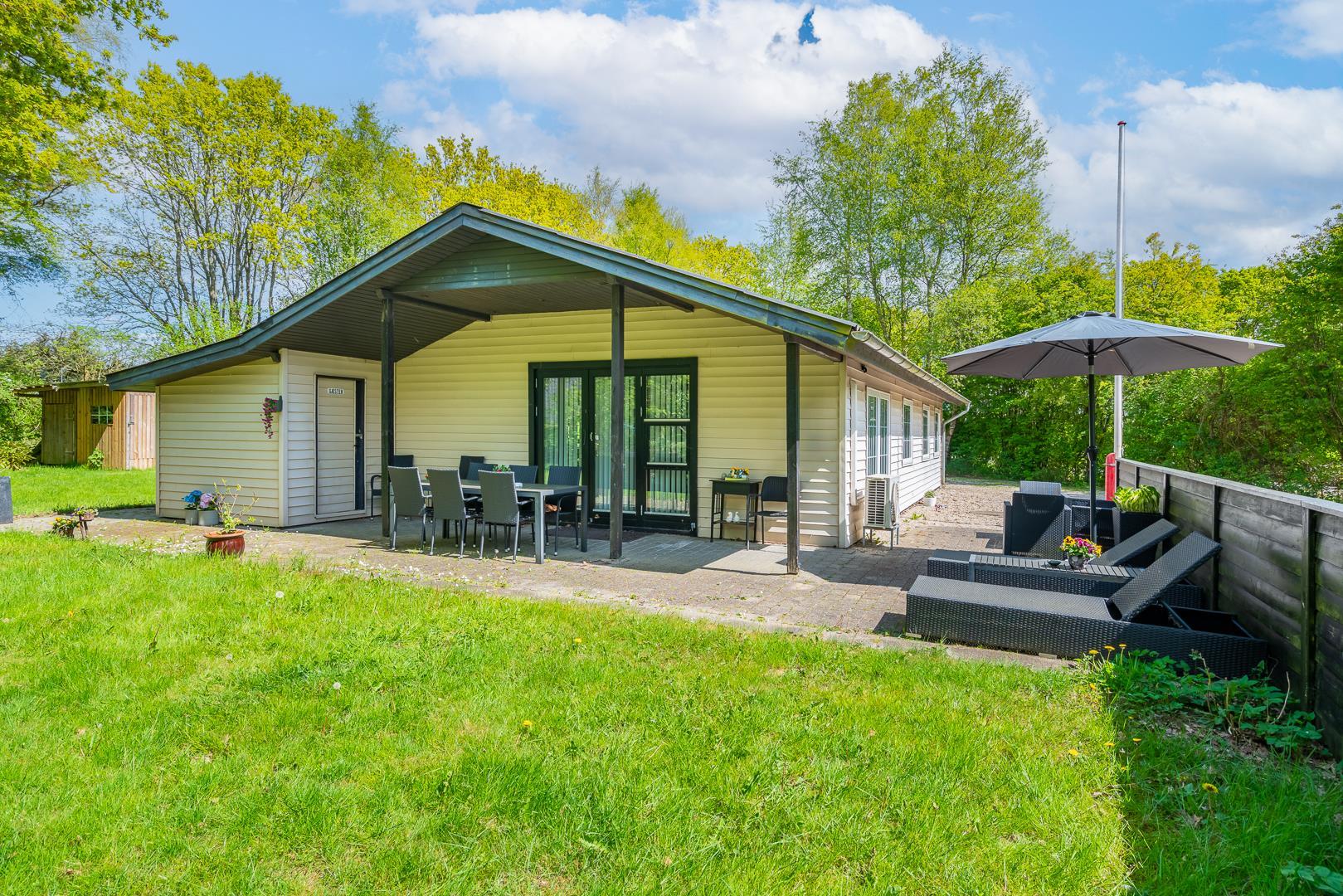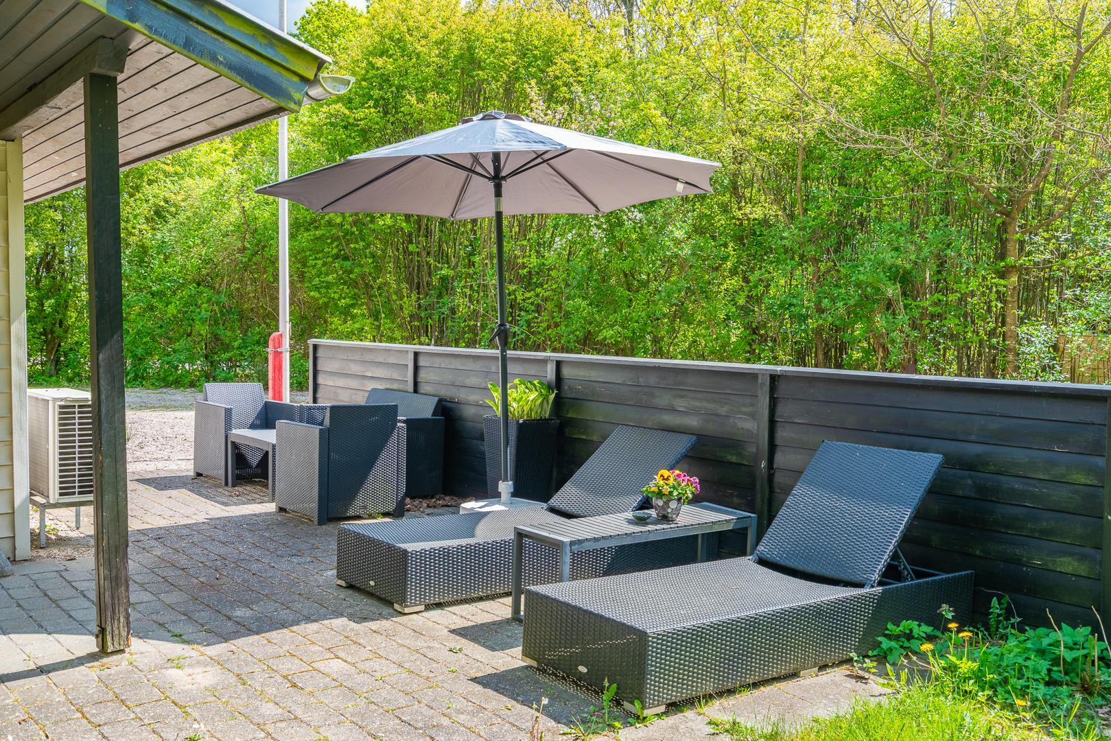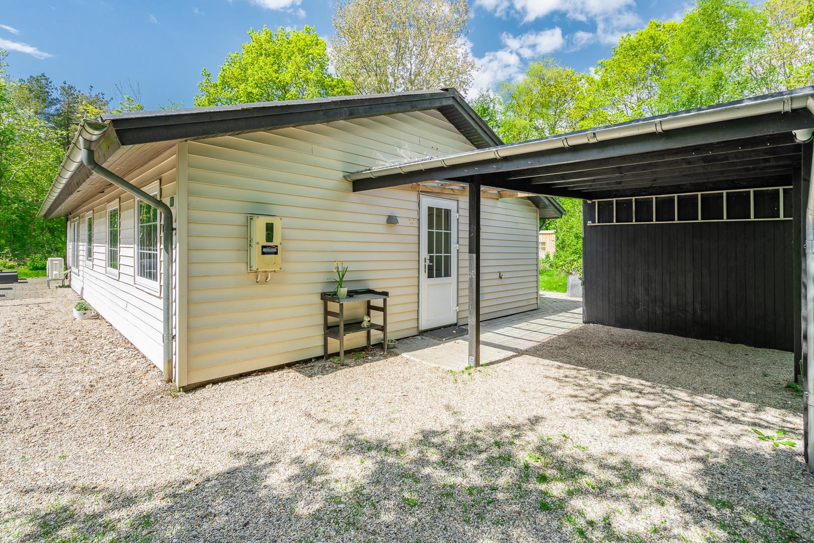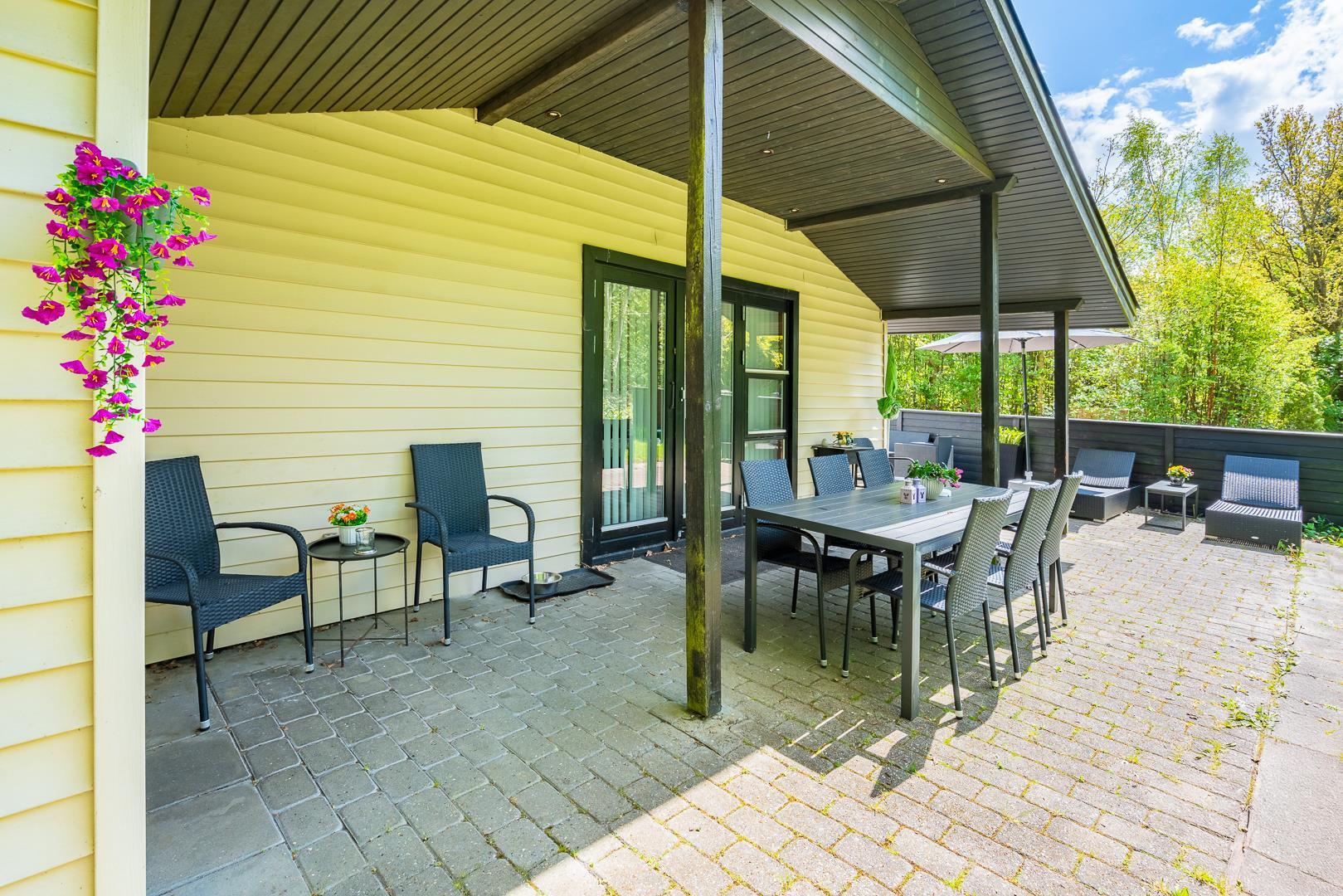 Ein Carport sorgt für Schutz eures Autos, und die große Terrasse mit Gartenmöbeln lädt zum Sonnen, Grillen oder einfach nur Entspannen ein.