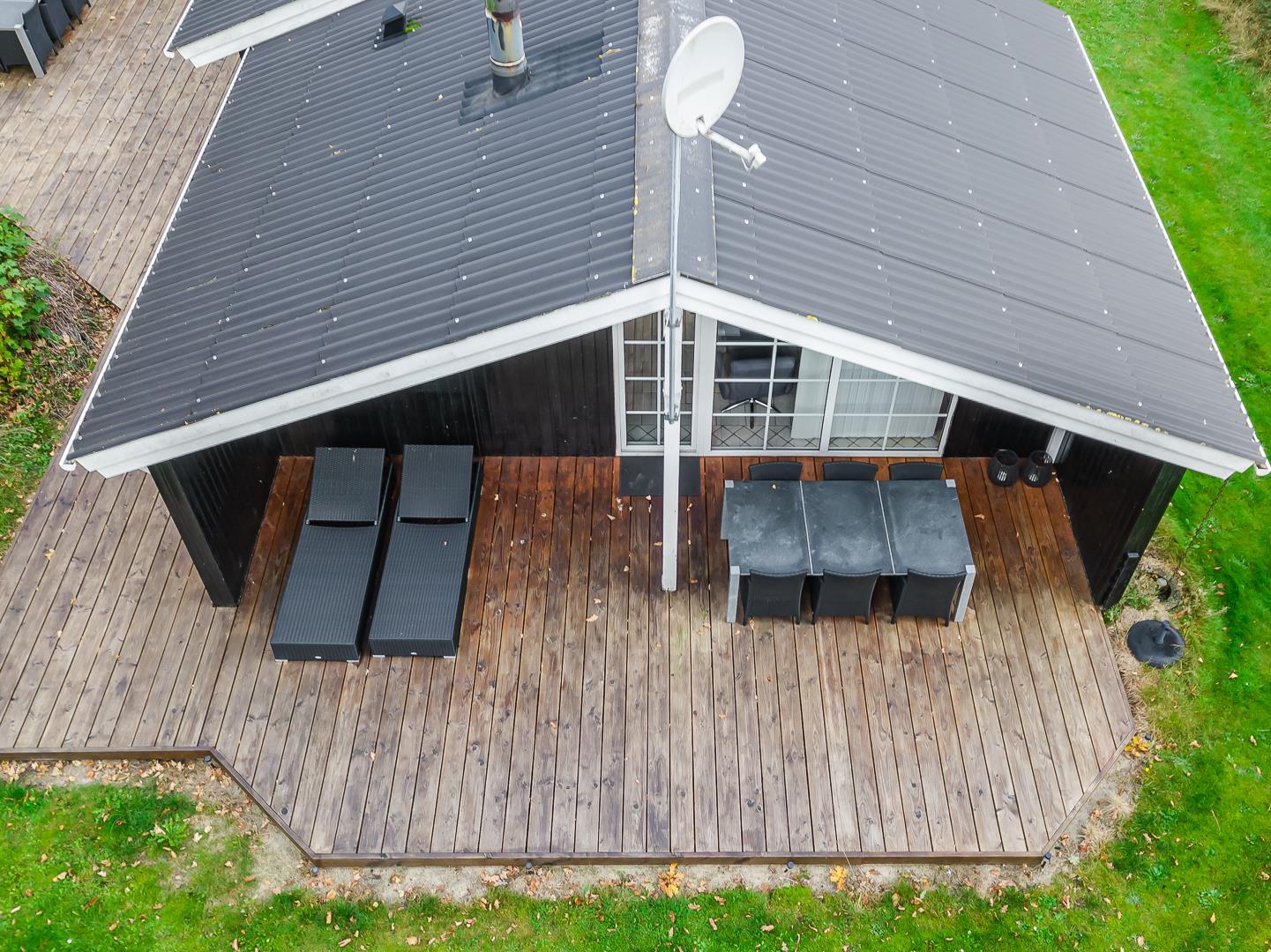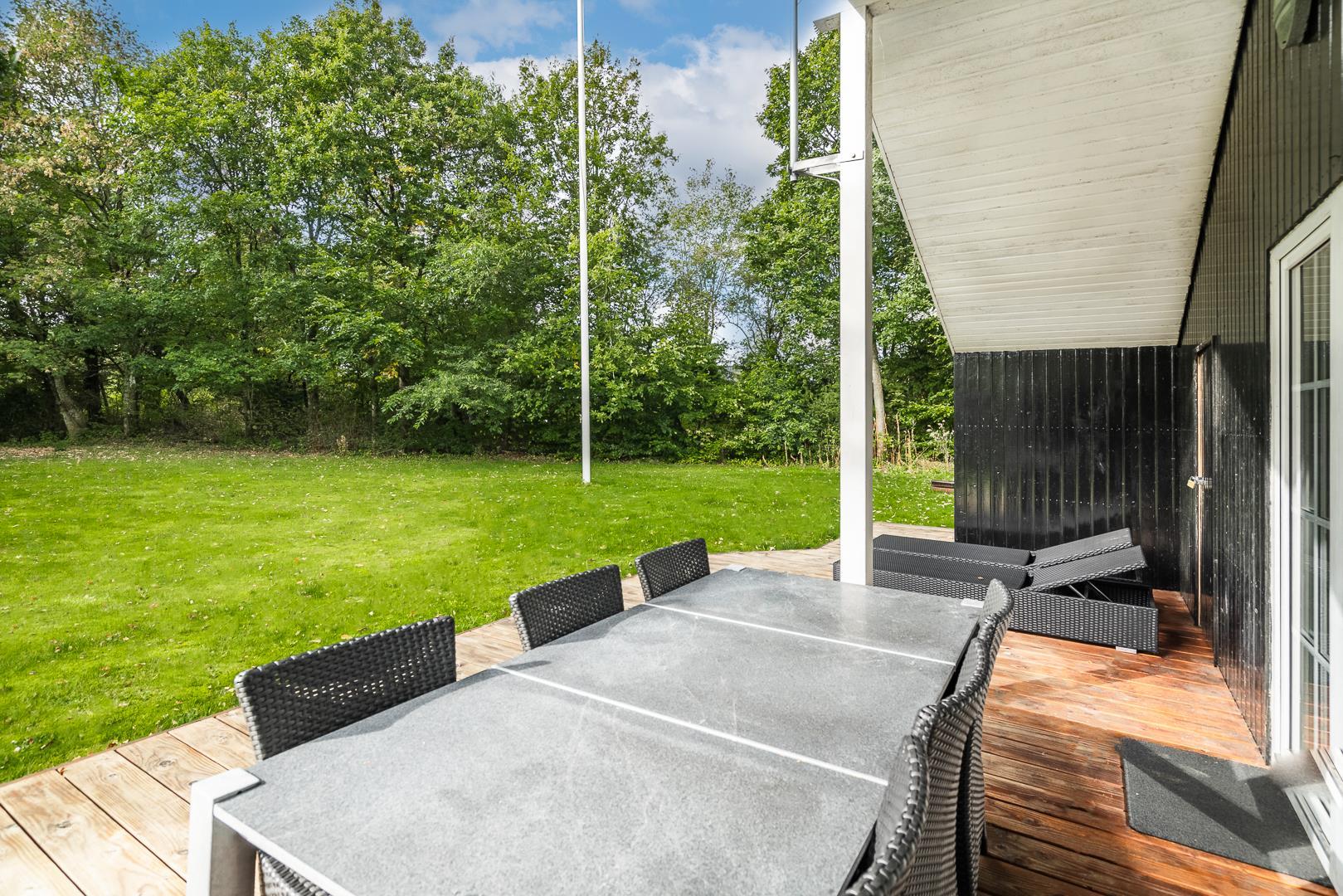 Der Außenbereich des Ferienhauses Nøddehaven 60 in Jegum Ferieland ist wie gemacht für einen gemütlichen Ferienhausurlaub in Dänemark. Direkt am Ferienhaus wartet eine überdachte Terrasse, auf der du windgeschützt frühstücken oder lange Sommerabende genießen kannst. Auch bei typisch dänischem Wetter sitzt du hier trocken und kannst trotzdem die frische Luft genießen – ideal für Familien, Paare und Freunde, die ihren Urlaub gerne draußen verbringen.