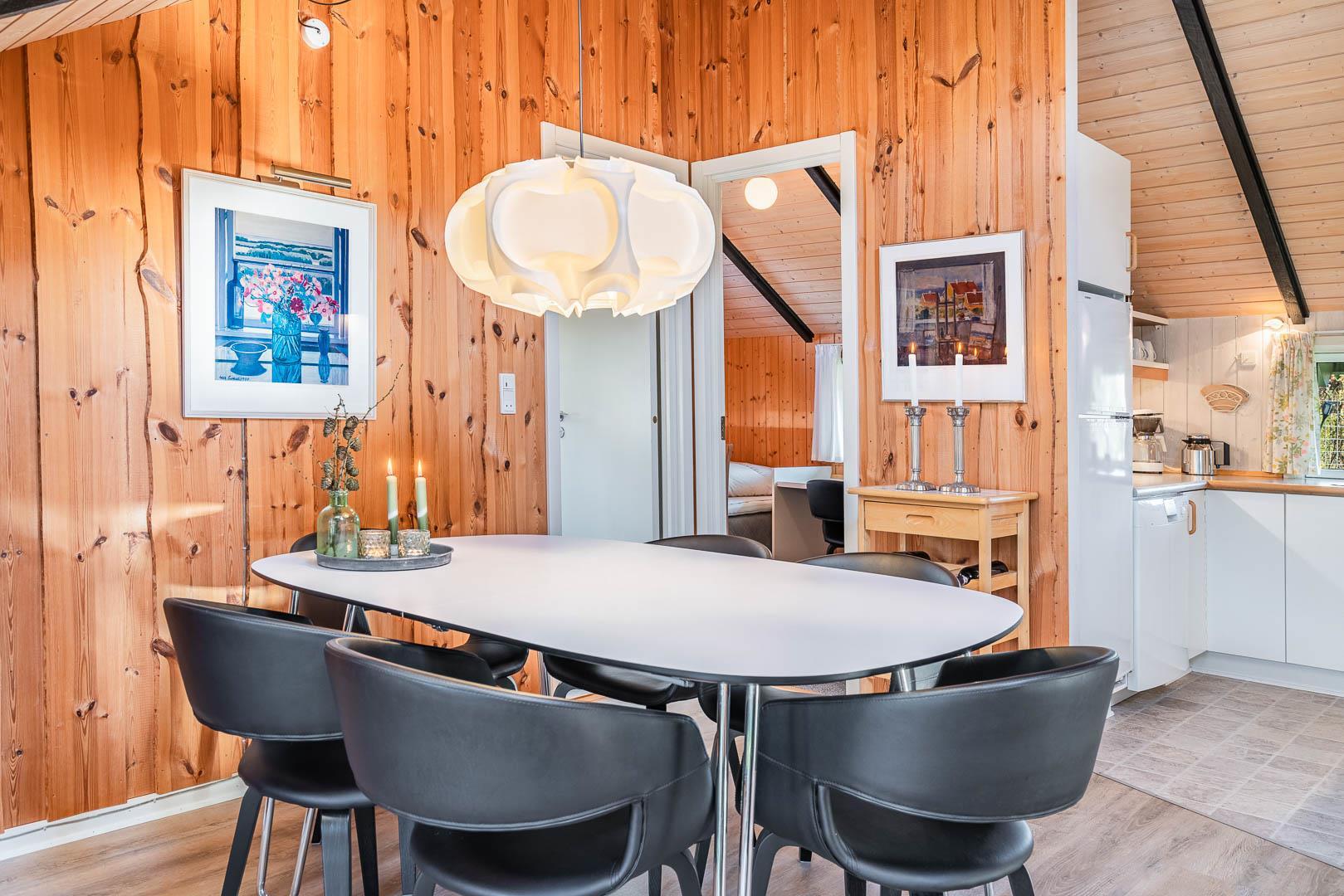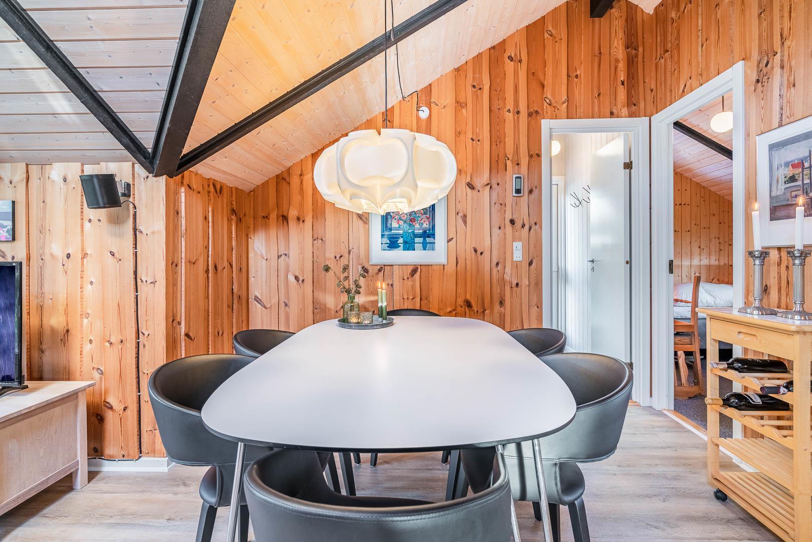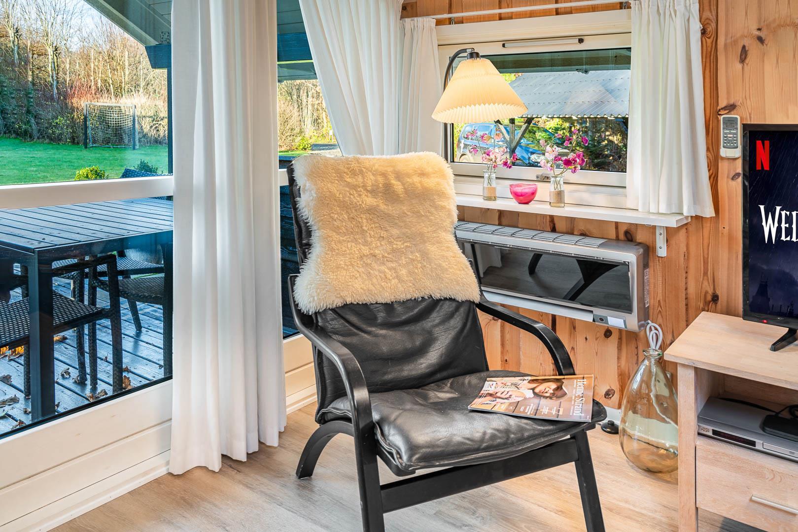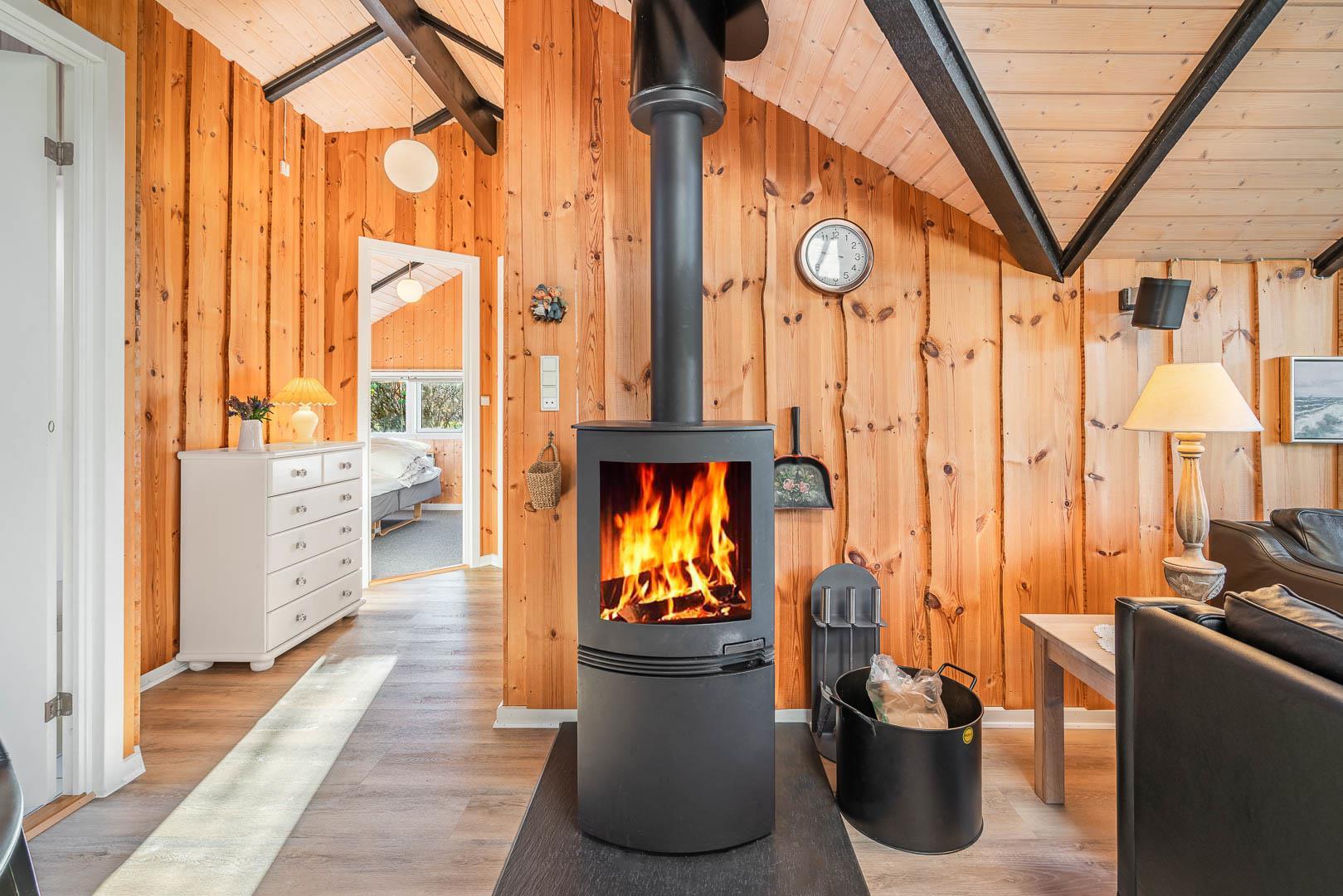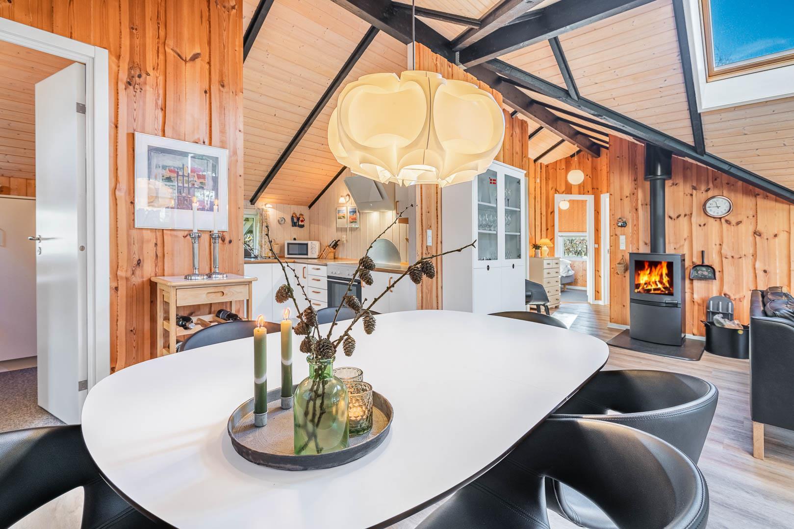 Der Wohnbereich ist großzügig geschnitten und bildet gemeinsam mit Küche und Essplatz einen zentralen Treffpunkt. Hier wird gelesen, gespielt, gekocht und gelacht. Der Kamin sorgt dabei nicht nur für Wärme, sondern auch für eine ruhige, entspannte Stimmung – ideal für lange Abende, wenn draußen der Wind durch die Bäume zieht. Unterstützt wird das angenehme Raumklima durch eine moderne Wärmepumpe, die das Ferienhaus effizient und gleichmäßig beheizt.