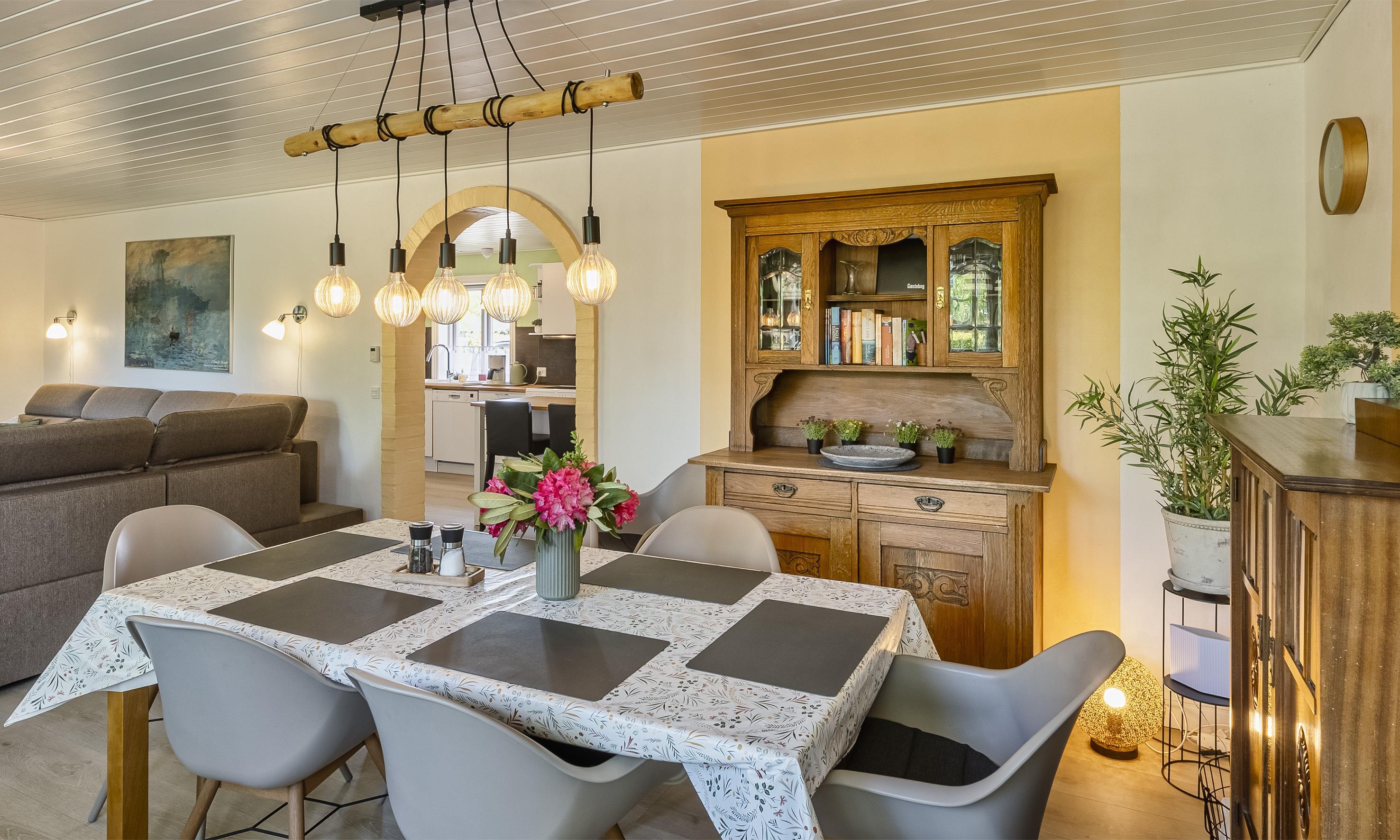 Das helle und freundlich eingerichtete Haus bietet viel Platz für Entspannung und gemeinsames Beisammensein. Der offene Grundriss und die warmen Farbtöne schaffen eine einladende Atmosphäre. Mit Kaminofen, energieeffizienter luft/wasser Wärmepumpe und komfortablen Möbeln ist das Haus ideal für gemütliche Abende nach einem erlebnisreichen Tag. Die durchdachte Ausstattung macht es perfekt für Familien und Paare.