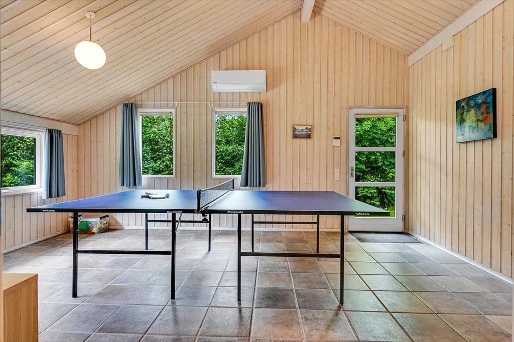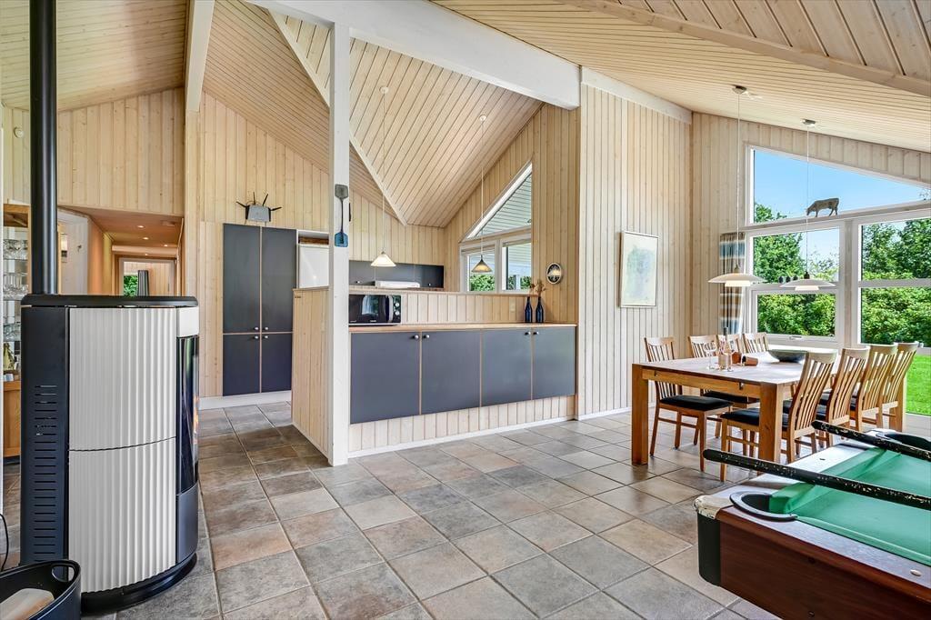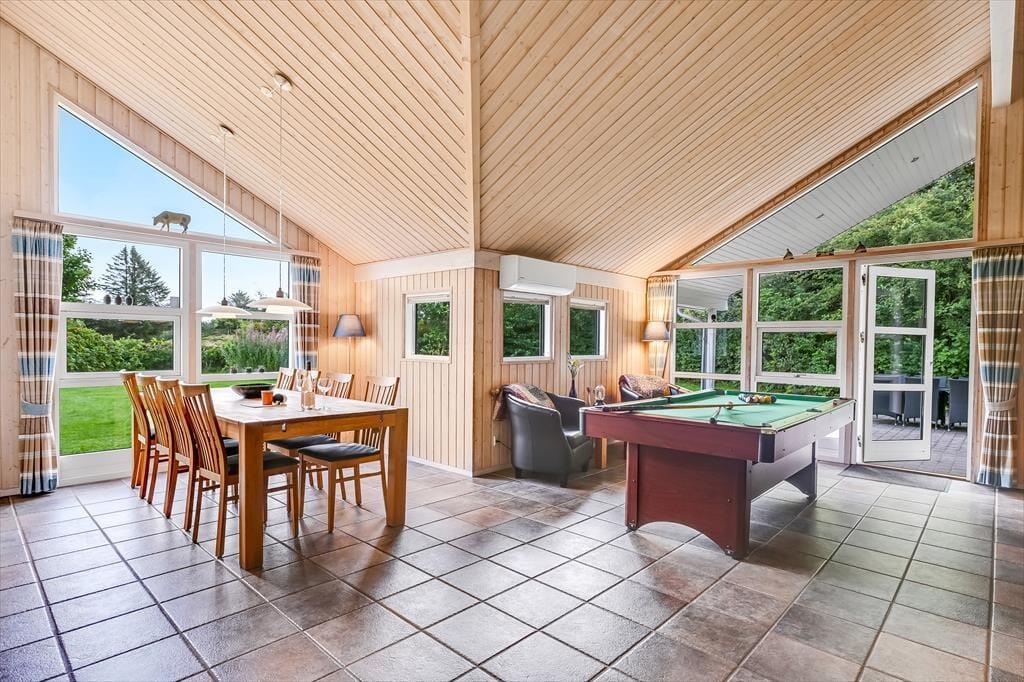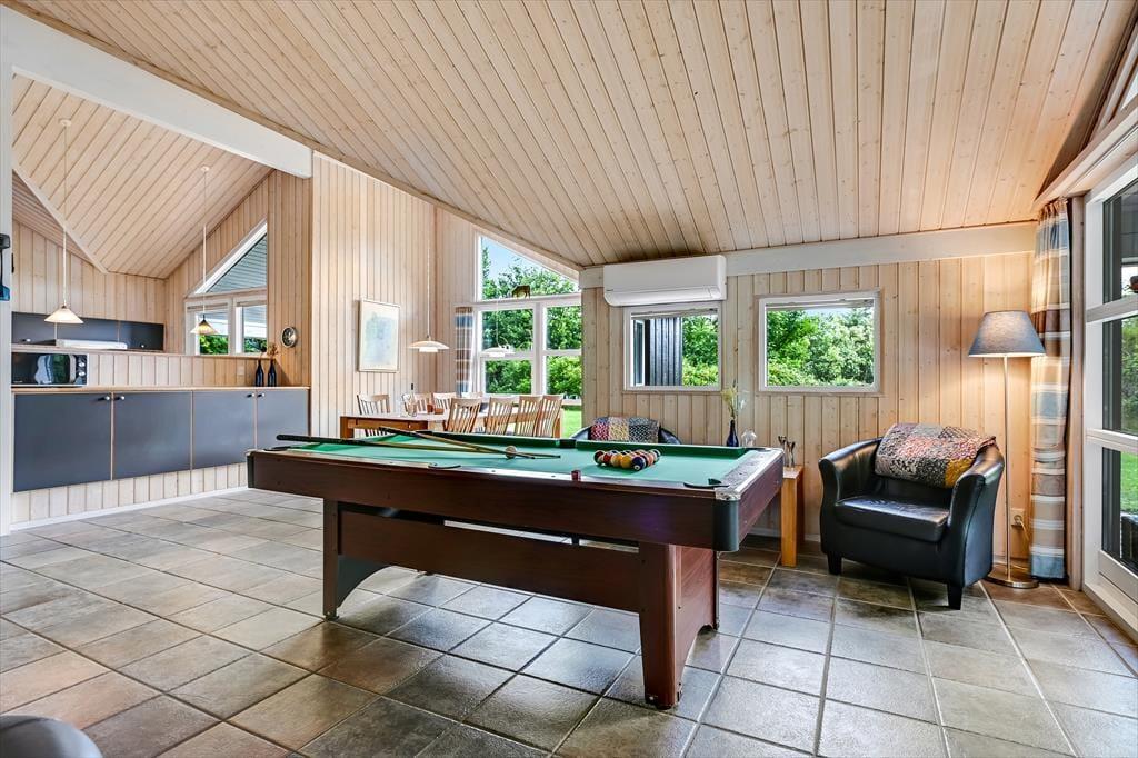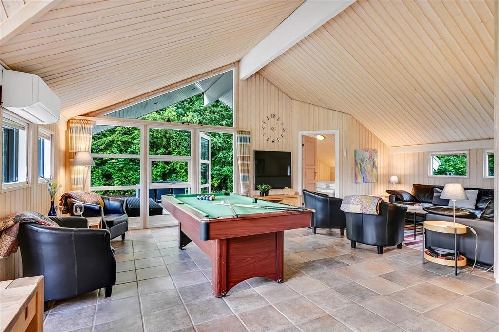 Im Inneren empfängt dich eine warme und einladende Atmosphäre, bei der sowohl Komfort als auch Gemütlichkeit in der Einrichtung berücksichtigt wurden. Im großen Wohnbereich herrscht eine offene Raumgestaltung mit hoher Decke und viel Platz, um gemeinsam Zeit zu verbringen – ob beim Kochen, Spielen oder einfach nur zum Entspannen. Im Wohnzimmer steht ein Billardtisch für freundschaftliche Duelle bereit, und im angrenzenden Aktivitätsraum könnt ihr eine Partie Tischtennis spielen, wenn ihr den Wettbewerb auf die nächste Stufe heben möchtet. Wenn es Zeit für Entspannung ist, laden Whirlpool und Sauna zu purer Selbstverwöhnung ein. Stell dir vor, wie du ins warme Wasser sinkst, während sich Ruhe um dich ausbreitet – oder wie die Wärme der Sauna die letzten Verspannungen deines Körpers löst. Zwei Wärmepumpen und ein Pelletofen sorgen jederzeit für eine angenehme Temperatur, und mit zwei Badezimmern gibt es selbst dann gute Einrichtungen, wenn die ganze Familie zusammenkommt. Hier findest du leicht Ruhe – und kannst trotzdem aktiv sein.