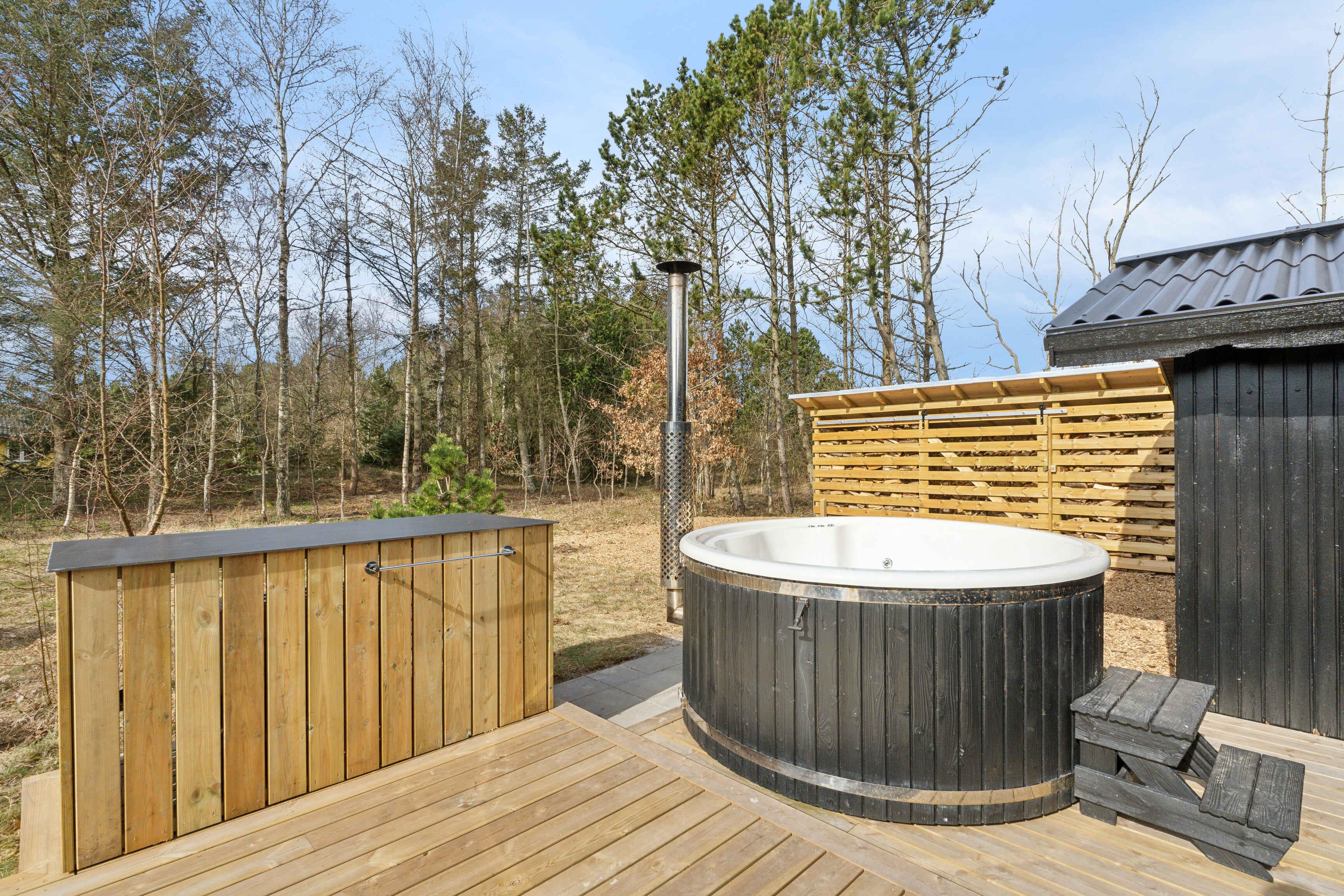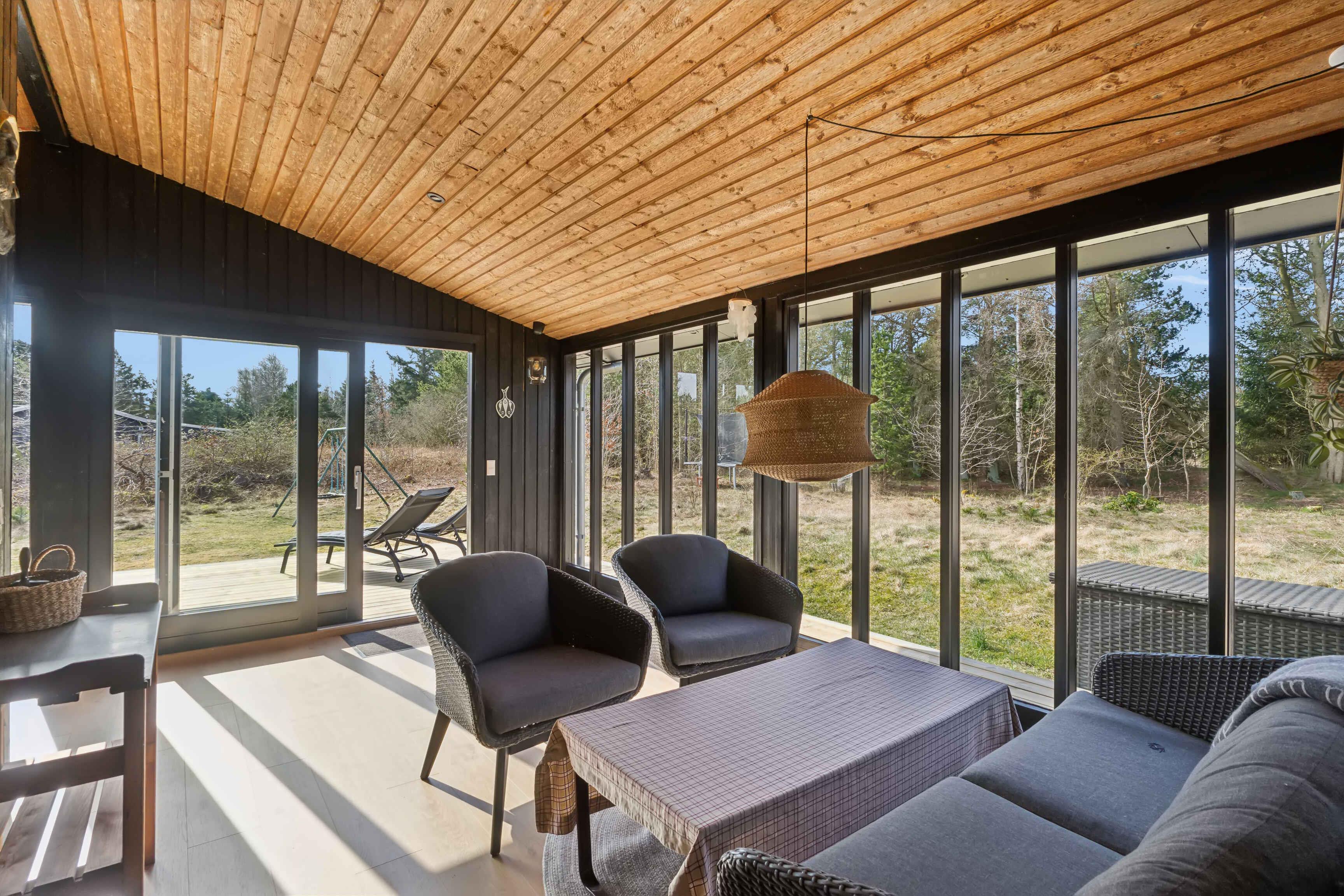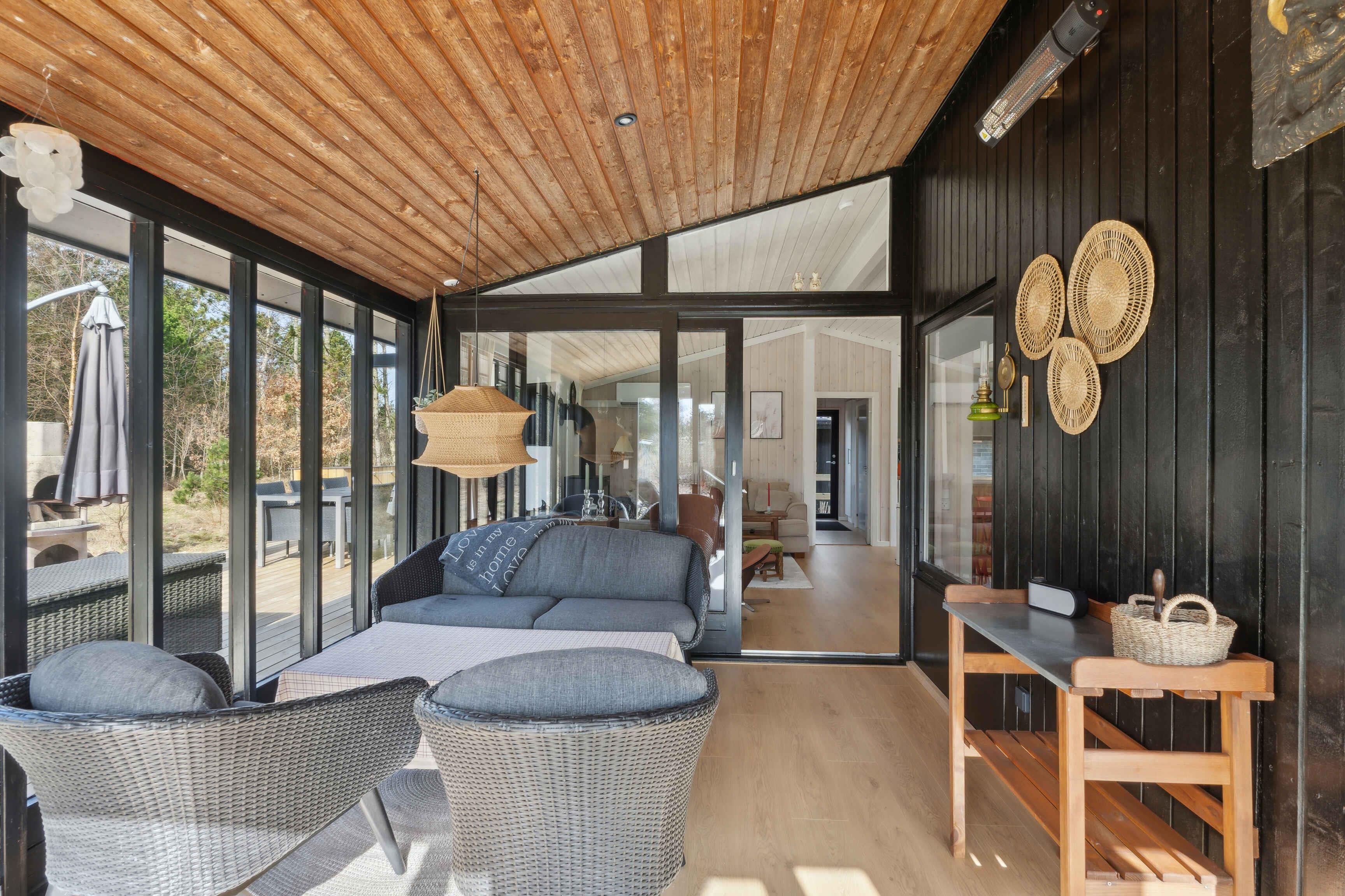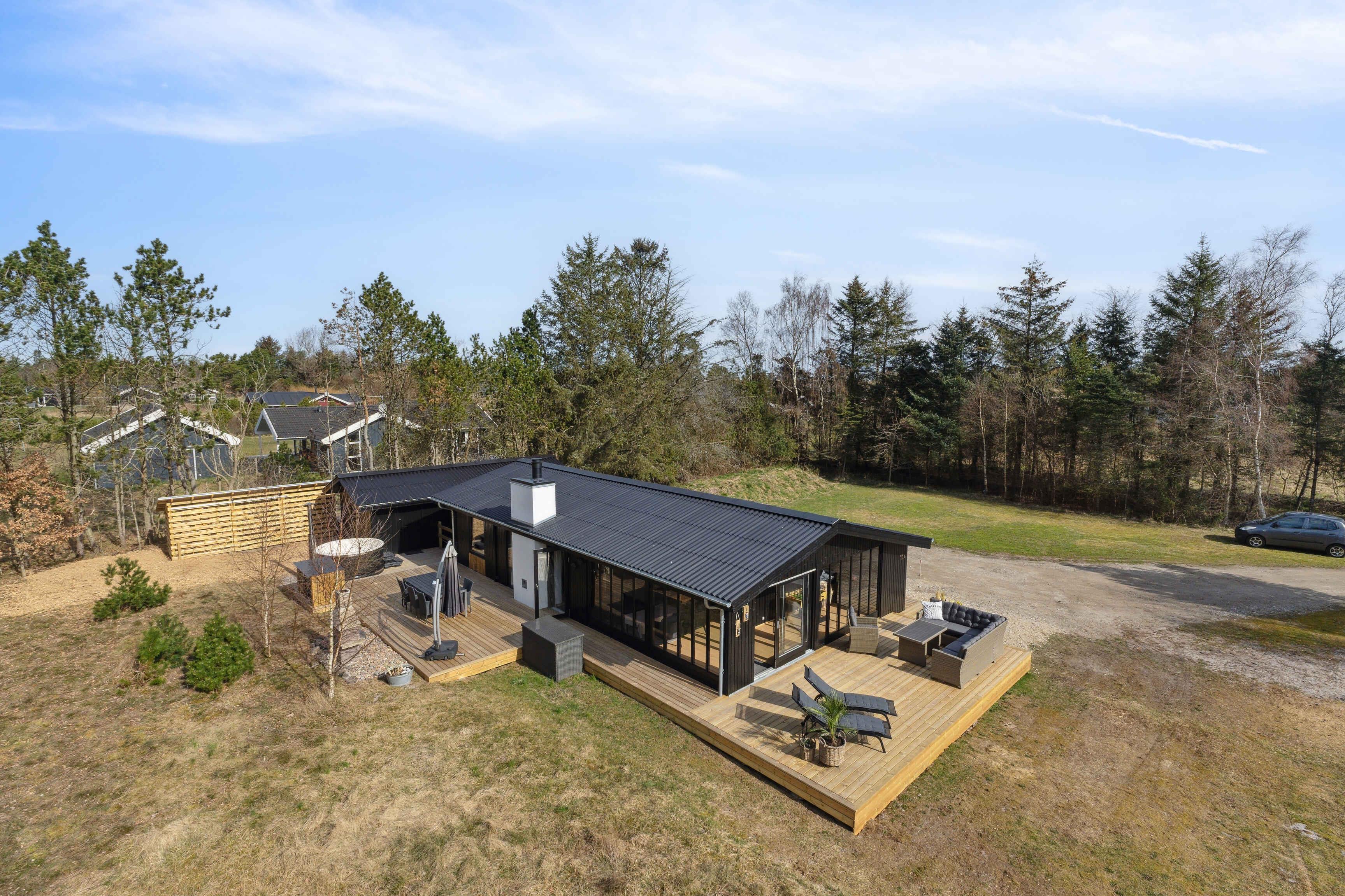 Kleines charmantes Ferienhaus mit großem Naturgrundstück, nahe einem kinderfreundlichen Strand (450-500 m). Das Grundstück ist privat, umgeben von hohen Bäumen und wild wachsenden Büschen. Das Haus wurde 2024 umfassend renoviert, mit einem neuen Badezimmer mit Fußbodenheizung, großer Duschkabine und Regendusche. Ein Kamin sorgt an kalten Tagen für Wärme und eine gemütliche Atmosphäre, ideal, um die umliegende Natur zu genießen. Das Haus verfügt über 3 Schlafzimmer: eines mit Doppelbett, ein Gästezimmer mit einem Dreiviertelbett und ein Kinderzimmer mit Etagenbett, dessen untere Etage auch für Erwachsene geeignet ist. Das gemütliche Wohnzimmer ist lichtdurchflutet dank großer Fenster und Terrassentüren. Beobachten Sie Eichhörnchen, Rehe und andere Tiere, die oft den Garten besuchen. Die Küche stammt aus dem Jahr 1974 und wurde mit modernen Akzenten aufgewertet, die perfekt zum Charme des Hauses passen. Das Haus ist 66 m² groß und hat einen geschlossenen Wintergarten von 20 m², der die meiste Zeit des Jahres als Wohnraum genutzt werden kann. Der Wintergarten bietet auch Tischfußball und eine elektrische Dartscheibe. WLAN und TV-Kanäle sind verfügbar, und sowohl das Wohnzimmer als auch das Kinderzimmer sind mit Smart-TVs ausgestattet. Alternativ können Sie Brettspiele, Karten oder Kinderbücher nutzen, die im Haus vorhanden sind. Drei Terrassentüren führen zu zwei großen Terrassen und einer kleineren, perfekt für einen Kaffee in der Morgensonne. Die Terrassen sind ausgestattet mit Esstischen, Stühlen, einer Loungegruppe, einer Außendusche, einem holzbefeuerten Whirlpool mit Düsen und stimmungsvoller Beleuchtung, einem Grill und einem Sonnenschirm. Der Garten bietet eine Trampolin, eine 250 m² große Rasenfläche für Fußball oder andere Spiele und einen Außenkamin für Marshmallows und Stockbrot. Auch Spiele wie Krocket, Bälle und Schläger sind vorhanden. Ein 600 Meter langer Weg führt durch charmante Pfade oder Straßen zu einem Gemeinschaftsspielplatz mit Rutsche, Kletterturm, Schaukeln, Trampolinen und einem Fußballfeld. Im Sommer gibt es dort auch einen saisonalen Kiosk und ein Eiscafé. Nur wenige Schritte vom Spielplatz entfernt liegt ein kinder- und rollstuhlfreundlicher Strand mit Badesteg. Dieses Haus ist ideal für diejenigen, die Natur und modernen Komfort kombinieren möchten. Achtung: Wird nicht für gewerbliche Nutzung vermietet.