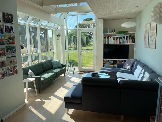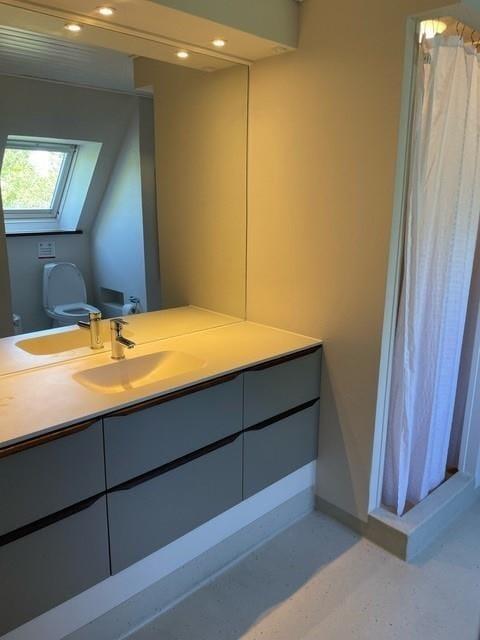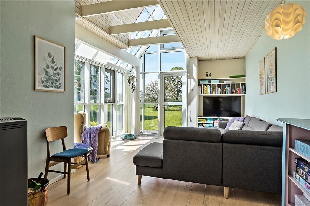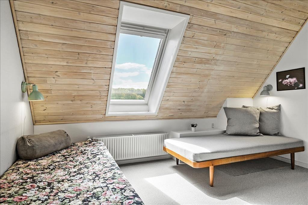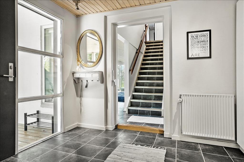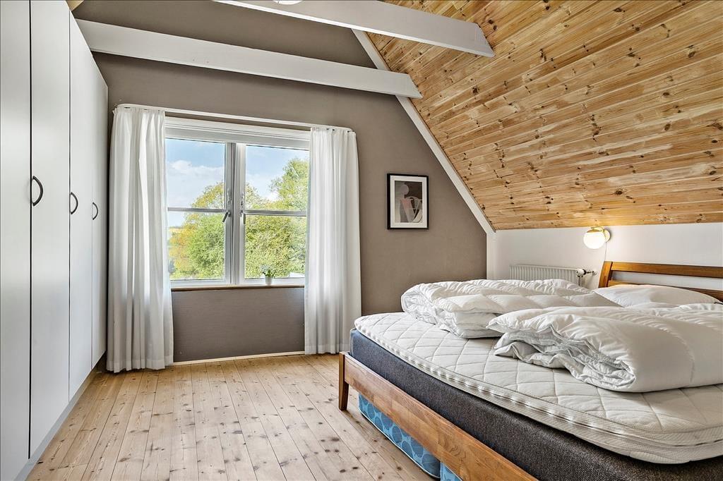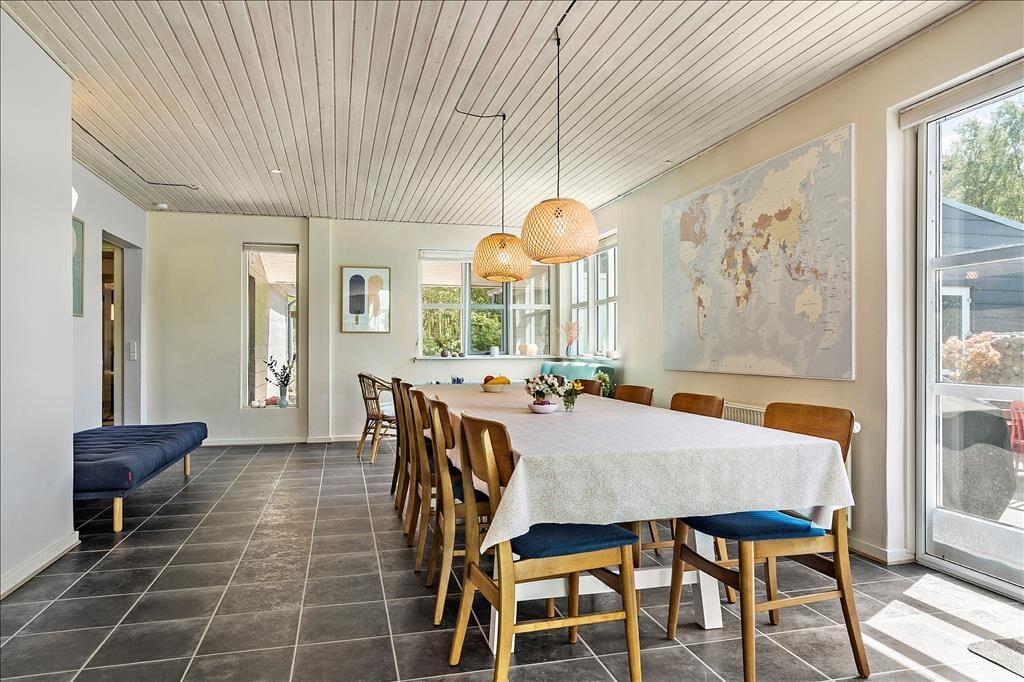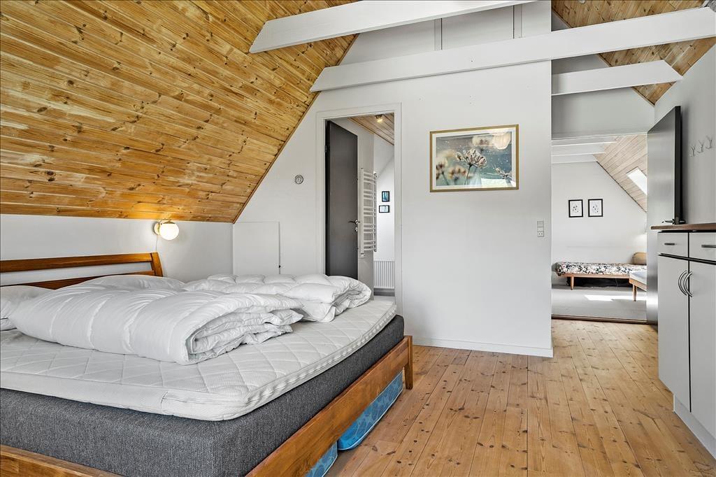 Das Herzstück des Hauses bildet der große Küchenbereich samt angrenzendem Esszimmer, um dessen Esstisch sich alle Mitreisenden gemeinsam in gemütlicher Runde versammeln können. In direkter Verbindung zum Esszimmer lockt darüber hinaus auch der Wohnraum, der mit einem schönen Sofa und einer fantastischen Aussicht über den Garten und die umliegenden Felder zu bestechen weiß. Ein Fernseher mit dänischen, deutschen, schwedischen und norwegischen Sendern ist vorhanden. Der Fernseher verfügt zudem über Chromecast, sodass Sie Ihre bevorzugten Internetinhalte über Ihr eigenes Streamingabo auf den Fernseher übertragen können. Die Internetgeschwindigkeit beträgt 100/100 Mbit. Für ein Maximum an Behaglichkeit und echter Ferienhausstimmung sorgt der im Wohnraum platzierte Holzpelletkaminofen, der Ihre gemütlichen Abende mit einem spannenden Film oder einem guten Buch wunderbar untermalt. Vom Esszimmer aus haben Sie direkten Zugang zu einer der hauseigenen Terrassen, auf der Sie bereits von einem schönen Essplatz und einem großen Gasgrill erwartet werden. Hier werden Sie sicherlich oft beisammensitzen und in aller Ruhe grillen. Die tolle Küche ist mit sämtlichen modernen Annehmlichkeiten ausgestattet und ermöglicht Ihnen somit die problemlose Zubereitung köstlichster Urlaubsmahlzeiten. Im Hauswirtschaftsbereich steht neben einer Waschmaschine und einem Wäschetrockner auch ein Gefrierschrank für Sie bereit. Auf täglich saubere Handtücher und das ein oder andere wunderbar erfrischende Eis müssen Sie in diesem Ferienhaus also keinesfalls verzichten. Für viel Begeisterung wird besonders bei den jüngeren Urlaubern der richtig gute Aktivitätsraum sorgen, der mit einer Tischtennisplatte, einer Dartscheibe und einer Wii-Spielekonsole zu überzeugen weiß. Zweifelsohne werden Sie mit Ihrer Familie in diesem Raum viele vergnügte und gesellige Stunden verleben. In Verbindung zum Aktivitätsraum erwartet Sie ein überaus gemütlicher Schlafraum mit einem hohen Doppelbett. Nahe des Hauseingangs befindet sich ein weiterer Schlafraum, der ebenfalls über ein Doppelbett verfügt. Im Erdgeschoss ist außerdem auch ein Badezimmer mit einem WC und einer Dusche platziert.
