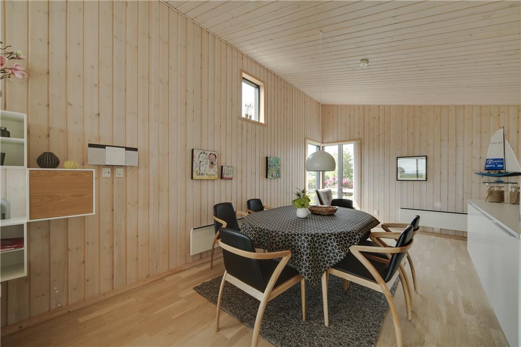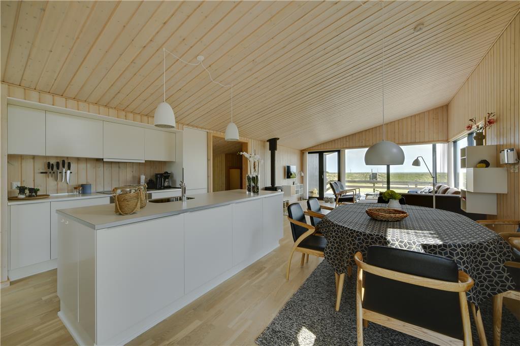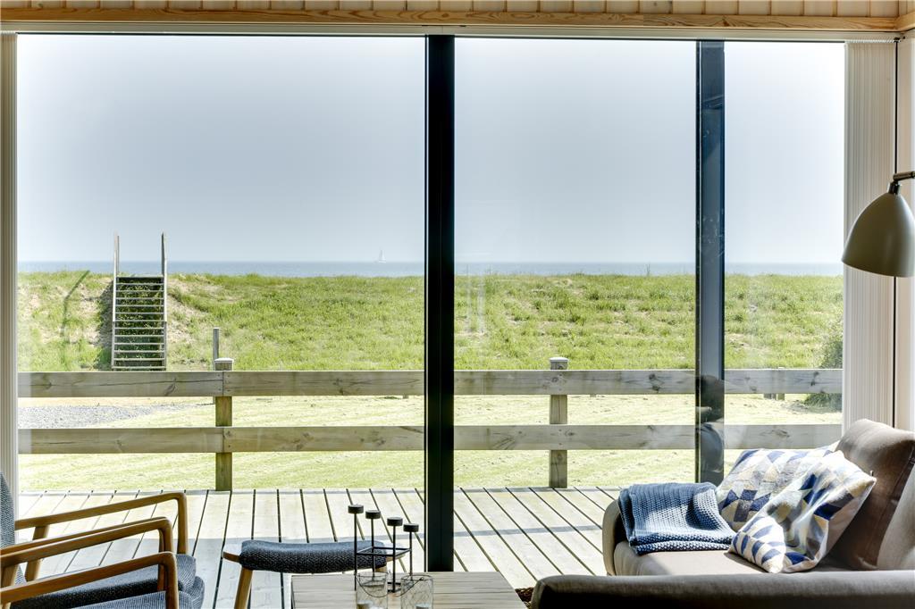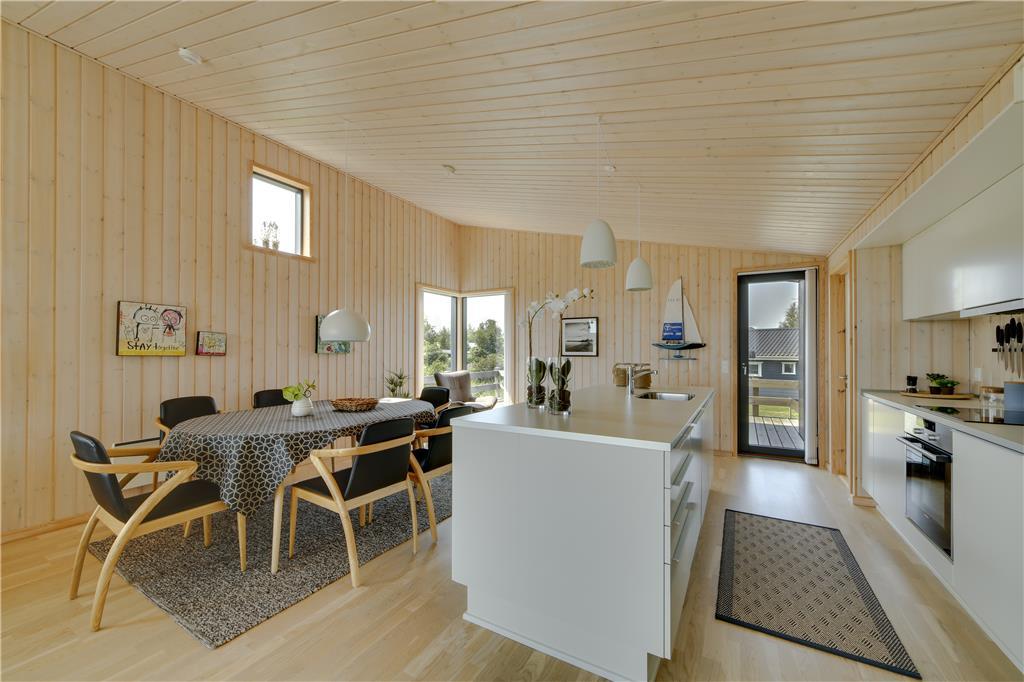 Betreten Sie ein helles und einladendes Ferienhaus, in dem große Fenster im Wohnzimmer die Natur ins Innere holen. Von der Couch aus können Sie den Blick über das Meer schweifen lassen, während das Tageslicht den Raum erfüllt und eine luftige und entspannte Atmosphäre schafft. Die Einrichtung ist gemütlich und einladend – perfekt für erholsame Stunden und gemeinsame Erlebnisse. Der Essbereich lädt zu langen, genussvollen Mahlzeiten ein, bei denen Sie das Meer als traumhafte Kulisse genießen können.