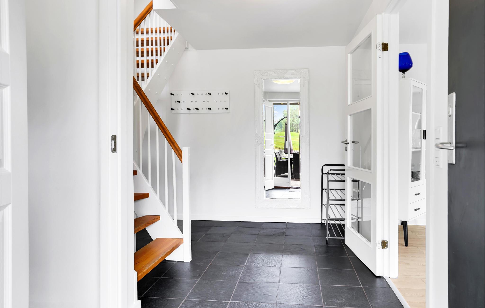Verbringen Sie Ihren Urlaub in diesem großzügigen Ferienhaus zwischen Wald und Golfplatz und nur eine kurze Fahrt vom nächsten Sandstrand entfernt. Machen Sie es sich im behaglichen Wohnzimmer mit Ecksofa, großem Flachbild-TV und Kaminofen gemütlich und verbringen Sie hier gemütliche Zeit mit der ganzen Familie. Spielen Sie auch gemeinsam am Spieltisch mit Billard, Tischtennis und Kicker. Die moderne, offene Küche geht direkt in den stilvollen Essbereich über.