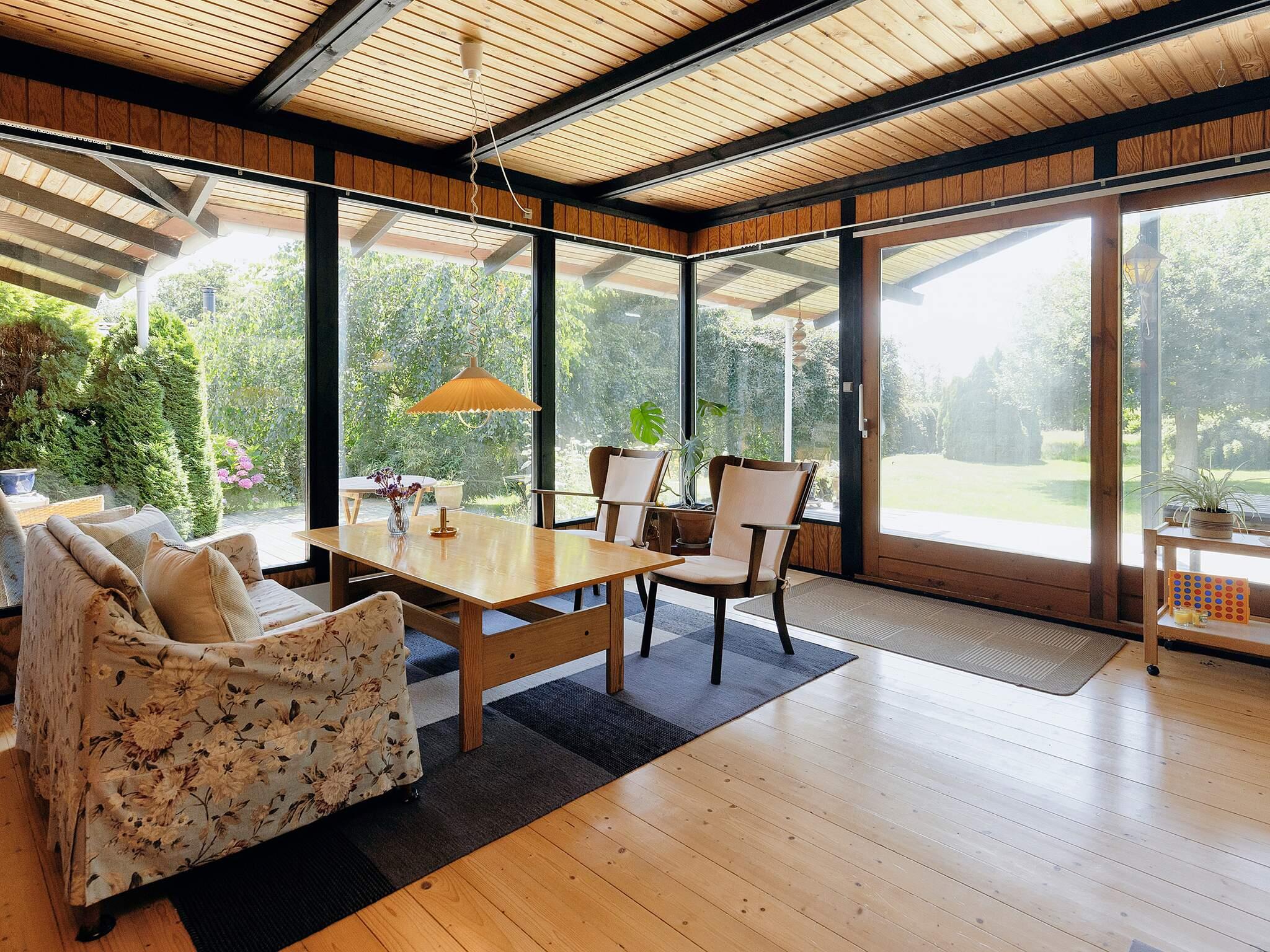 Das Haus verfügt über eine Küche, die in offener Verbindung zum Wohnzimmer steht. Vom Wohnzimmer aus hat man Zugang zu einer überdachten Terrasse. Im Wohnzimmer gibt es ein Schlafsofa/Doppelbett, einen Fernseher mit Chromecast und einen Holzofen, der an kühlen Tagen genutzt werden kann. Es gibt drei Schlafzimmer mit Etagenbetten und in einem Schlafzimmer gibt es auch einen kleinen Büroraum. Badezimmer mit Toilette, Waschbecken und Dusche.