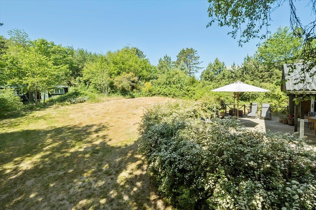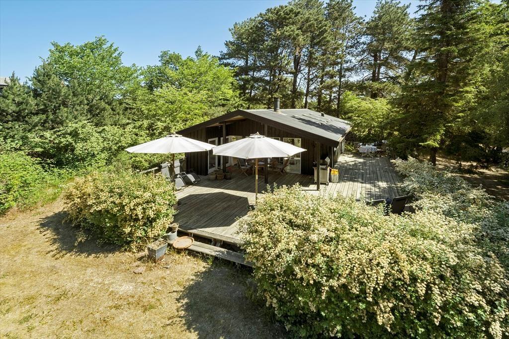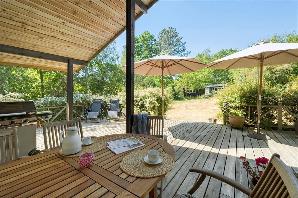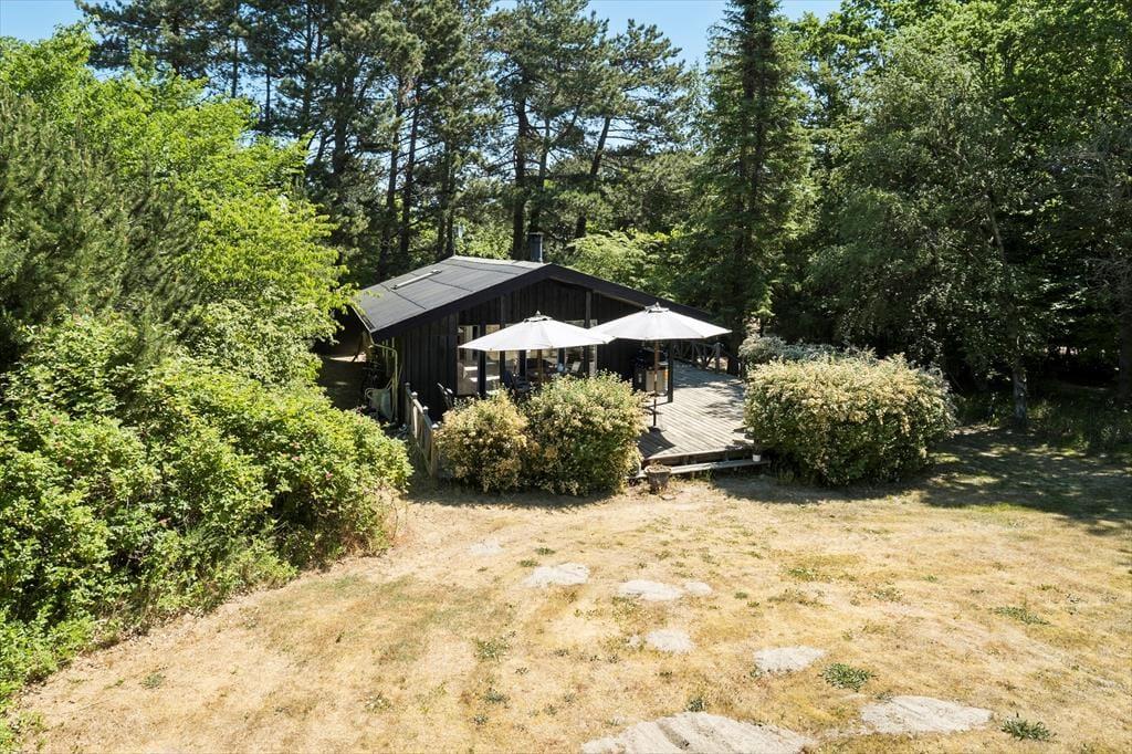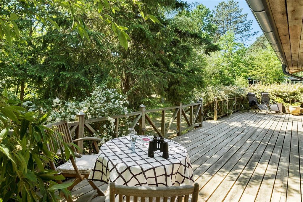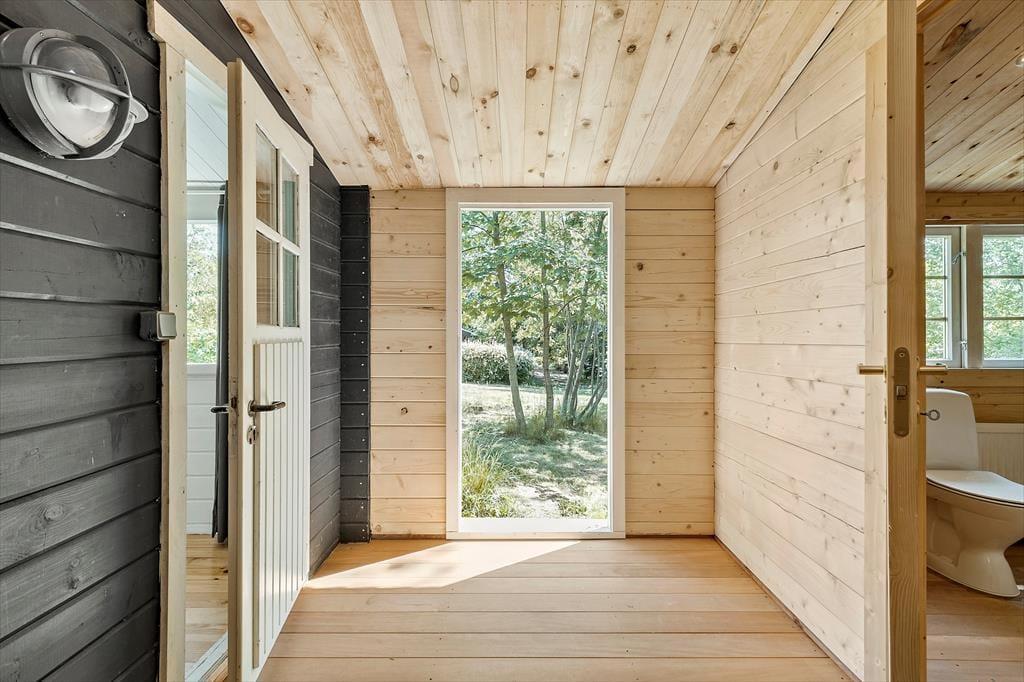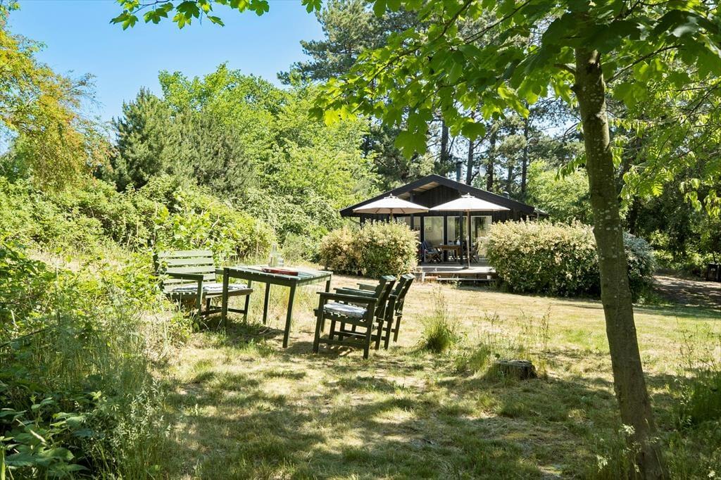 Im Außenbereich erwartet dich eine große, erhöhte Holzterrasse, auf der du die langen Sommertage und milden Abende genießen kannst. Ein Teil der Terrasse ist überdacht, sodass du vor der Sonne oder dem Abendtau geschützt bist, während du dein Abendessen oder ein Glas Wein genießt. Der Garten ist von Bäumen und Büschen umgeben und bietet eine Rasenfläche, die perfekt für Ballspiele oder das Spielen mit dem Hund geeignet ist. Hier ist genug Platz für Entspannung und Aktivitäten an der frischen Luft, während die Ruhe der umliegenden Ferienhaussiedlung die perfekte Kulisse für totale Erholung schafft.