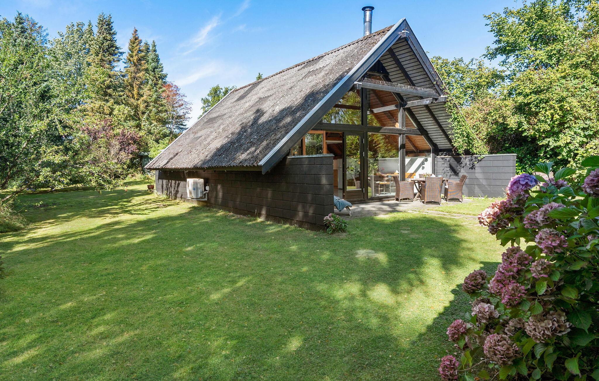Charmantes Ferienhaus am Fjord in Mern mit Kaminofen, Terrasse und großem Garten für erholsame Urlaubstage.