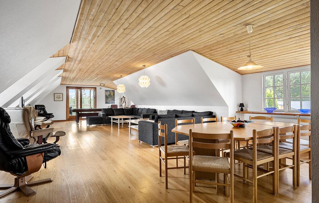 Ihr großzügig ausgestattetes und charmantes Reetdachhaus bietet den idealen Rahmen für einen Urlaub mit einer großen Reisegruppe. Das Anwesen in der Nähe von Kjellerup kombiniert traditionelle Bauweise mit modernen Freizeitmöglichkeiten und ist der ideale Ort für gemeinsame Erlebnisse und entspannte Stunden. Erleben Sie großzügige Wohnbereiche mit viel Platz zum Zusammensein. Entspannen Sie sich auf den bequemen Sofas, spielen Sie eine Runde Billard oder genießen Sie gesellige Abende in einem der großzügigen Speisezimmer. Kochen Sie gemeinsam in der schönen Küche mit direktem Zugang zum Innenhof. Erholen Sie sich in der Sauna, ziehen Sie Ihre Bahnen im Innenpool oder trainieren Sie im gut ausgestatteten Fitnessraum.