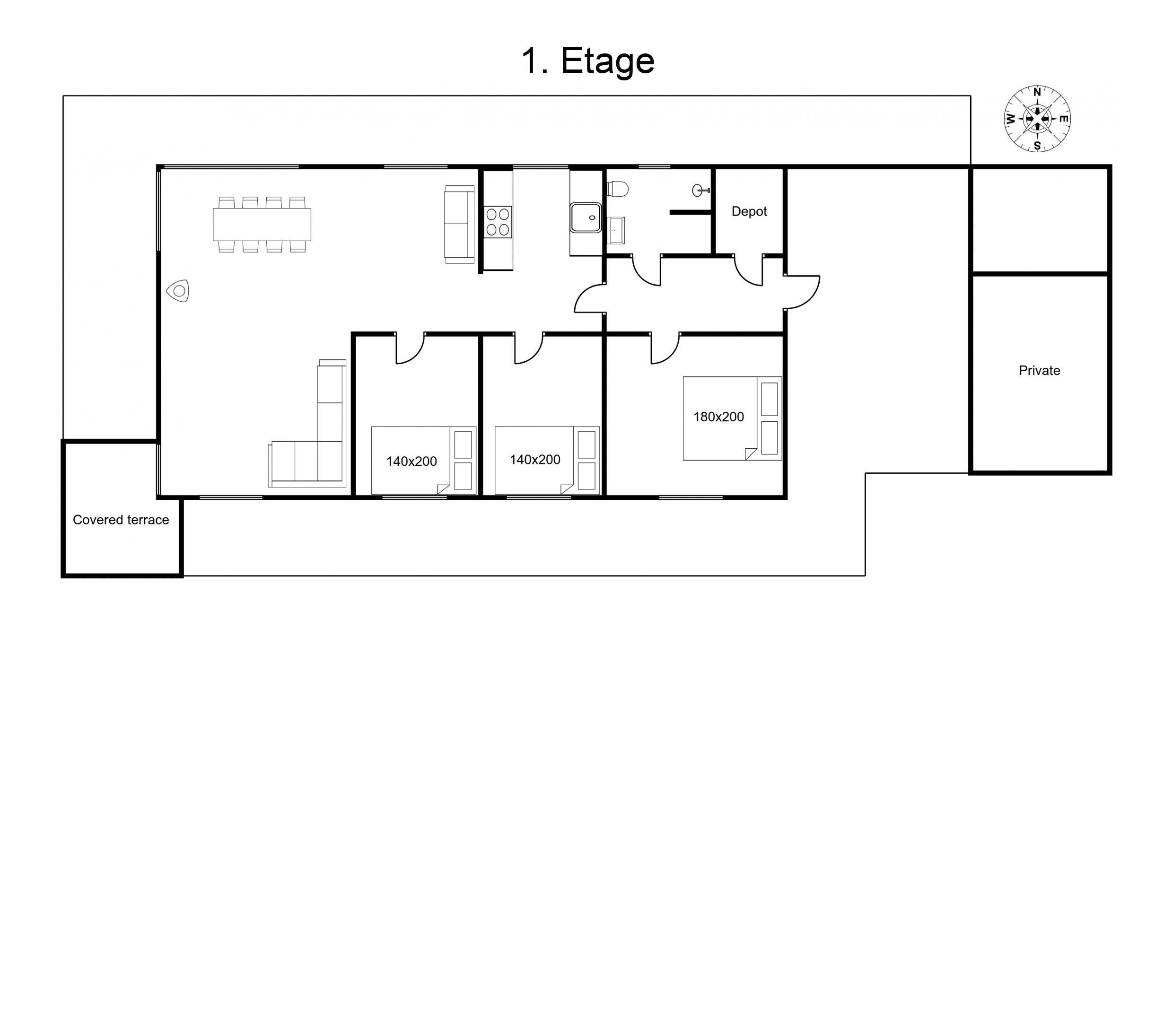 Das Ferienhaus ist von einer großen Terrasse umgeben, die es Ihnen ermöglicht, die Sonne den ganzen Tag über zu genießen. Finden Sie einen geschützten Platz, entspannen Sie sich auf der überdachten Terrasse, oder nehmen Sie den idyllischen Pfad, den "Dschungelpfad", direkt hinunter zum Strand. Das abgeschiedene Naturgrundstück lädt zu Ruhe und Naturerlebnissen in friedlicher Umgebung ein. Von hier aus können Sie den Blick über die grüne Landschaft schweifen lassen und das Meer erblicken.