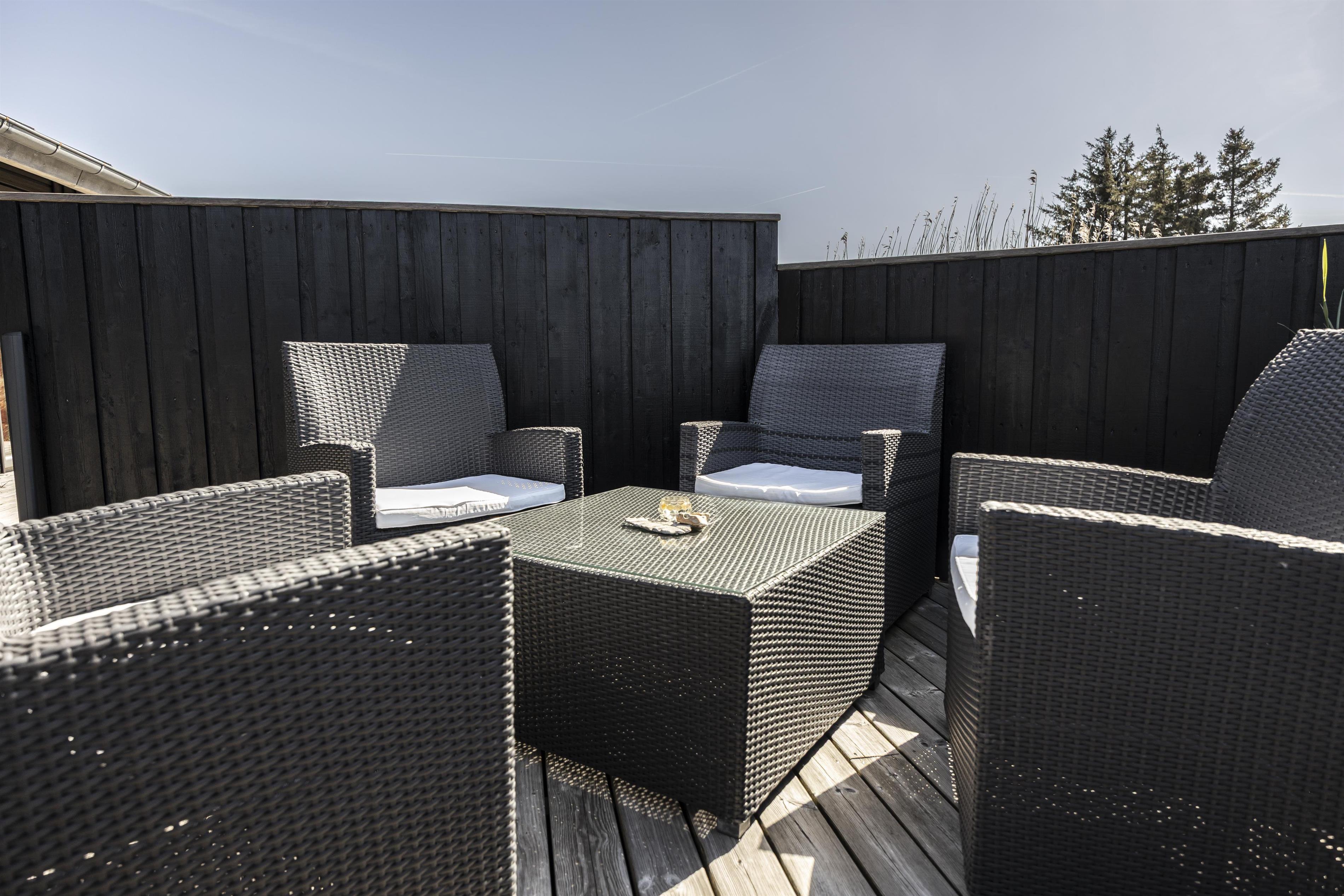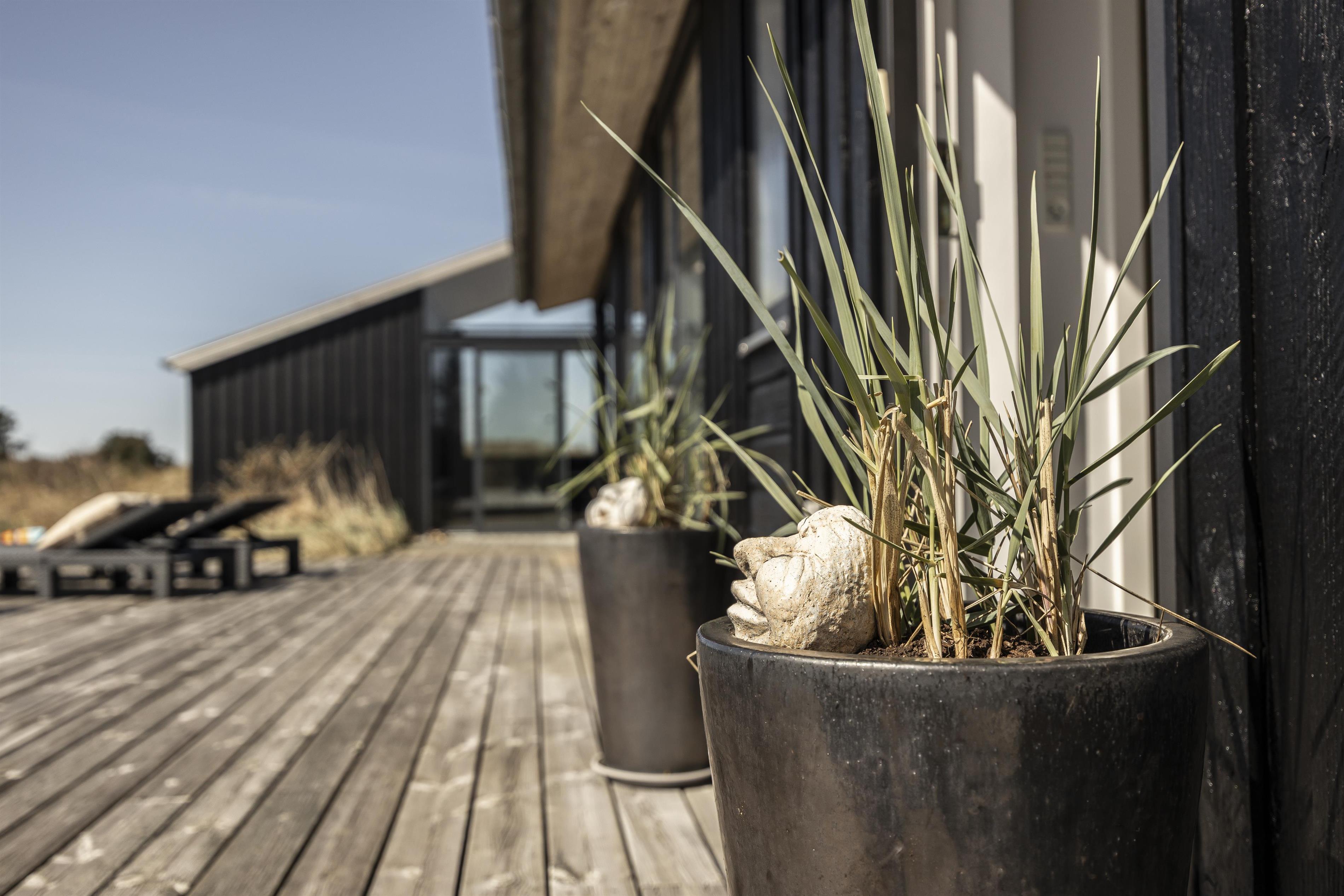 Das Haus bietet nicht nur hohe Qualität im Innenbereich – auch draußen gibt es mehrere schöne Terrassebereiche, die das Haus umgeben. Hier können Sie die Sonne den ganzen Tag über genießen, die frische Meeresluft einatmen oder Schutz vor dem oft kräftigen Westwind suchen. Auf der Vorderseite des Hauses finden Sie den perfekten Ort, um Ihren Morgenkaffee zu genießen, während Sie den fantastischen Meerblick genießen. Später am Tag können Sie sich auf der großen Terrasse auf der anderen Seite des Hauses entspannen, die genügend Platz für die ganze Familie bietet.