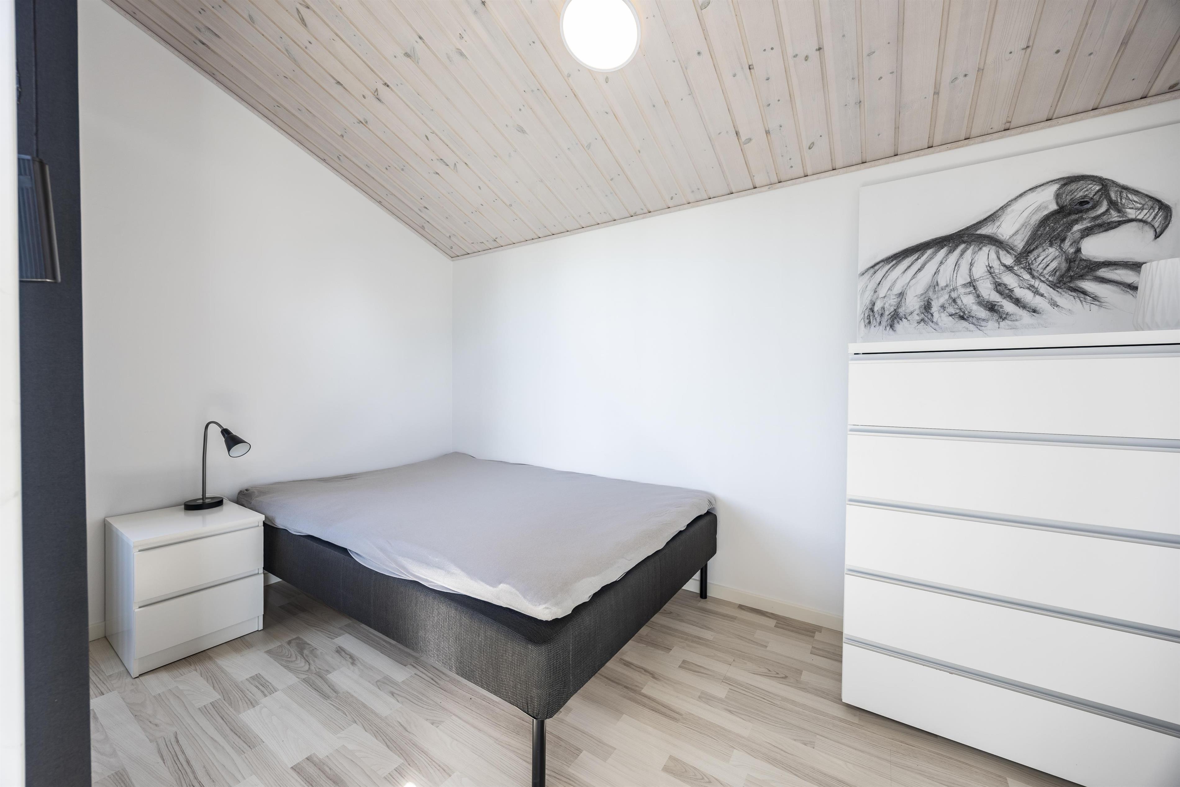 Das Ferienhaus ist von hoher Qualität und überzeugt mit einer spannenden und durchdachten Einrichtung. Sie werden von einem aufregenden und architektonisch anspruchsvollen Grundriss auf mehreren Ebenen empfangen. Das Haus verfügt über zwei Eingänge – einer davon führt direkt in den Hauswirtschaftsraum im Untergeschoss. Hier stehen Ihnen sowohl eine Waschmaschine als auch ein Trockner zur Verfügung, ebenso wie großzügiger Stauraum für Oberbekleidung. Durch den zweiten Eingang gelangen Sie in das Erdgeschoss des Hauses. Hier befinden sich zwei moderne Badezimmer sowie drei geschmackvoll eingerichtete Schlafzimmer. Im gesamten Haus herrscht eine großzügige Deckenhöhe, die allen Räumen ein offenes und luftiges Ambiente verleiht. Zwei der Schlafzimmer sind mit komfortablen Doppelbetten ausgestattet, während das dritte Zimmer ein Familienetagenbett sowie einen kleinen Hems (offene Schlafempore) bietet – ideal für Kinder. Zusätzlich besteht die Möglichkeit, zwei weitere Schlafplätze einzurichten.