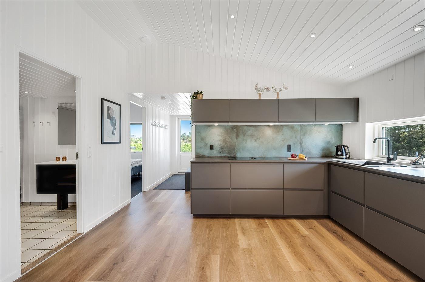 Die Küche ist mit Kühlschrank ausgestattet. Außerdem gibt es 4 Induktions-Kochzonen, Umluftofen, Mikrowelle sowie Geschirrspüler.