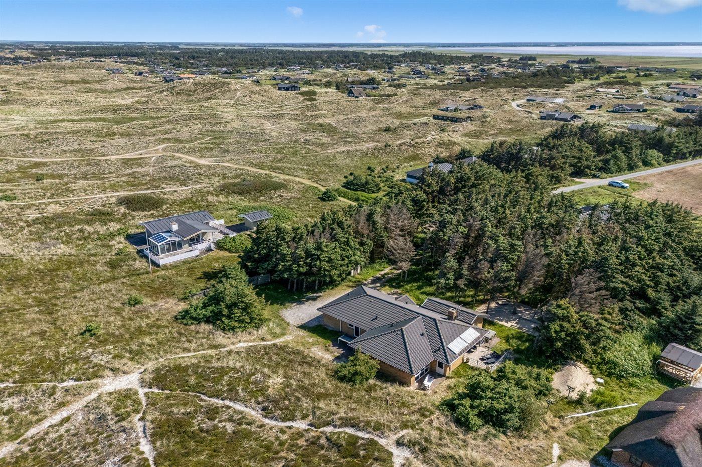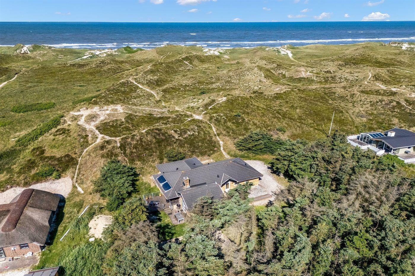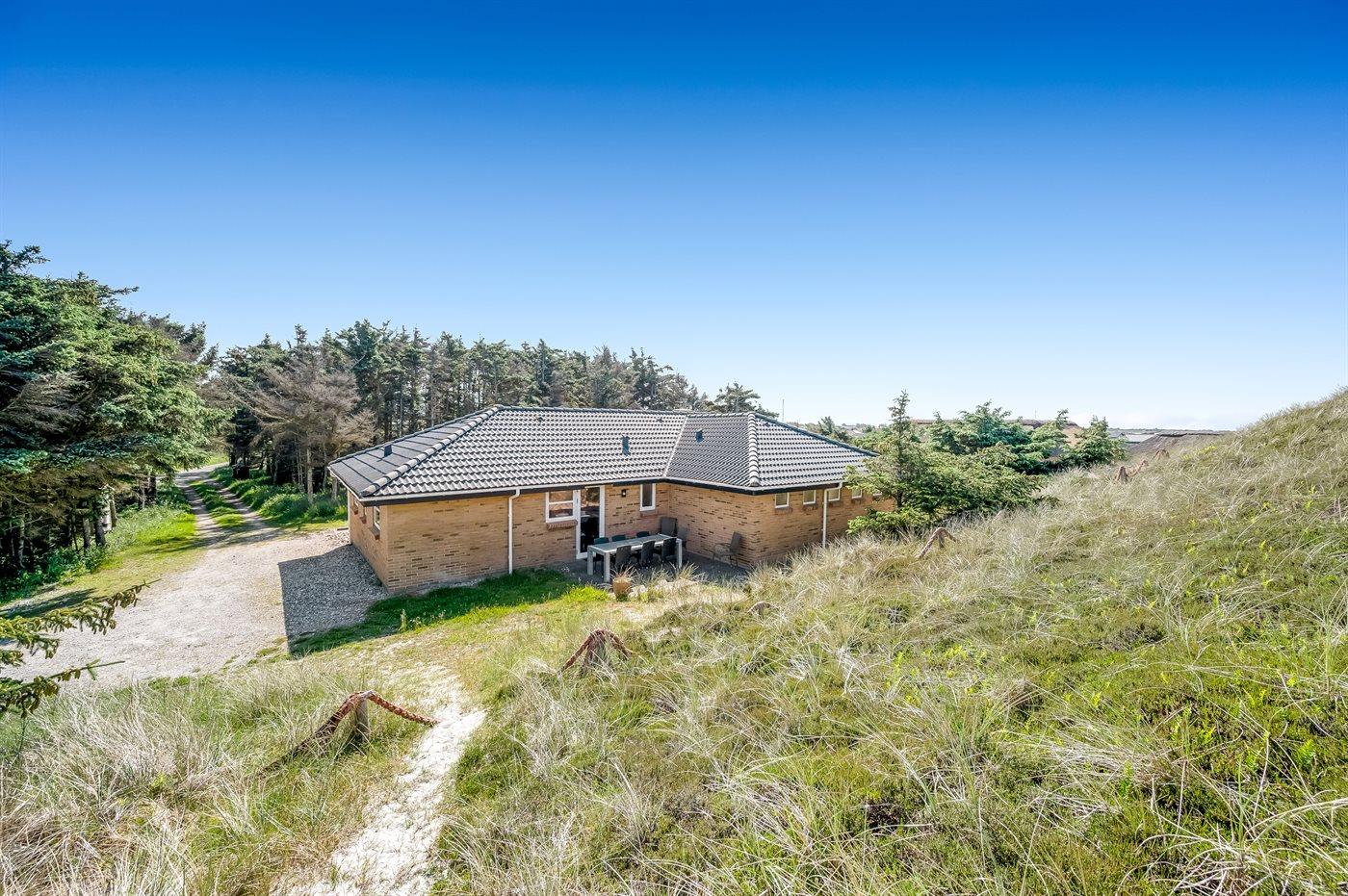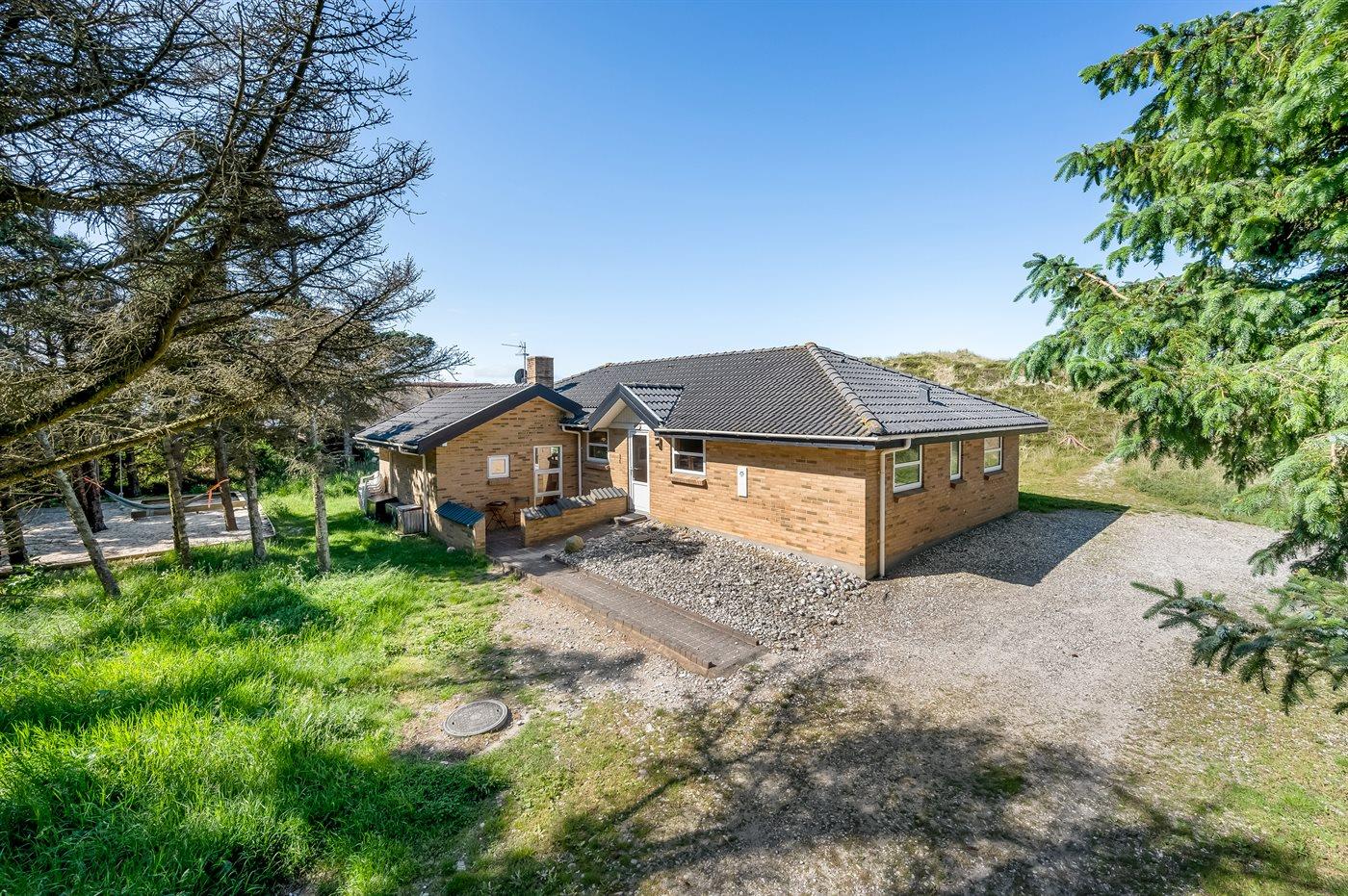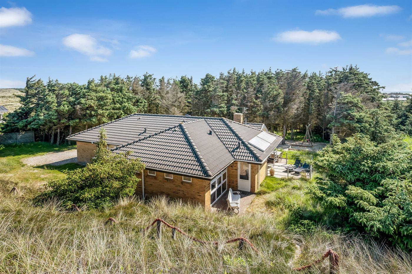 Schönes Ferienhaus aus Stein mit Swimmingpool, Whirlpool und Sauna - am Ende des Weges in ruhiger und naturschöner Umgebung. Das Haus, das 1993 gebaut ist, liegt auf einem Dünengrundstück mit Meeresblick und Bäumen - 300 m vom Strand entfernt. Vom höchsten Punkt der Düne können Sie das Meer sehen. Mehrere herrliche Terrassen mit Gartenmöbeln. Holzboden im Wohnzimmer und im Flur, Teppichboden in den Schlafzimmern, sonst Klinkerboden. Das Haus ist mit einer herrlichen Pool-Abteilung mit Swimmingpool (5,9 x 3,5 x 1,2 m), 4-Pers.-Whirlpool (Standwasser), Dusche und Zutritt zur Sauna des Hauses eingerichtet. Außerdem Badezimmer mit beheiztem Klinkerboden, Duschnische, Waschmaschine und Wäschetrockner. Gästetoilette. Darüber hinaus gut eingerichtete Küche mit Tiefkühlgerät, Mikrowelle, Herd mit Ceran-Feld und Geschirrspüler. Das in versetzter ebene liegende Wohnzimmer enthält Kaminofen, Stereoanlage mit CD-Spieler und TV mit digitalem Satellitenanschluss und DVD-Spieler. Das Haus enthält auch 4 Schlafzimmer; 3 mit Doppelbett und 1 mit 1 Etagenbett und 1 Einzelbett. Von weiterer Ausstattung können kostenlose, kabellose Internetverbindung (eigener Computer ist mitzubringen), Kinderbett und Kinderhochstuhl erwähnt werden. Schaukel auf dem Grundstück. Dieses Ferienhaus in wunderschöner Umgebung, dicht am Wasser und direkt an den Dünen wird zu jeder Jahreszeit den perfekten Rahmen eines wunderschönen Ferienerlebnises bilden. Gute Aktivitätsmöglichkeiten im Gebiet. Nur ca. 5 Min. Fahrt vom Badeort Søndervig entfernt.