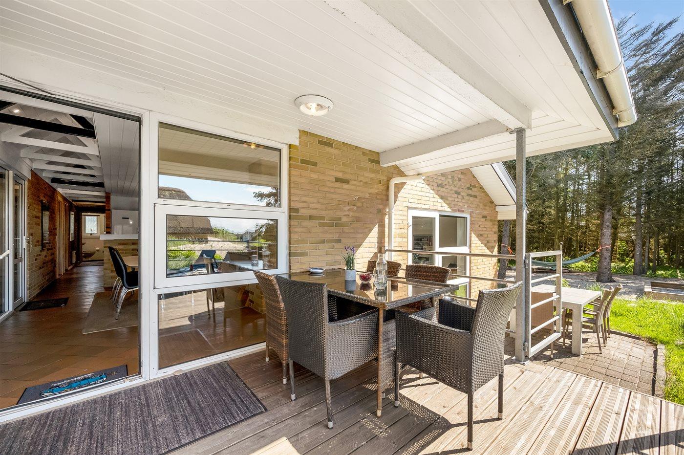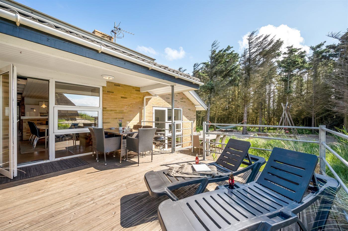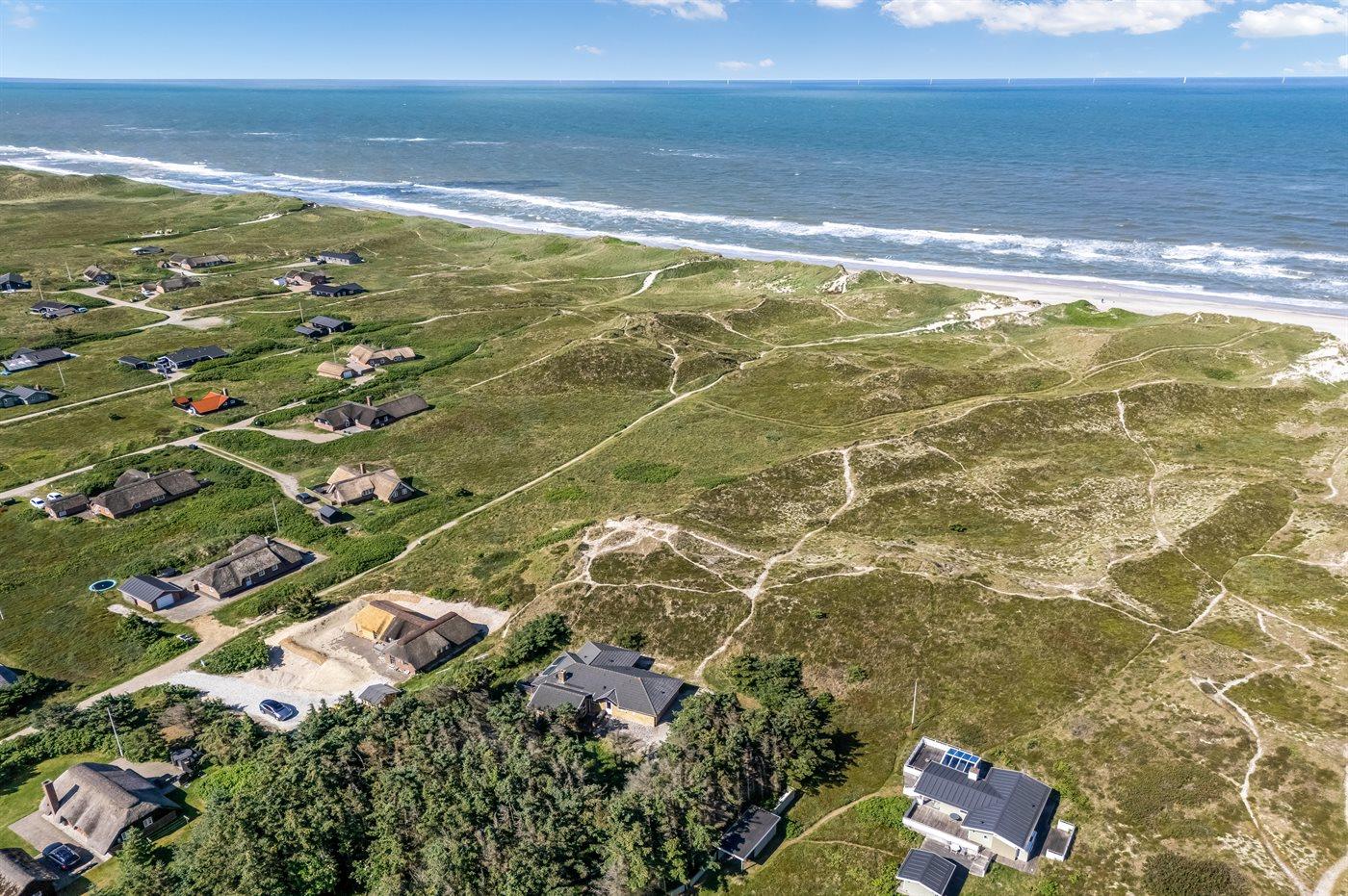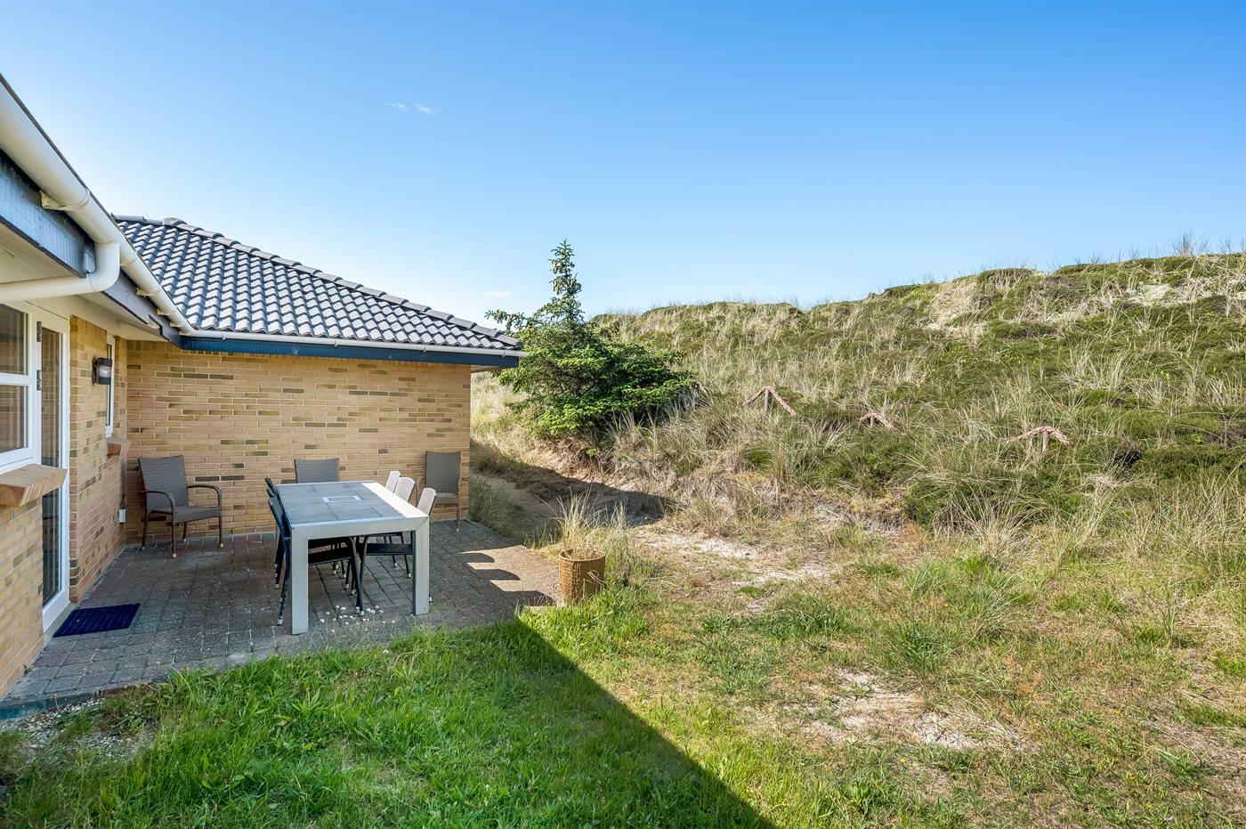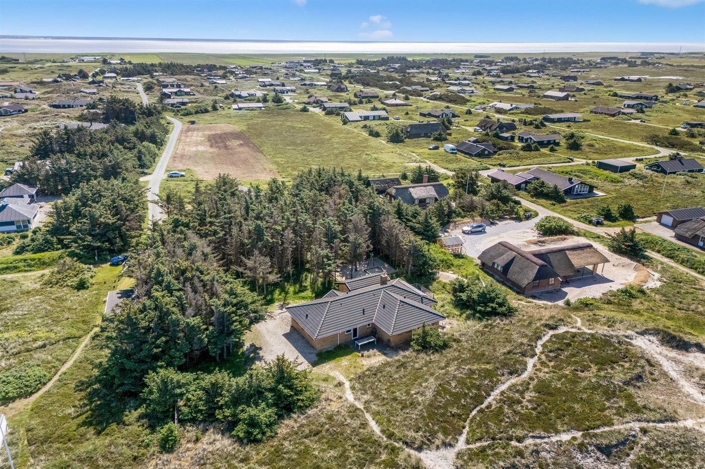 Schönes Ferienhaus aus Stein mit Swimmingpool, Whirlpool und Sauna - am Ende des Weges in ruhiger und naturschöner Umgebung. Das Haus, das 1993 gebaut ist, liegt auf einem Dünengrundstück mit Meeresblick und Bäumen - 300 m vom Strand entfernt. Vom höchsten Punkt der Düne können Sie das Meer sehen. Mehrere herrliche Terrassen mit Gartenmöbeln. Holzboden im Wohnzimmer und im Flur, Teppichboden in den Schlafzimmern, sonst Klinkerboden. Das Haus ist mit einer herrlichen Pool-Abteilung mit Swimmingpool (5,9 x 3,5 x 1,2 m), 4-Pers.-Whirlpool (Standwasser), Dusche und Zutritt zur Sauna des Hauses eingerichtet. Außerdem Badezimmer mit beheiztem Klinkerboden, Duschnische, Waschmaschine und Wäschetrockner. Gästetoilette. Darüber hinaus gut eingerichtete Küche mit Tiefkühlgerät, Mikrowelle, Herd mit Ceran-Feld und Geschirrspüler. Das in versetzter ebene liegende Wohnzimmer enthält Kaminofen, Stereoanlage mit CD-Spieler und TV mit digitalem Satellitenanschluss und DVD-Spieler. Das Haus enthält auch 4 Schlafzimmer; 3 mit Doppelbett und 1 mit 1 Etagenbett und 1 Einzelbett. Von weiterer Ausstattung können kostenlose, kabellose Internetverbindung (eigener Computer ist mitzubringen), Kinderbett und Kinderhochstuhl erwähnt werden. Schaukel auf dem Grundstück. Dieses Ferienhaus in wunderschöner Umgebung, dicht am Wasser und direkt an den Dünen wird zu jeder Jahreszeit den perfekten Rahmen eines wunderschönen Ferienerlebnises bilden. Gute Aktivitätsmöglichkeiten im Gebiet. Nur ca. 5 Min. Fahrt vom Badeort Søndervig entfernt.