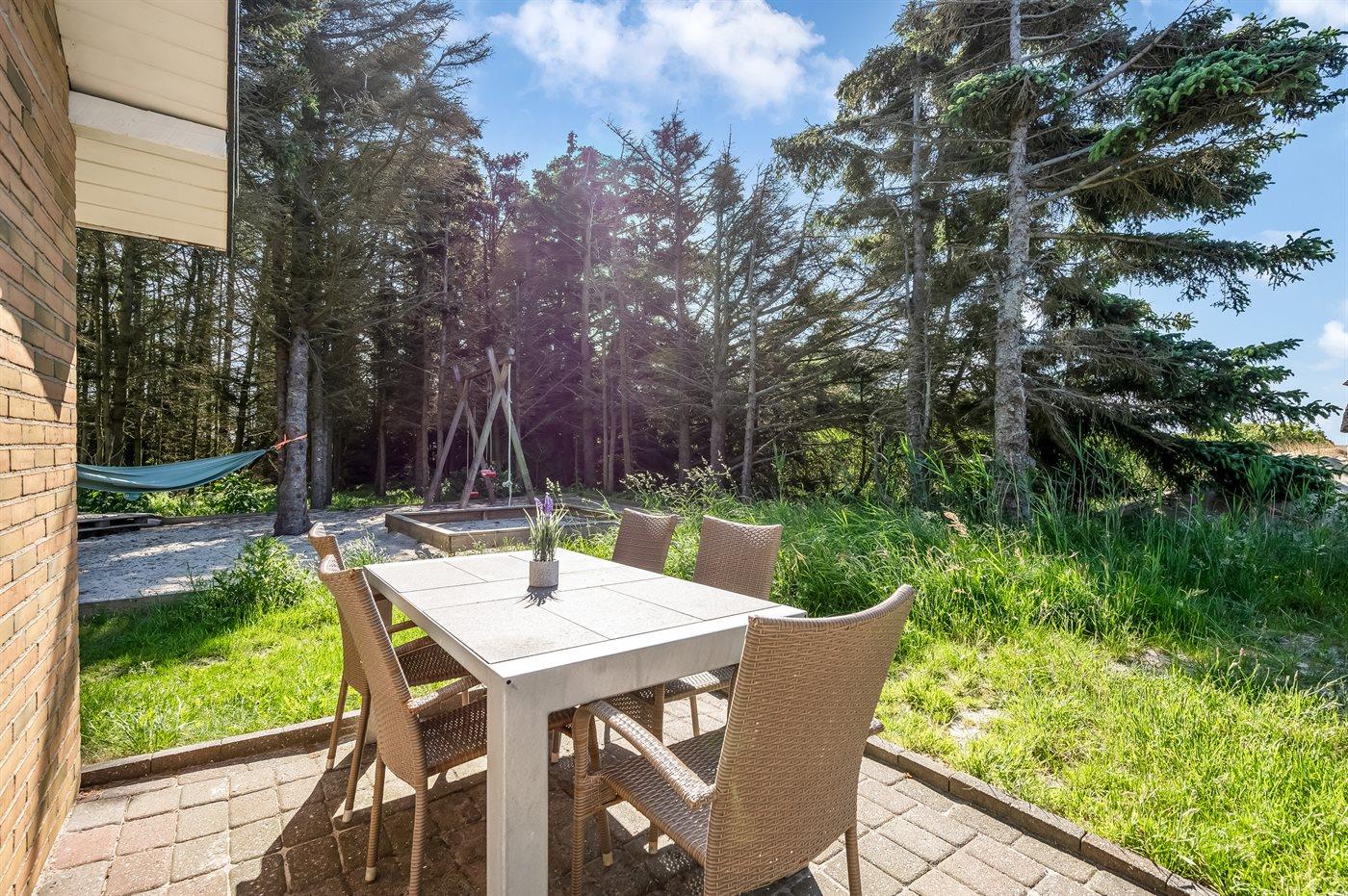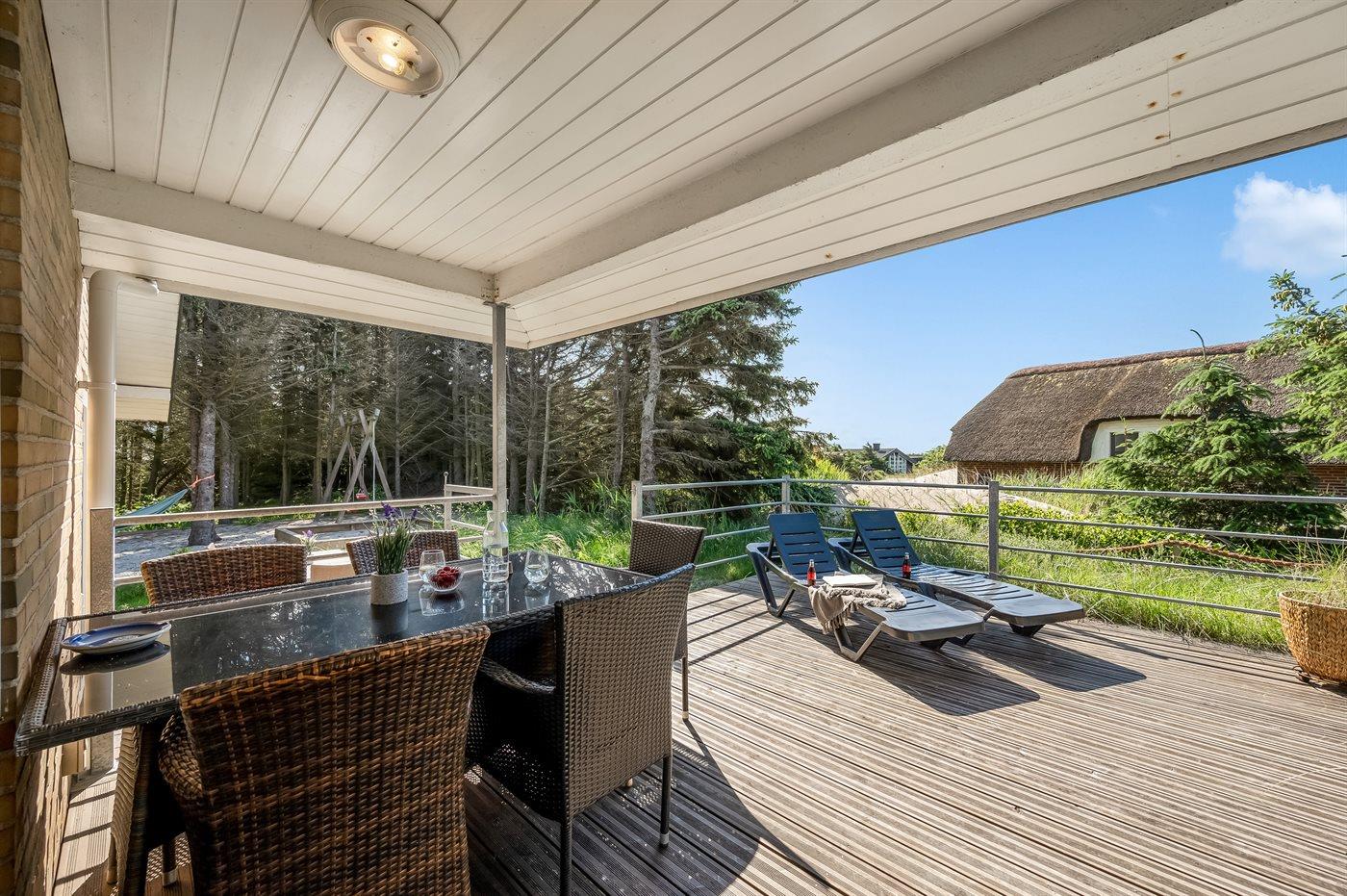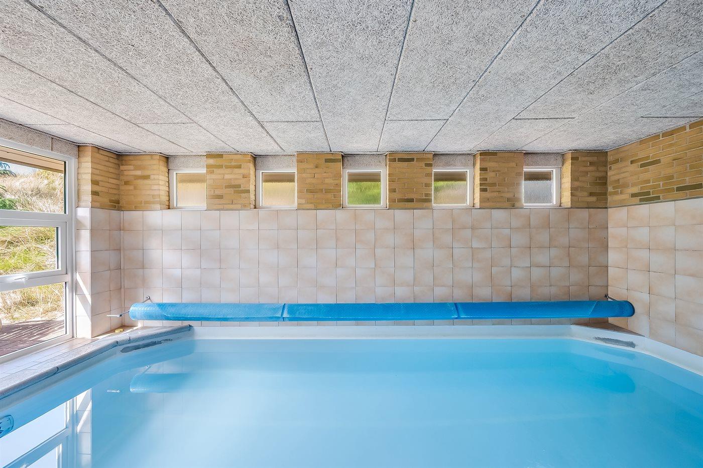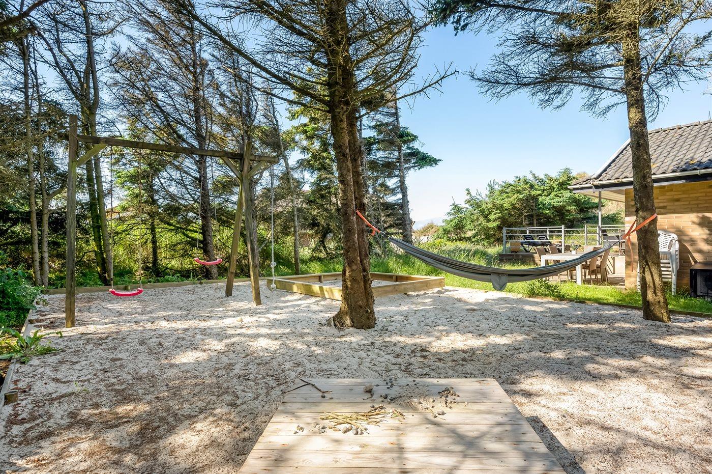 Schönes Ferienhaus aus Stein mit Swimmingpool, Whirlpool und Sauna - am Ende des Weges in ruhiger und naturschöner Umgebung. Das Haus, das 1993 gebaut ist, liegt auf einem Dünengrundstück mit Meeresblick und Bäumen - 300 m vom Strand entfernt. Vom höchsten Punkt der Düne können Sie das Meer sehen. Mehrere herrliche Terrassen mit Gartenmöbeln. Holzboden im Wohnzimmer und im Flur, Teppichboden in den Schlafzimmern, sonst Klinkerboden. Das Haus ist mit einer herrlichen Pool-Abteilung mit Swimmingpool (5,9 x 3,5 x 1,2 m), 4-Pers.-Whirlpool (Standwasser), Dusche und Zutritt zur Sauna des Hauses eingerichtet. Außerdem Badezimmer mit beheiztem Klinkerboden, Duschnische, Waschmaschine und Wäschetrockner. Gästetoilette. Darüber hinaus gut eingerichtete Küche mit Tiefkühlgerät, Mikrowelle, Herd mit Ceran-Feld und Geschirrspüler. Das in versetzter ebene liegende Wohnzimmer enthält Kaminofen, Stereoanlage mit CD-Spieler und TV mit digitalem Satellitenanschluss und DVD-Spieler. Das Haus enthält auch 4 Schlafzimmer; 3 mit Doppelbett und 1 mit 1 Etagenbett und 1 Einzelbett. Von weiterer Ausstattung können kostenlose, kabellose Internetverbindung (eigener Computer ist mitzubringen), Kinderbett und Kinderhochstuhl erwähnt werden. Schaukel auf dem Grundstück. Dieses Ferienhaus in wunderschöner Umgebung, dicht am Wasser und direkt an den Dünen wird zu jeder Jahreszeit den perfekten Rahmen eines wunderschönen Ferienerlebnises bilden. Gute Aktivitätsmöglichkeiten im Gebiet. Nur ca. 5 Min. Fahrt vom Badeort Søndervig entfernt.