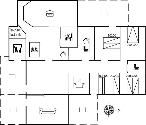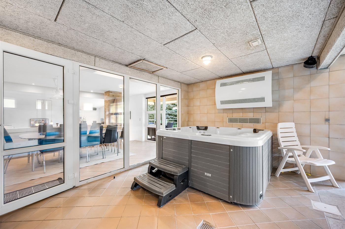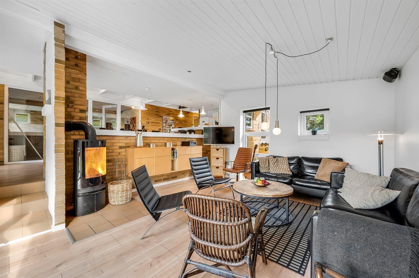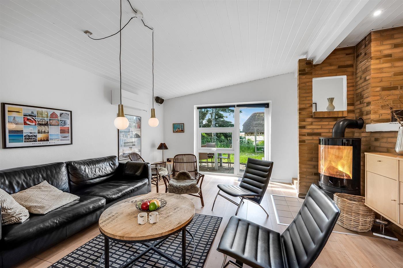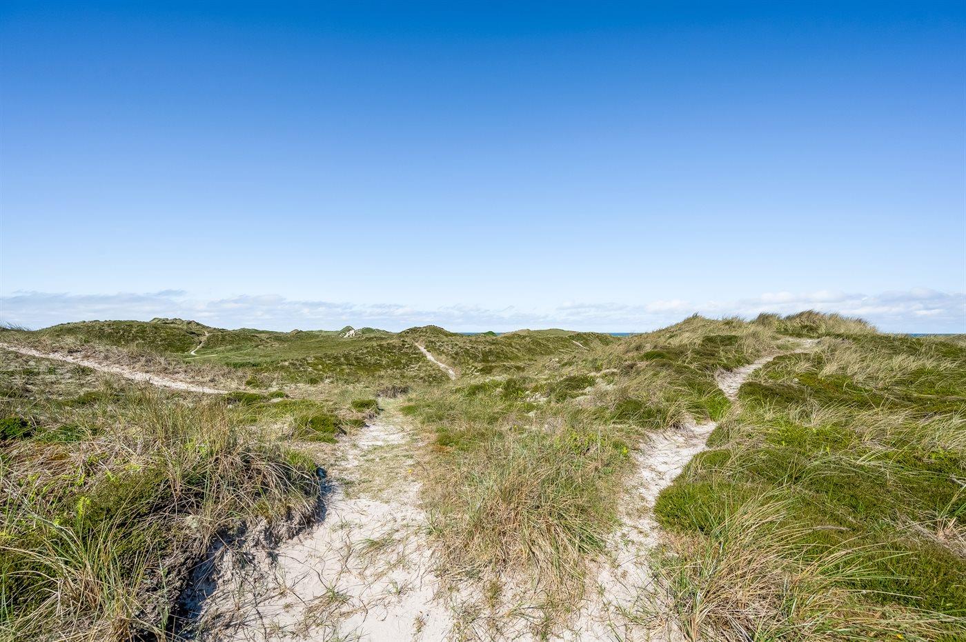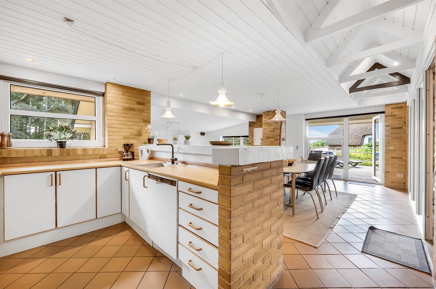 Schönes Ferienhaus aus Stein mit Swimmingpool, Whirlpool und Sauna - am Ende des Weges in ruhiger und naturschöner Umgebung. Das Haus, das 1993 gebaut ist, liegt auf einem Dünengrundstück mit Meeresblick und Bäumen - 300 m vom Strand entfernt. Vom höchsten Punkt der Düne können Sie das Meer sehen. Mehrere herrliche Terrassen mit Gartenmöbeln. Holzboden im Wohnzimmer und im Flur, Teppichboden in den Schlafzimmern, sonst Klinkerboden. Das Haus ist mit einer herrlichen Pool-Abteilung mit Swimmingpool (5,9 x 3,5 x 1,2 m), 4-Pers.-Whirlpool (Standwasser), Dusche und Zutritt zur Sauna des Hauses eingerichtet. Außerdem Badezimmer mit beheiztem Klinkerboden, Duschnische, Waschmaschine und Wäschetrockner. Gästetoilette. Darüber hinaus gut eingerichtete Küche mit Tiefkühlgerät, Mikrowelle, Herd mit Ceran-Feld und Geschirrspüler. Das in versetzter ebene liegende Wohnzimmer enthält Kaminofen, Stereoanlage mit CD-Spieler und TV mit digitalem Satellitenanschluss und DVD-Spieler. Das Haus enthält auch 4 Schlafzimmer; 3 mit Doppelbett und 1 mit 1 Etagenbett und 1 Einzelbett. Von weiterer Ausstattung können kostenlose, kabellose Internetverbindung (eigener Computer ist mitzubringen), Kinderbett und Kinderhochstuhl erwähnt werden. Schaukel auf dem Grundstück. Dieses Ferienhaus in wunderschöner Umgebung, dicht am Wasser und direkt an den Dünen wird zu jeder Jahreszeit den perfekten Rahmen eines wunderschönen Ferienerlebnises bilden. Gute Aktivitätsmöglichkeiten im Gebiet. Nur ca. 5 Min. Fahrt vom Badeort Søndervig entfernt.