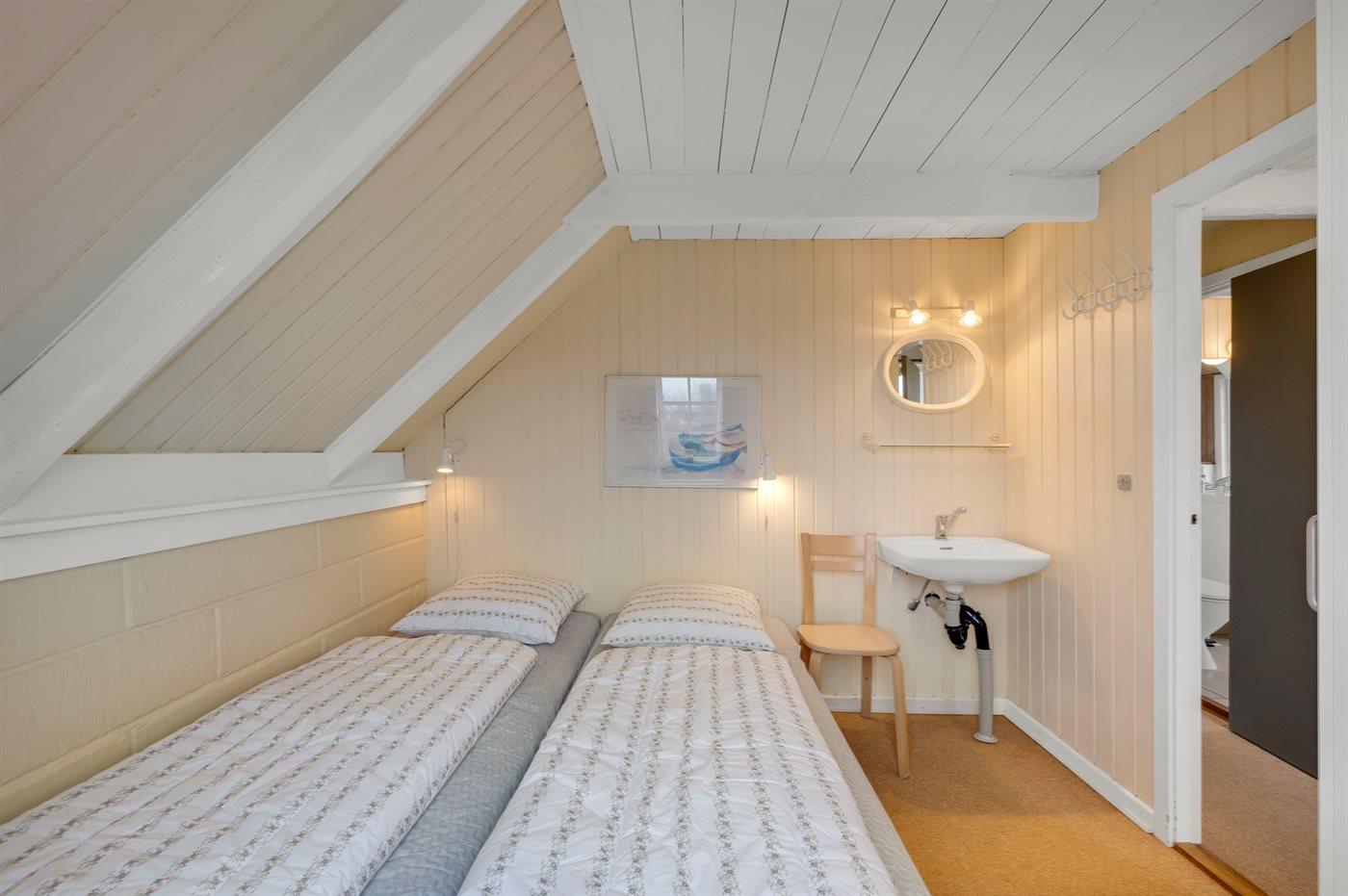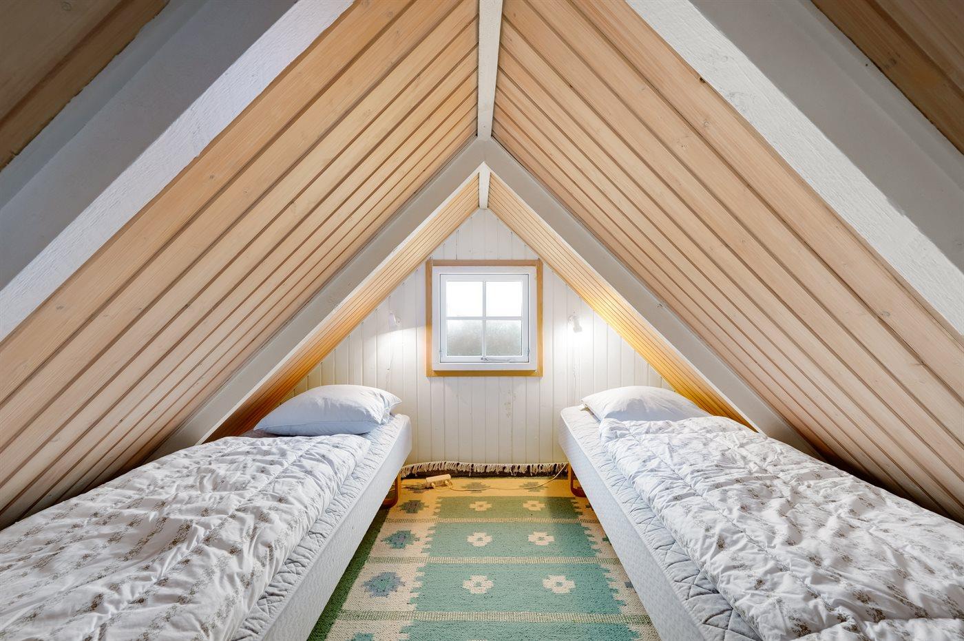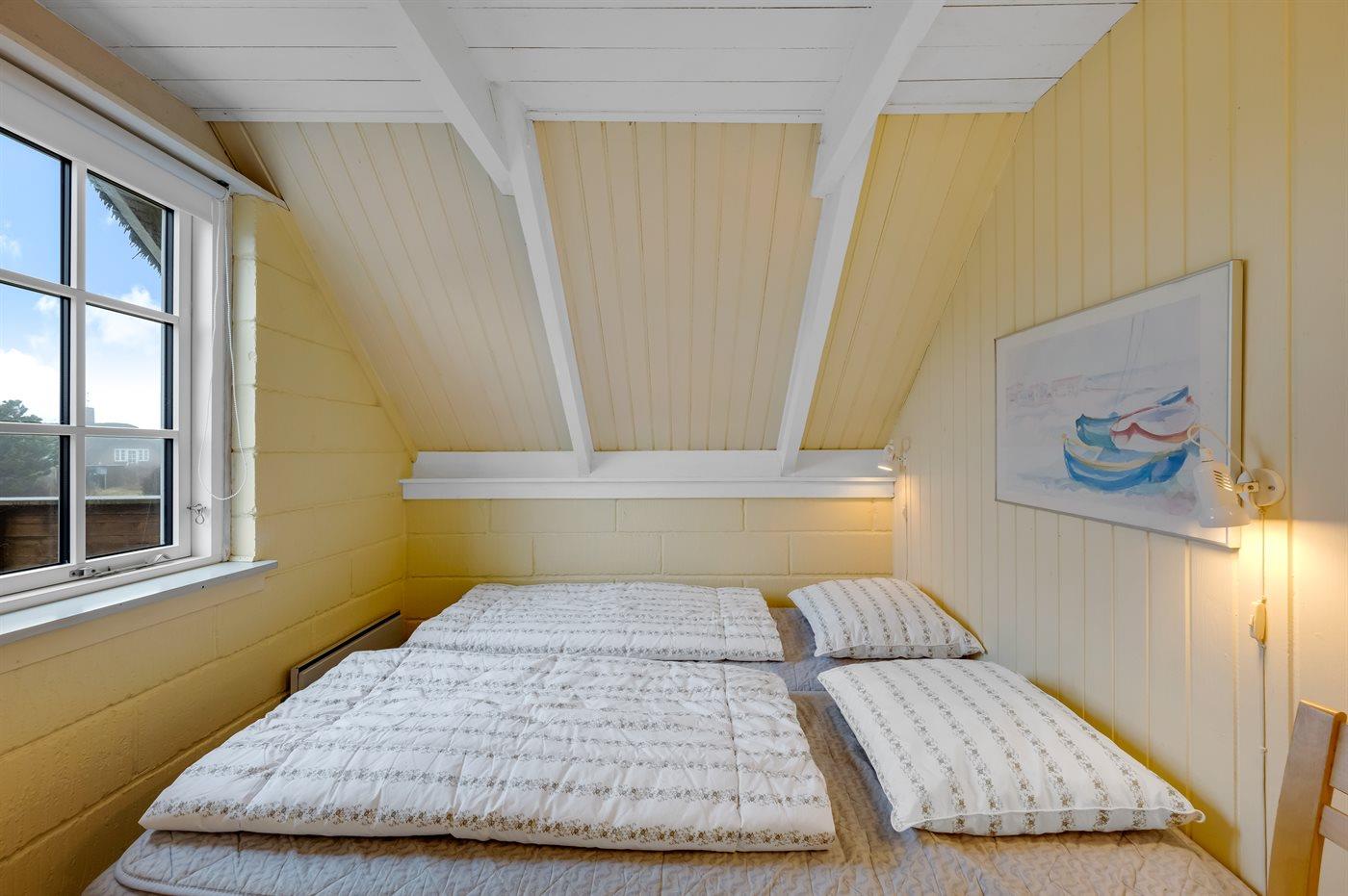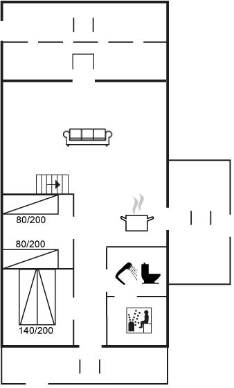 Die Schlafplätze verteilen sich auf 2 Schlafräume. 2 Schlafplätze in einem Doppelbett. 4 Schlafplätze in Einzelbetten. 2 von diesen Schlafplätzen befinden sich im offenen Obergeschoss.