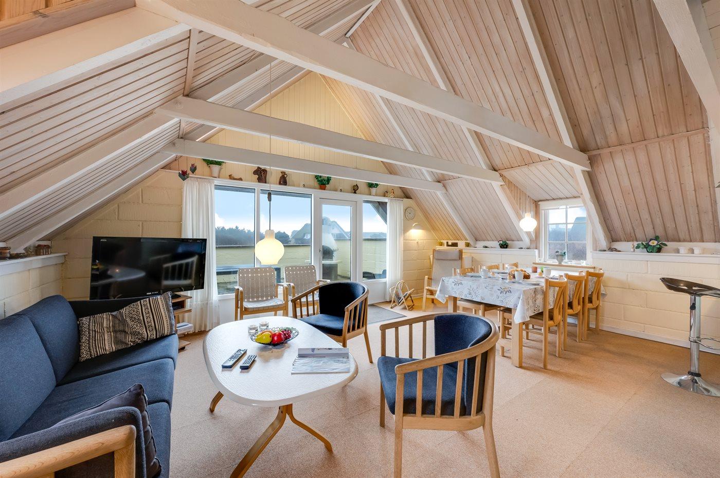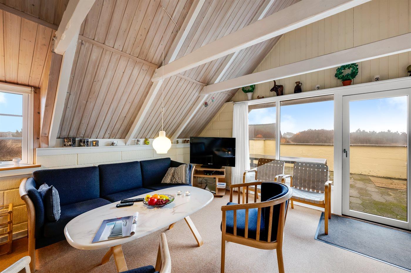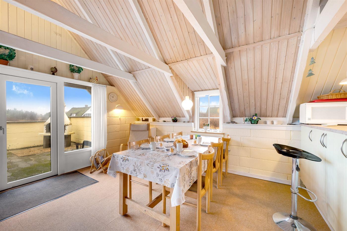 Ein Ferienhaus mit Reetdach und Sauna, auf einem ca. 2.200 m² großen Dünengrundstück bei Klegod gelegen, nur etwa 900 Meter von der Nordsee entfernt. Vom Wohnzimmer hast du direkten Zugang zu einer nach Süden ausgerichteten, teilweise überdachten Terrasse. Außerdem gibt es eine nach Westen ausgerichtete, abgeschirmte Terrasse sowie eine große, geschlossene Terrasse am nördlichen Ende des Hauses.