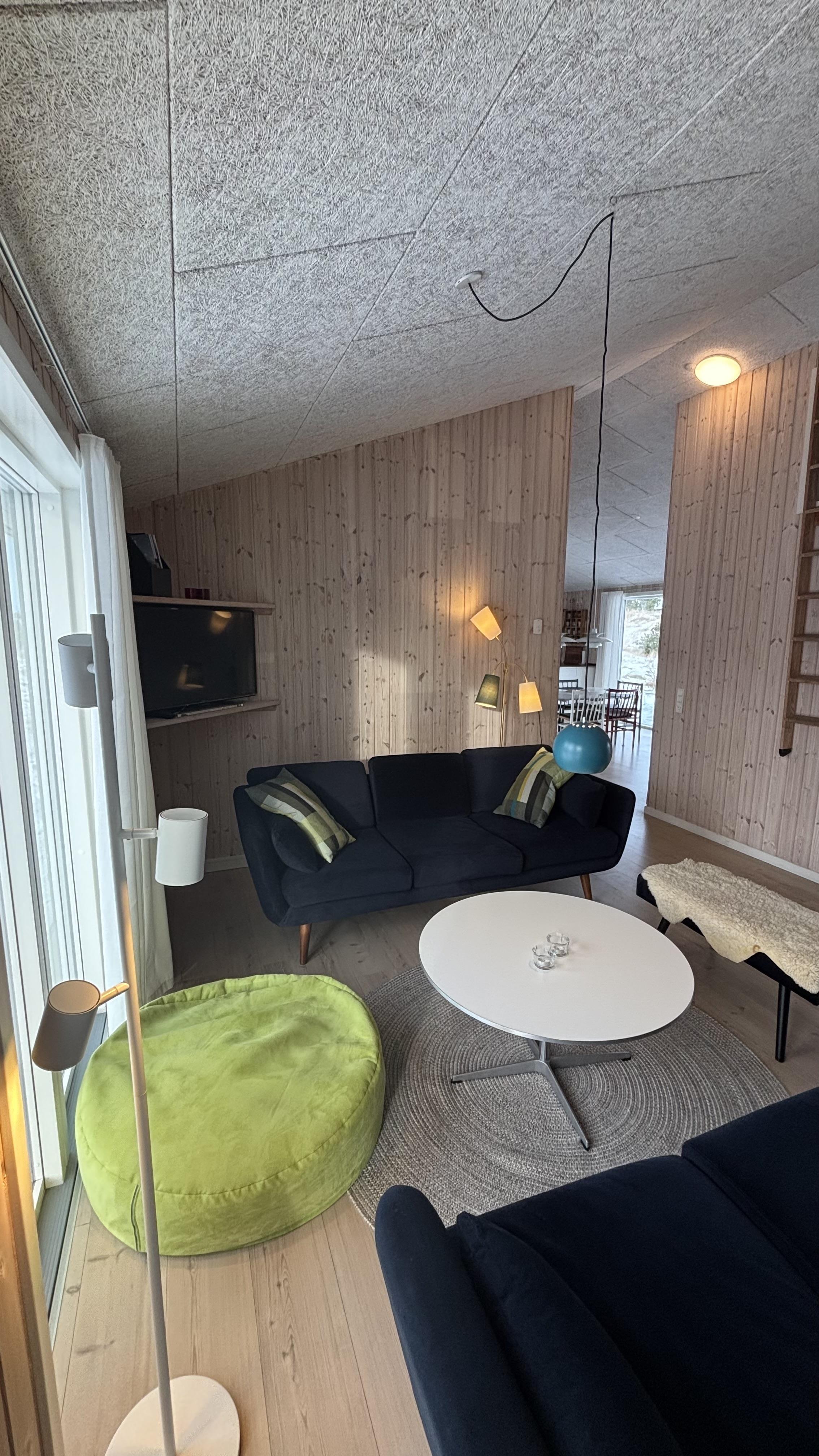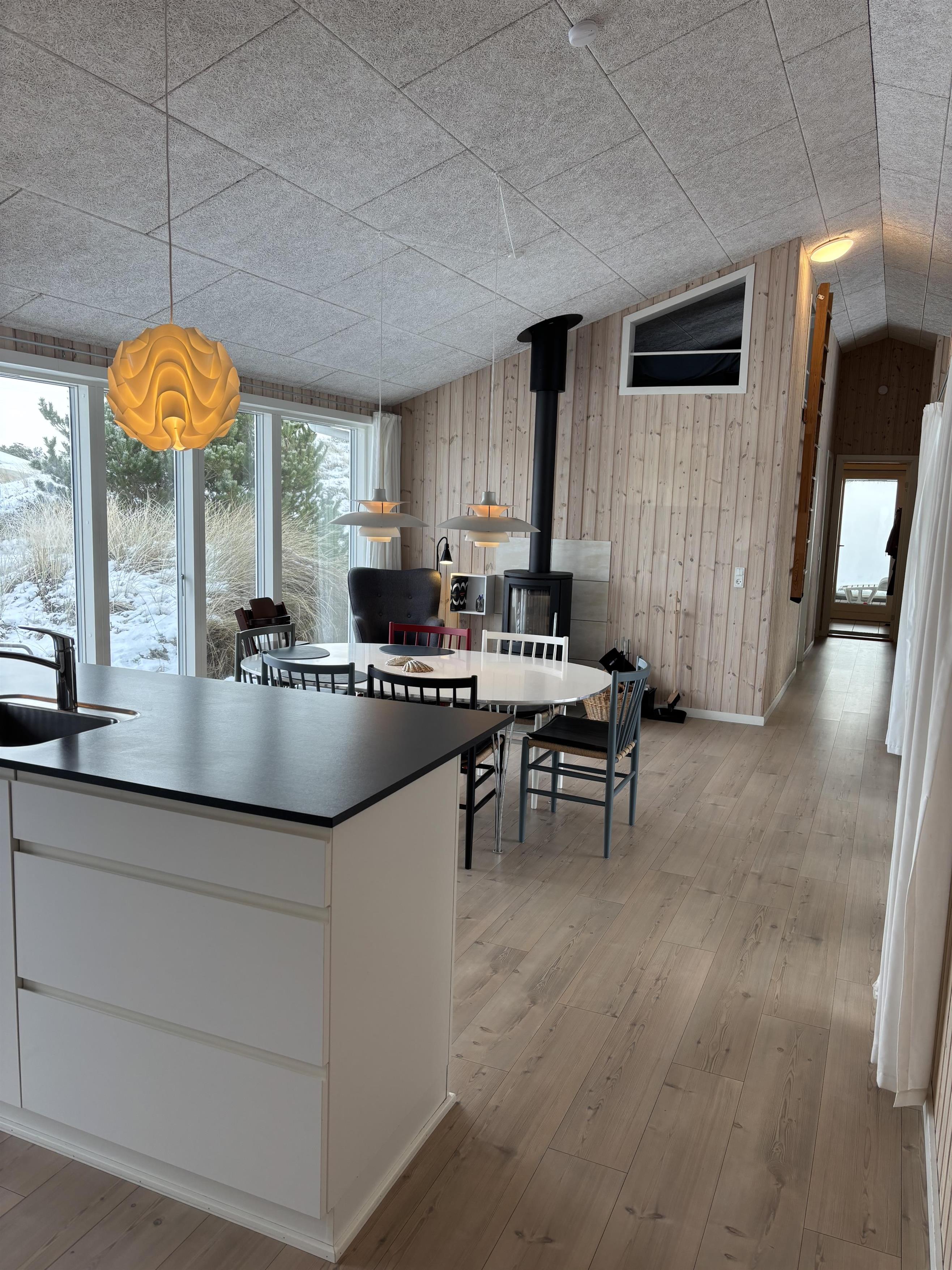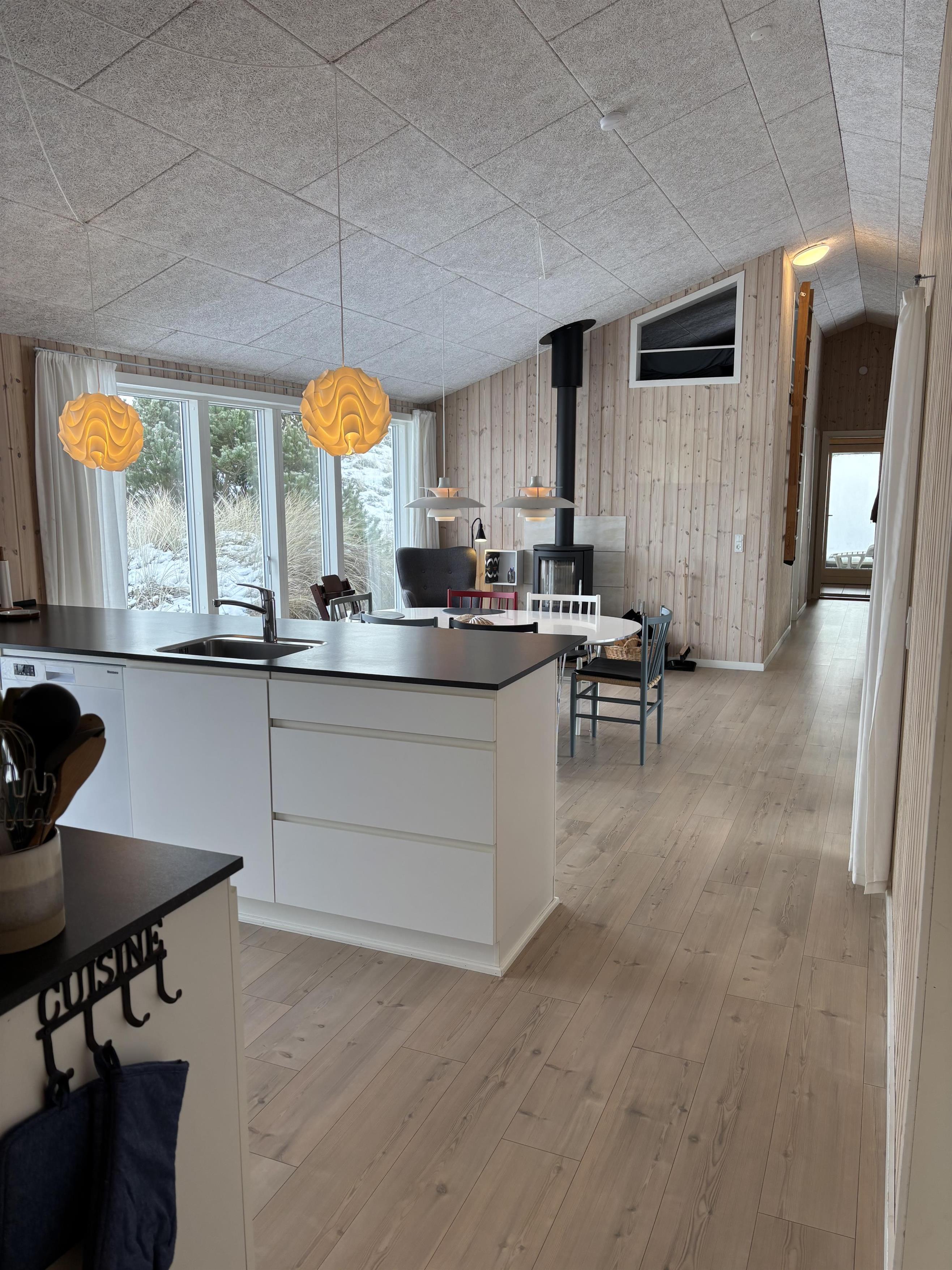 Ganz im charmanten, gemütlichen Retro-Stil und geschmackvollen Möbeln eingerichtet, lässt sich hier eine tolle Zeit genießen. Die bobdentiefen großen Fenster auf beiden Seiten des Ferienhauses lassen viel Licht herren und schaffen dadurch eine helle und freundliche Atmosphäre. Die Küche ist mit dem offene Wohnzimmer verbunden, in dem ein Holzofen an kühlen Abenden für eine behagliche Stimmung sorgt. Eine energeisparende Wärmepumpe und Fußbodenheizung im ganzen Haus sorgen ebenfalls für eine angenehme Raumtemperatur.