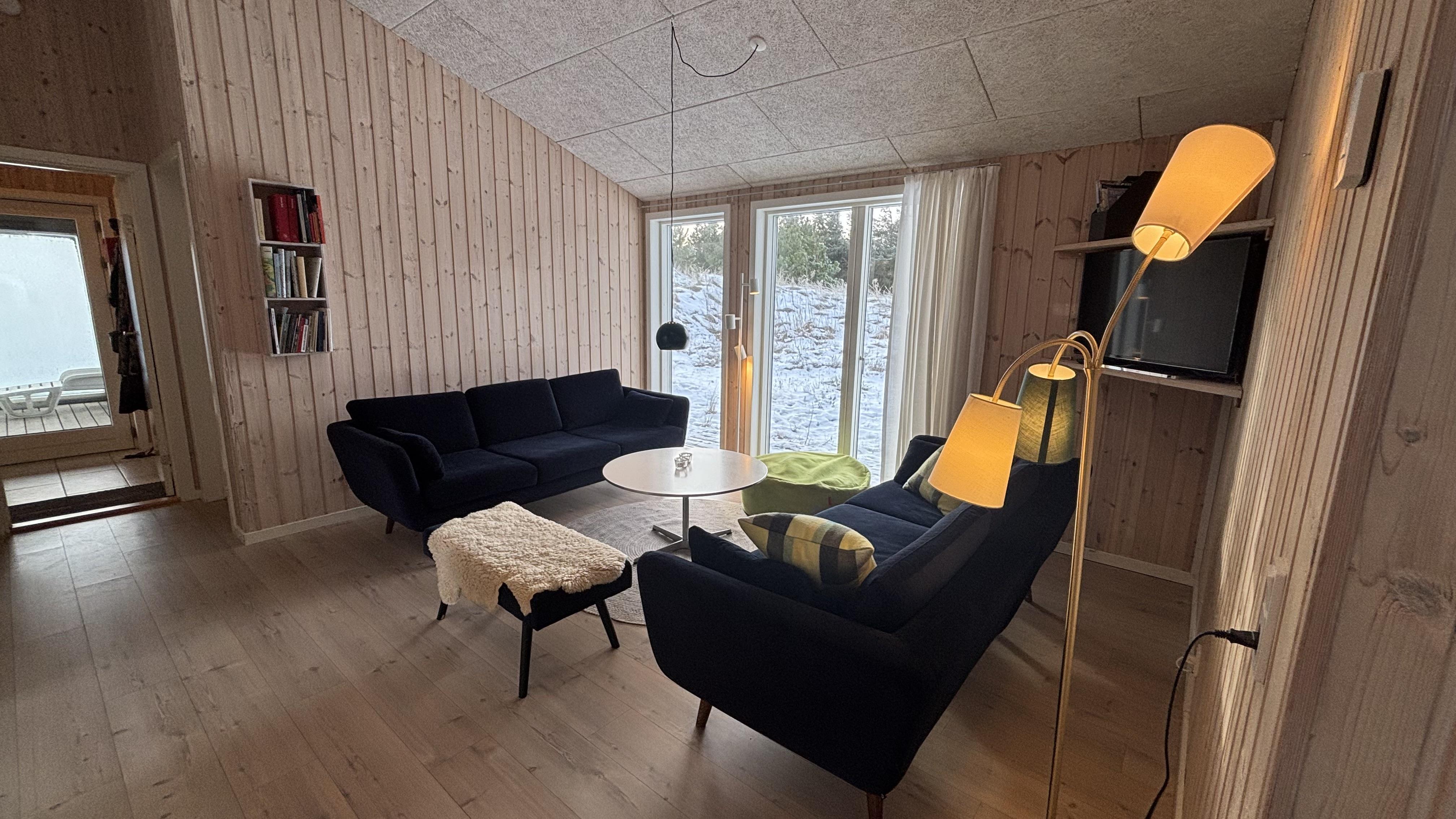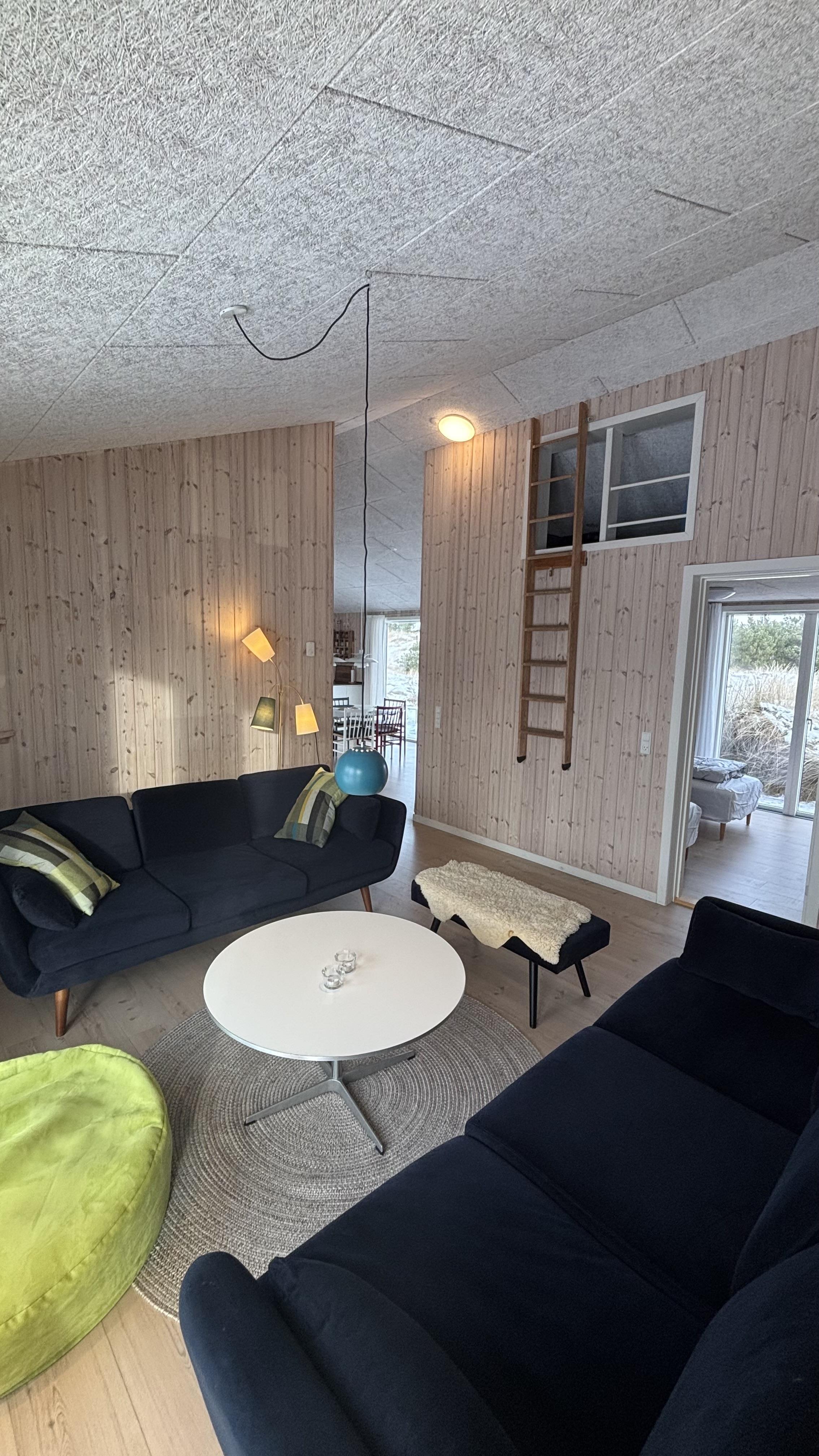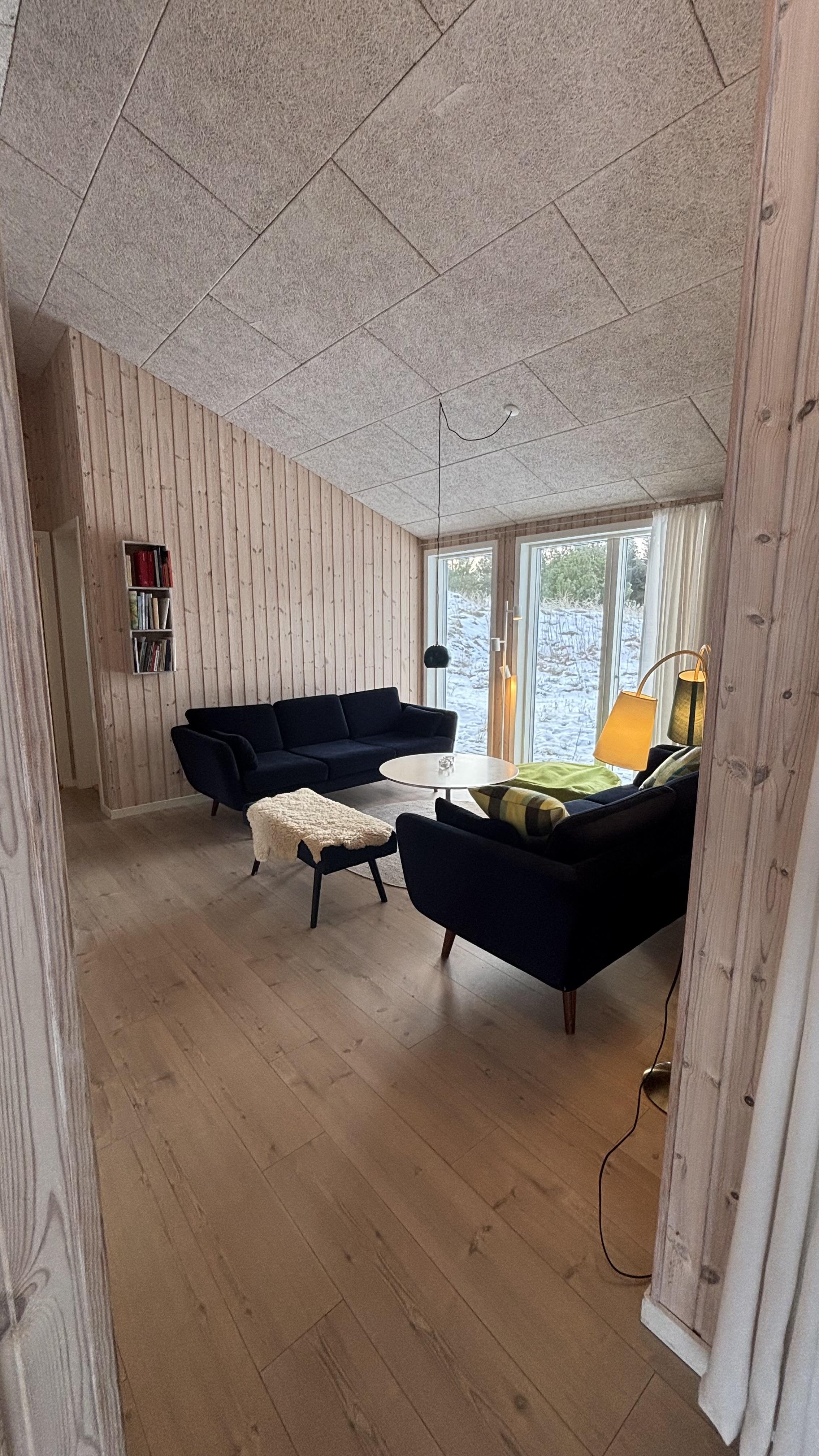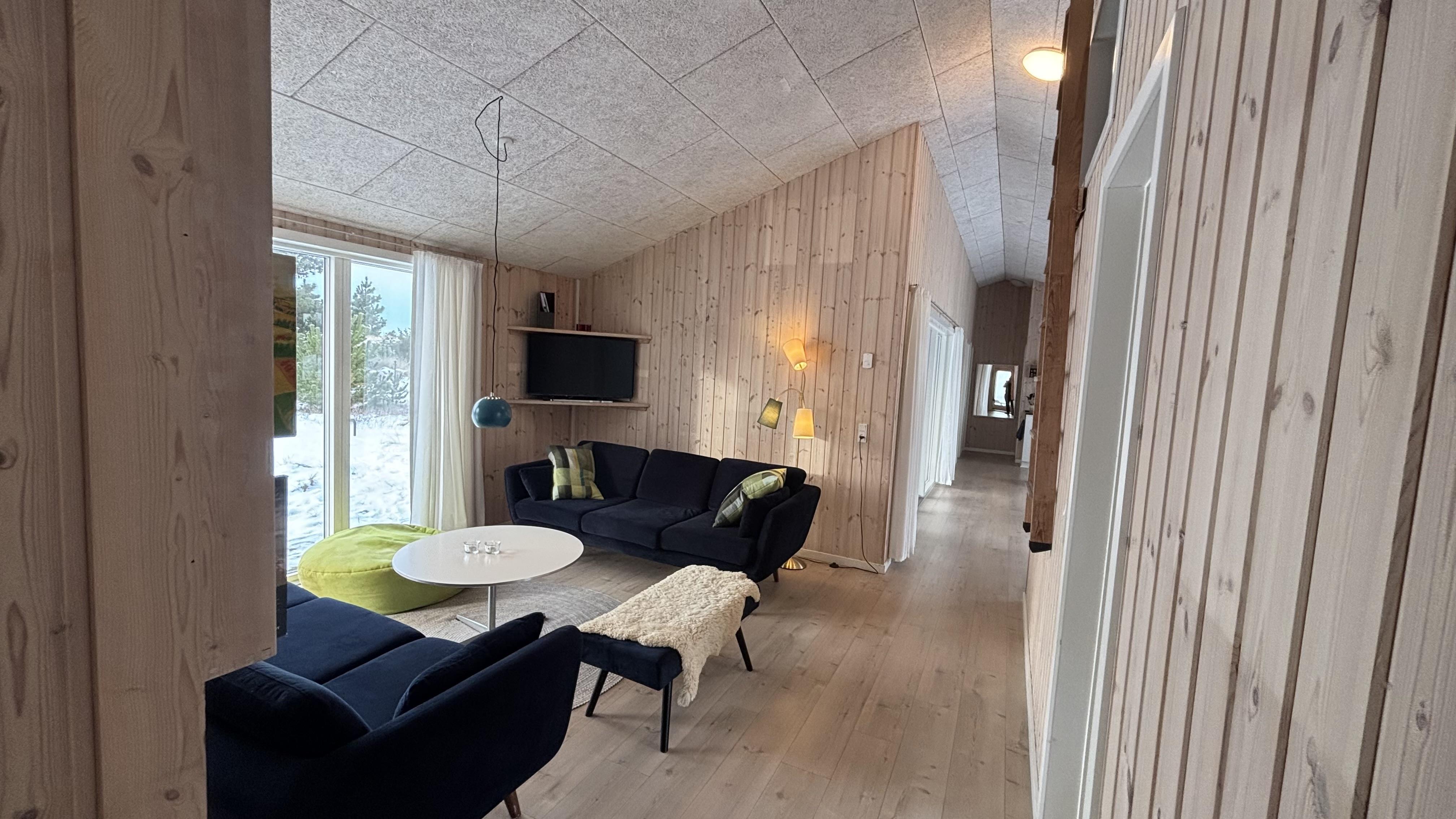 Ganz im charmanten, gemütlichen Retro-Stil und geschmackvollen Möbeln eingerichtet, lässt sich hier eine tolle Zeit genießen. Die bobdentiefen großen Fenster auf beiden Seiten des Ferienhauses lassen viel Licht herren und schaffen dadurch eine helle und freundliche Atmosphäre. Die Küche ist mit dem offene Wohnzimmer verbunden, in dem ein Holzofen an kühlen Abenden für eine behagliche Stimmung sorgt. Eine energeisparende Wärmepumpe und Fußbodenheizung im ganzen Haus sorgen ebenfalls für eine angenehme Raumtemperatur.