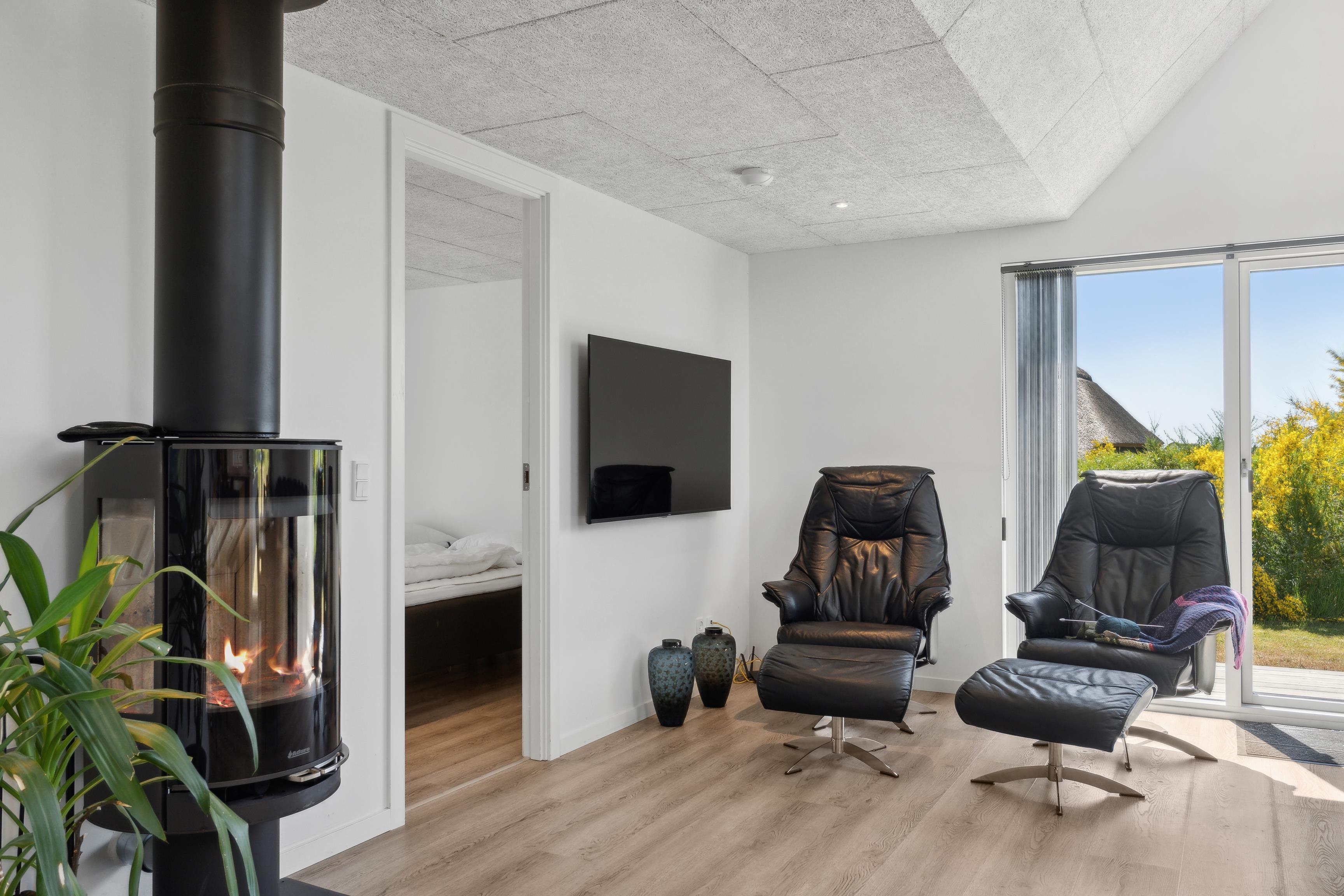 Das Haus verfügt über drei Schlafzimmer mit Doppelbetten und zwei Badezimmer mit Dusche sowie eine separate Toilette und ein drittes Badezimmer mit Dusche. Der offene Wohnbereich verbindet Küche und Wohnzimmer und ist mit einem Holzofen und modernen Möbeln ausgestattet – ideal zum Entspannen und für gemütliche Stunden. Es gibt keine Kinderbetten oder Hochstühle, was das Haus ideal für erwachsene Gäste oder Familien mit älteren Kindern macht.