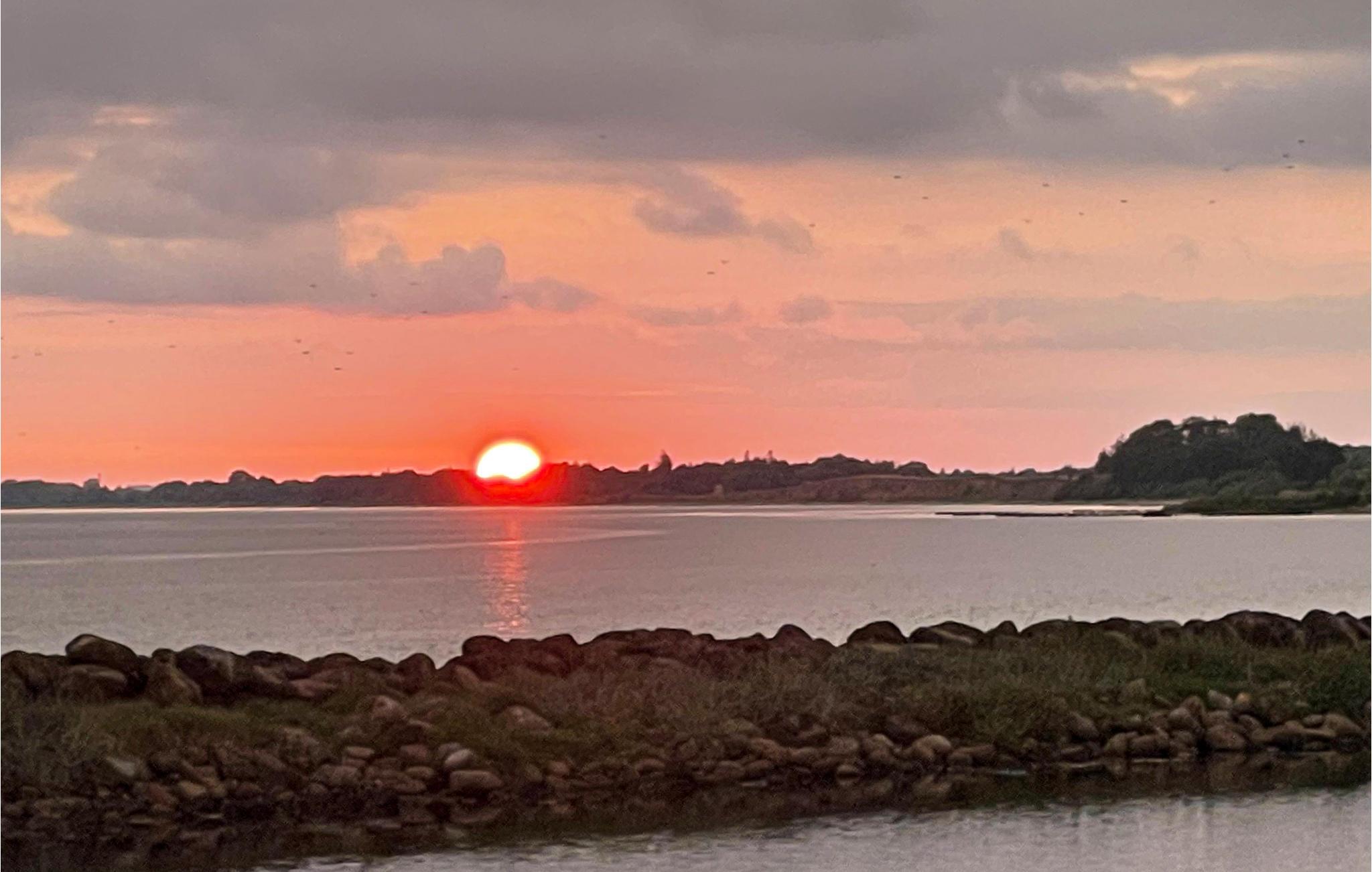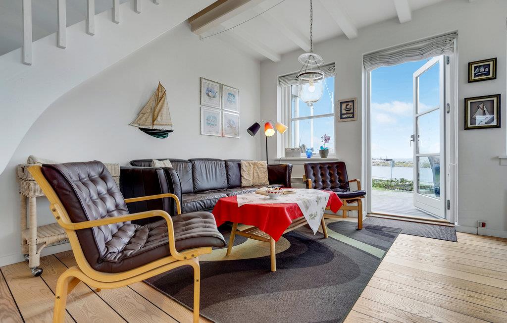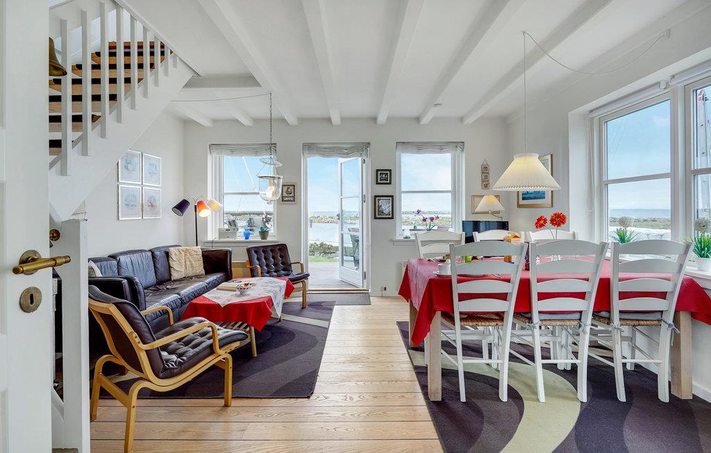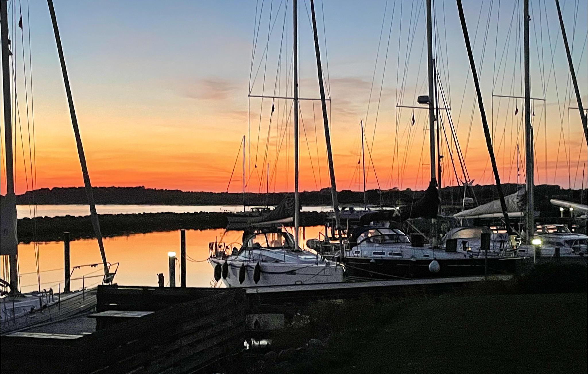 Charmante Ferienwohnung im Hafen von Klintholm mit Panoramablick auf Wasser und Sonnenuntergang.