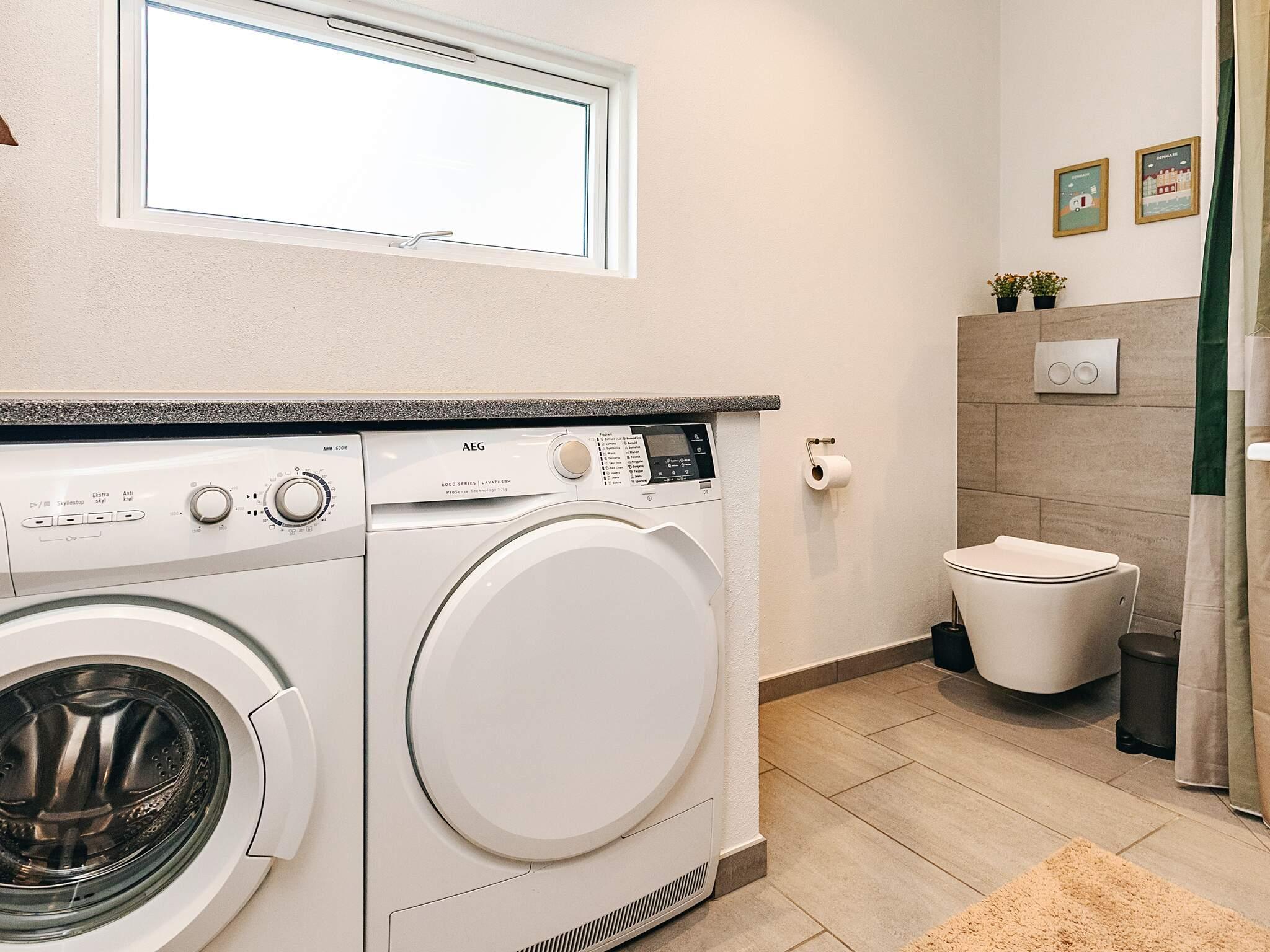 Bad: Waschm, Trockner, WC, Waschb., Dusche