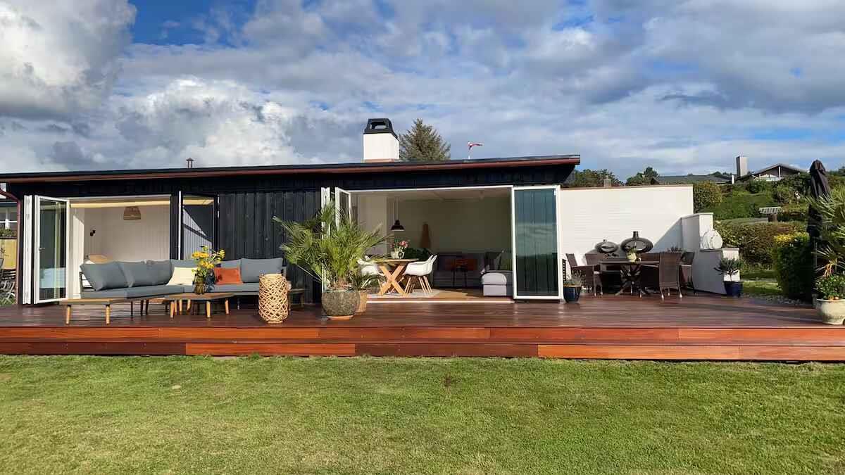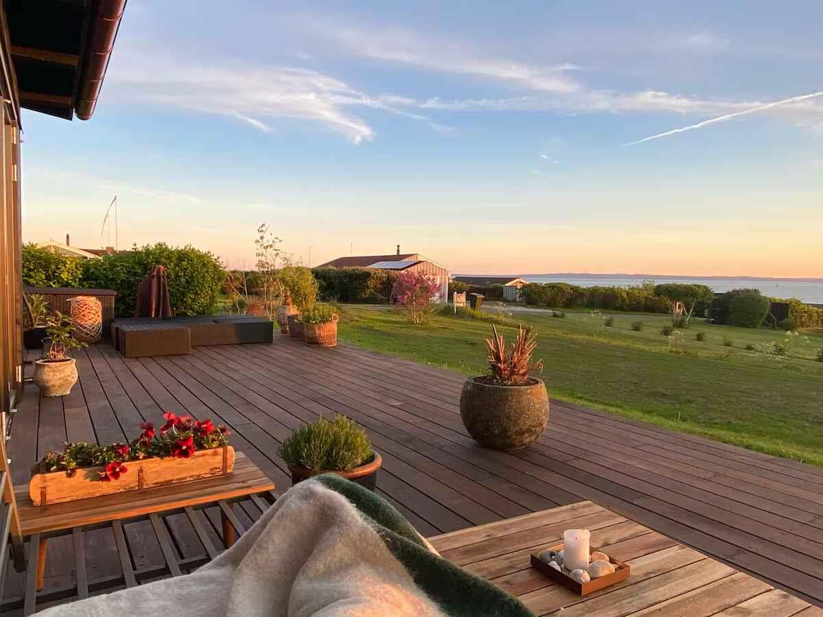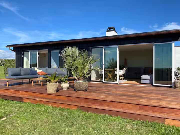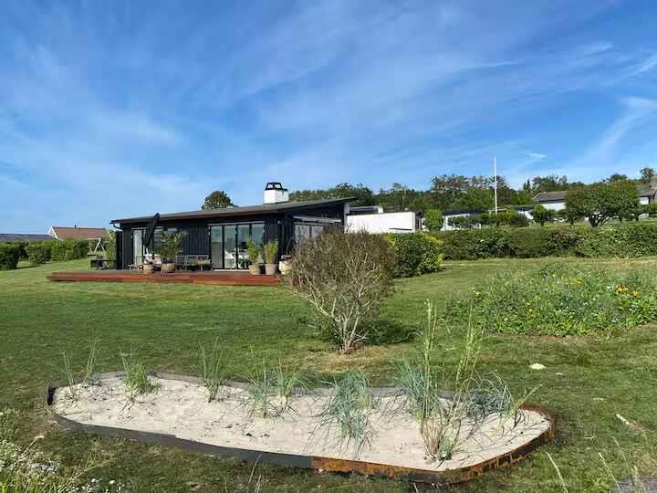 Modernes Ferienhaus mit 180° Meerblick, Terrasse, Pizzaofen und nur 350 m vom Strand in Knebel entfernt.