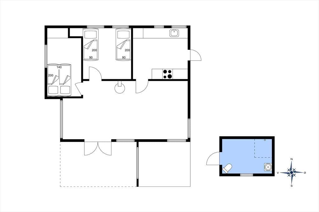 Küche mit Ausgang zu einer Morgen-Terrasse. Herd und Kühl- & Gefrierschrank. Wohnzimmer mit Ausgang zur Terrasse, Sofa, gutem Essplatz, Kaminofen und Smart-TV mit zugang zum Streaming-Diensten (separate Anmeldung erforderlich) Zwei Schlafzimmer, eins mit Doppelbet, und eins mit zwei Enkeltbetten. Anbau mit Toilette und Duschnische. Heizung des Hauses erfolgt durch Wärmepumpe, und Holtzofen. Außerdem gibs es ein Kinderstuhl im Haus.