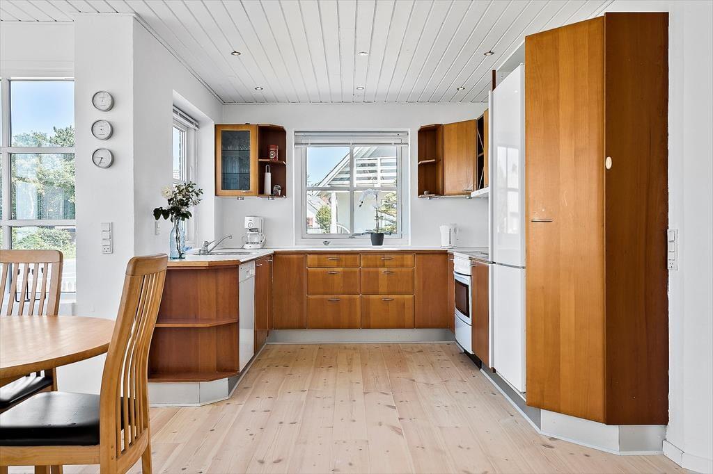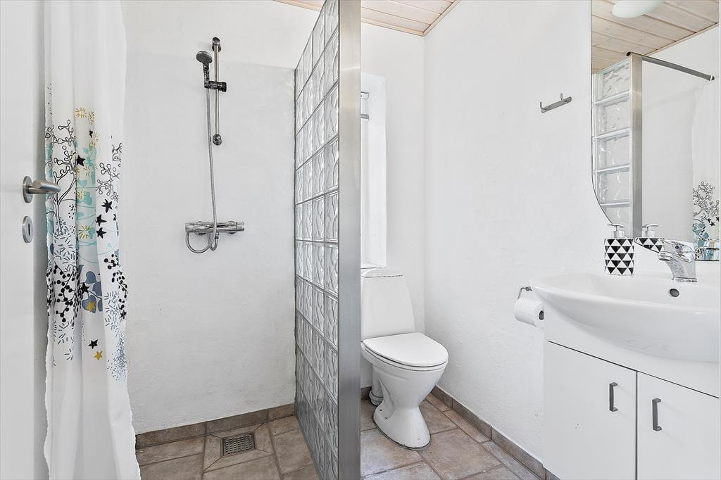 Im Erdgeschoss treffen Sie auf einen Eingangsbereich samt zugehörigem Hauswirtschaftsraum und auf ein großes Badezimmer mit einer Dusche. Hinter dem Eingangsbereich erwartet Sie der Küchen- und Wohnbereich mit einer gemütlichen Sitzecke, einem TV-Bereich, einem Kaminofen und einem Essplatz mit Meerblick. Durch die Terrassentür treten Sie hinaus in den Garten. Eine Treppe führt Sie in das Obergeschoss, in dem Ihnen ein weiteres Badezimmer und drei Schlafräume zur Verfügung stehen. Einer der Schlafräume ist mit Einzelbetten versehen. Ein kleiner Wohnraum mit Ausgang auf den Balkon mit Meerblick ist ebenfalls im Obergeschoss untergebracht.