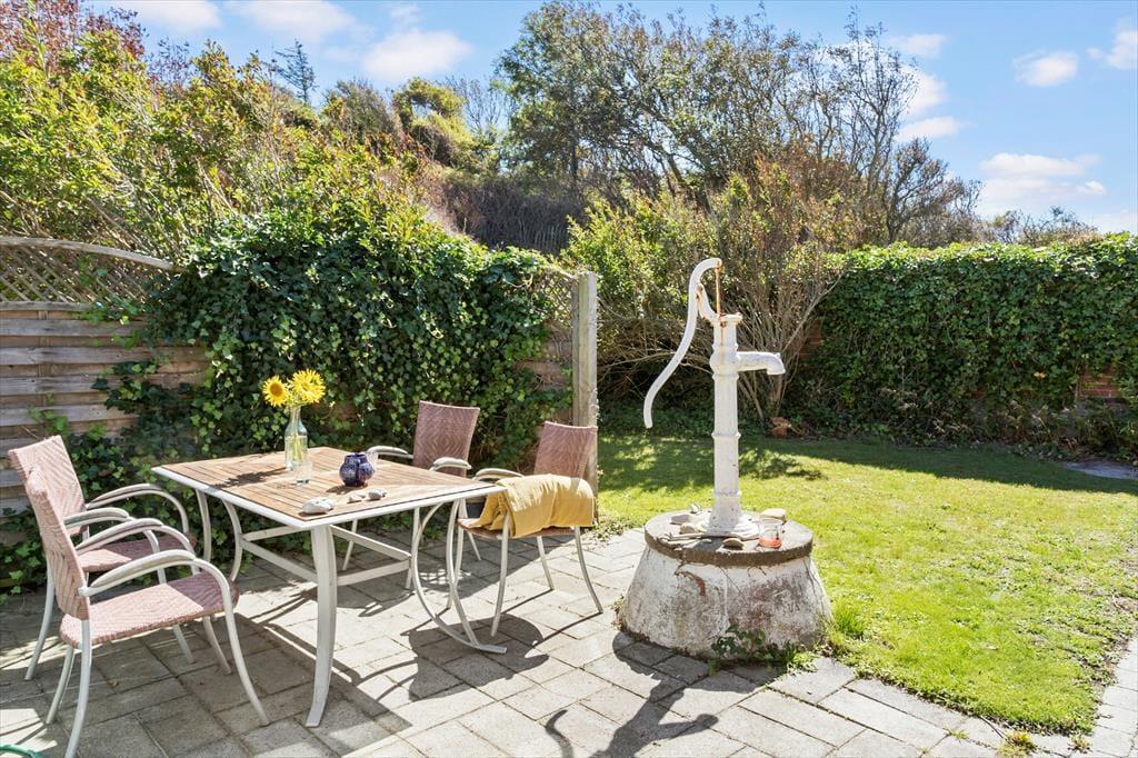 Vom Balkon des Obergeschosses aus blicken Sie auf das Meer und genießen wunderschöne Sonnenuntergänge. Der hintere Garten im Stil "gewollt wild" ist gut durch eine Hecke und einen begrünten Sichtschutzzaun abgeschirmt und gänzlich ungestört. Gen Osten befindet sich eine kleine gepflasterte Terrasse. Sie gelangen von hier aus in das Nebengebäude und durch eine Pforte auf den Hofplatz vor dem Haus. Der eingezäunte Vorgarten verfügt über eine kleine Grasfläche und eine Gartenbank.