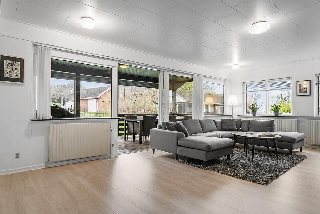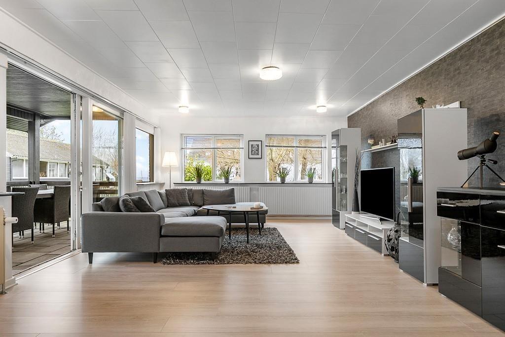 Im Wohnzimmer gibt es ein bequemes Sofa und einen Fernseher – perfekt, um nach einem erlebnisreichen Tag auf Samsø zu entspannen. Die hellen Decken, großen Fenster und die Terrassentür lassen viel Tageslicht herein und bieten Ausblick auf den Garten und den Hafen.