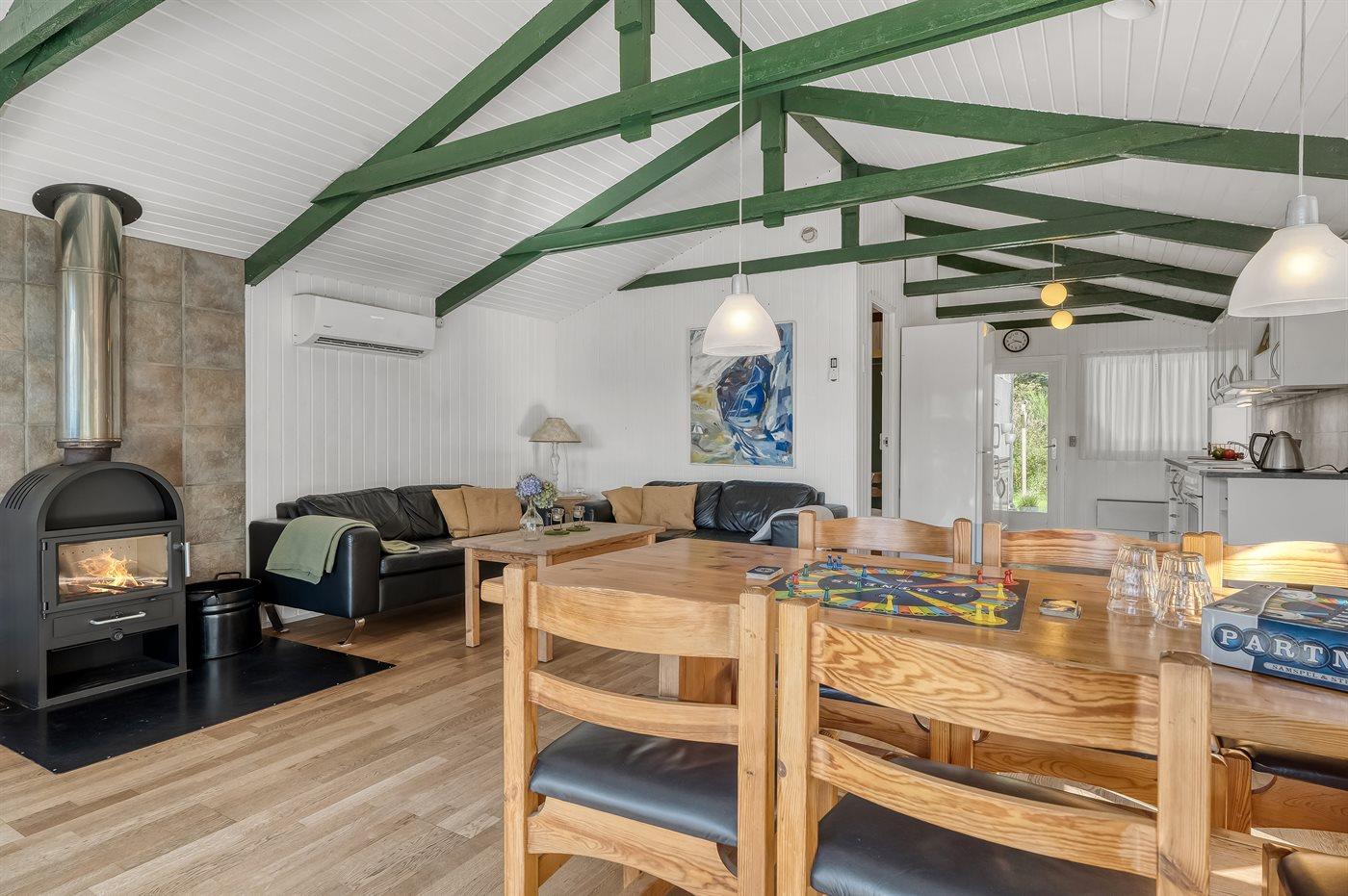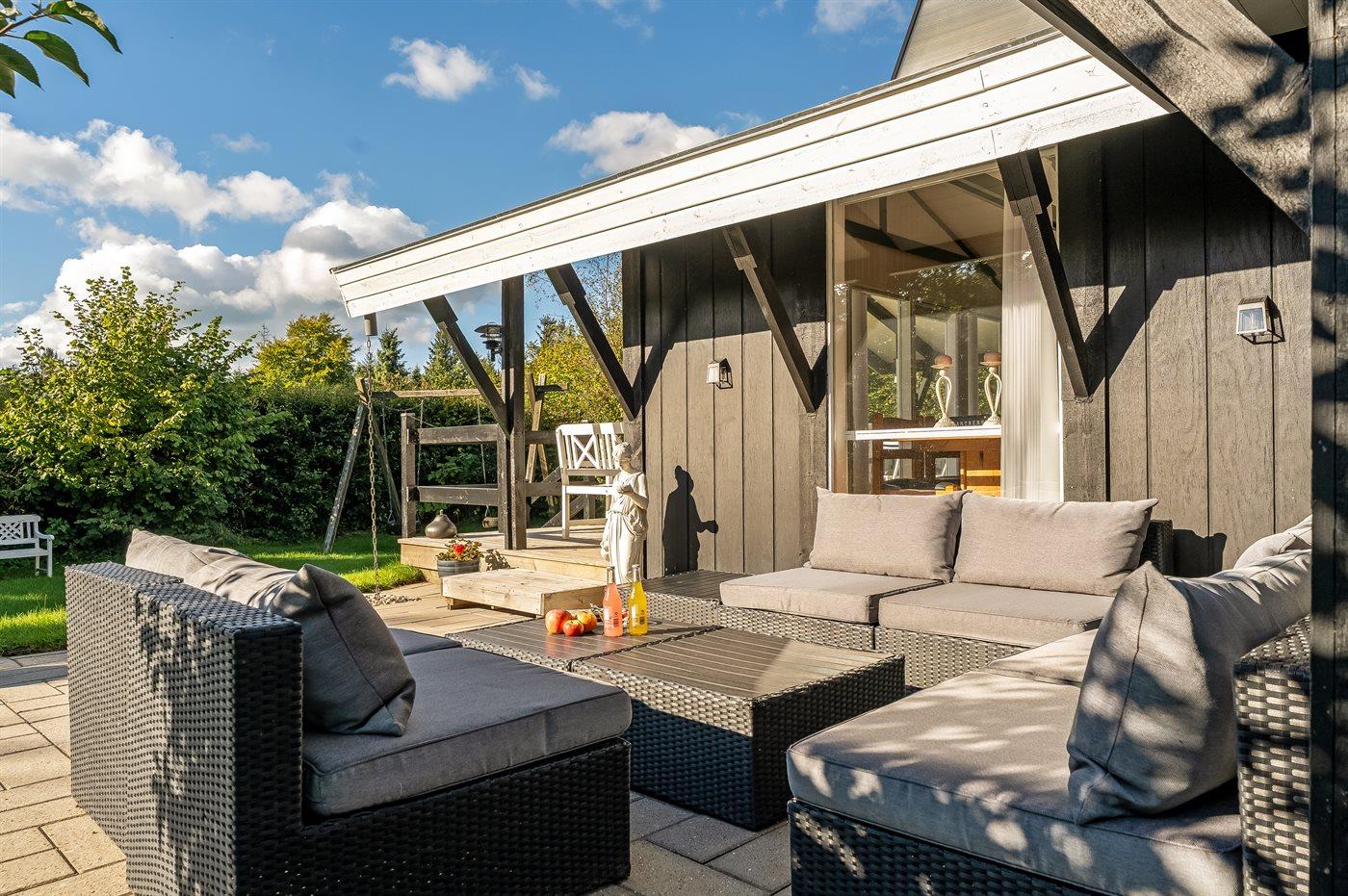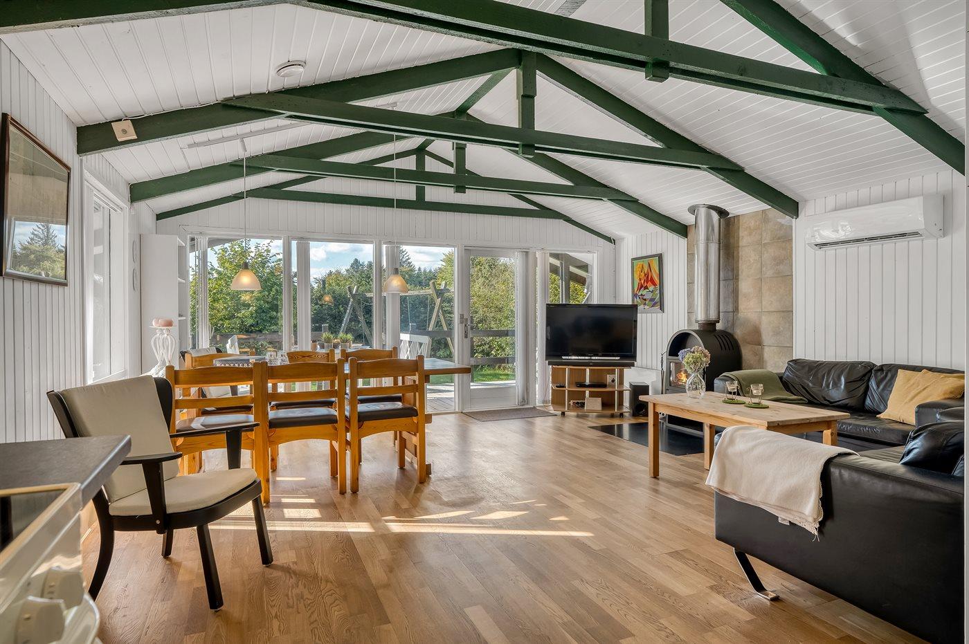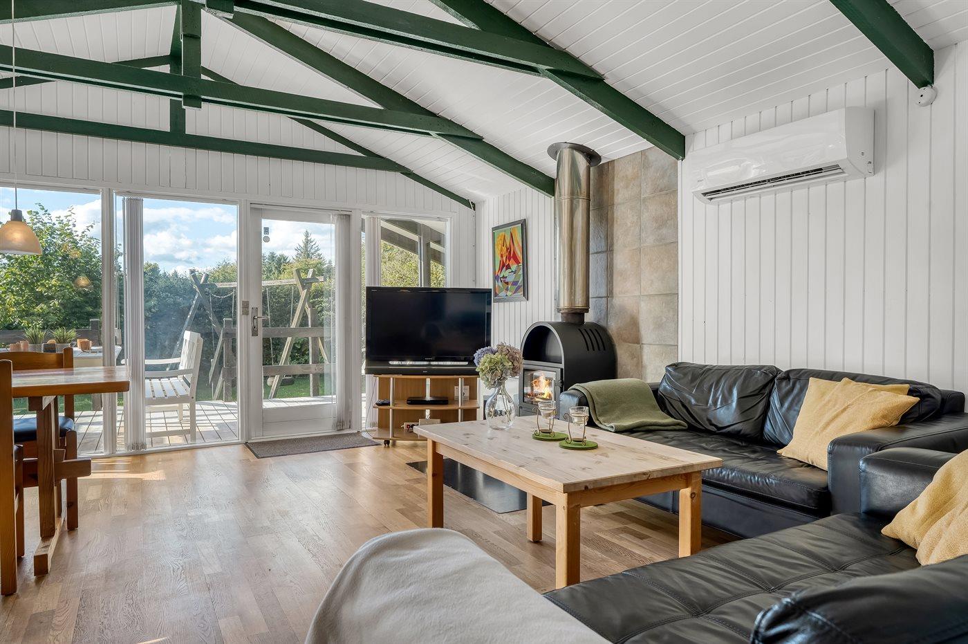 Charmantes Ferienhaus in Kollerup mit Terrasse, Kaminofen und Elektroauto-Ladestation für entspannte Urlaubstage.