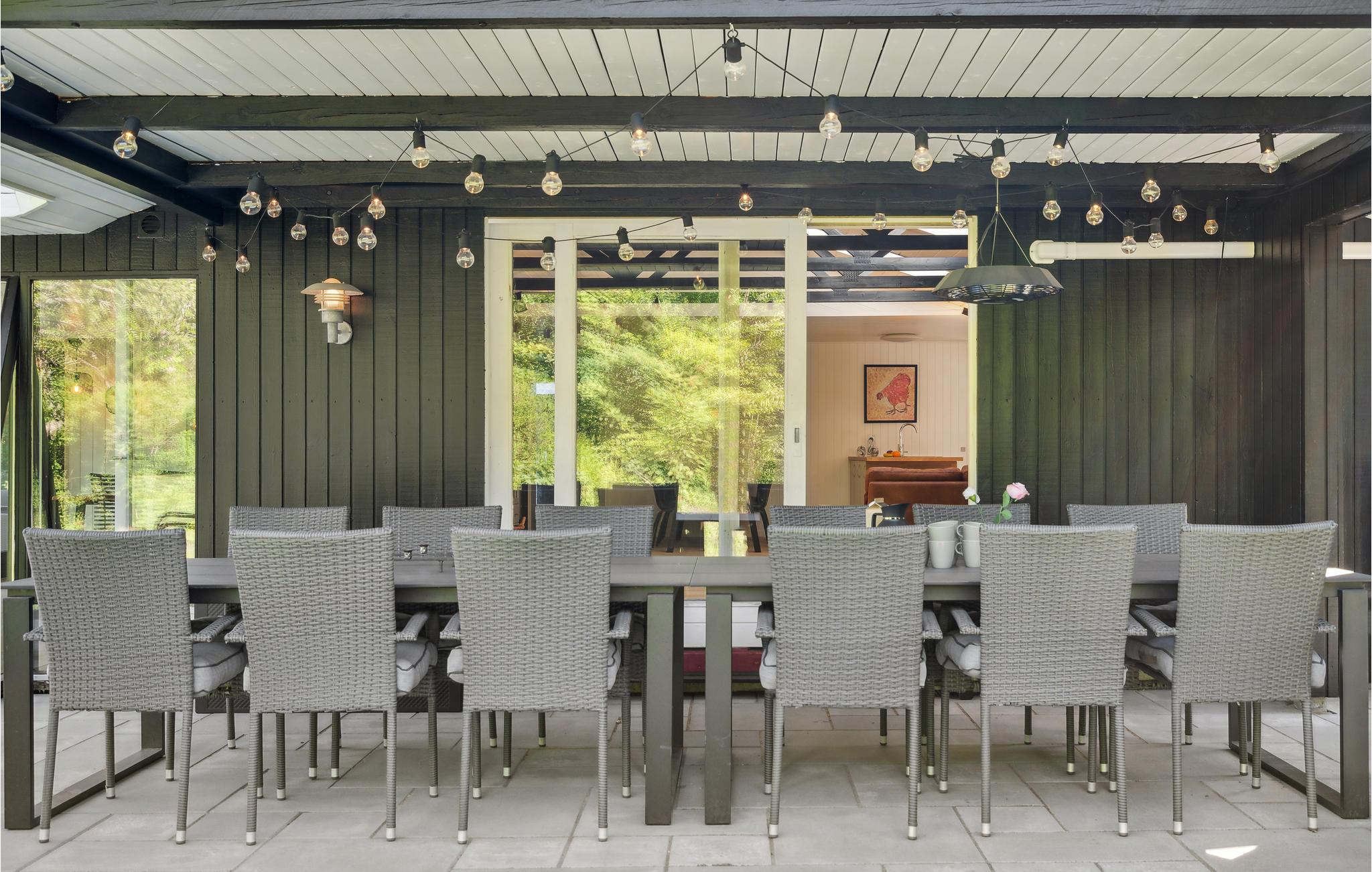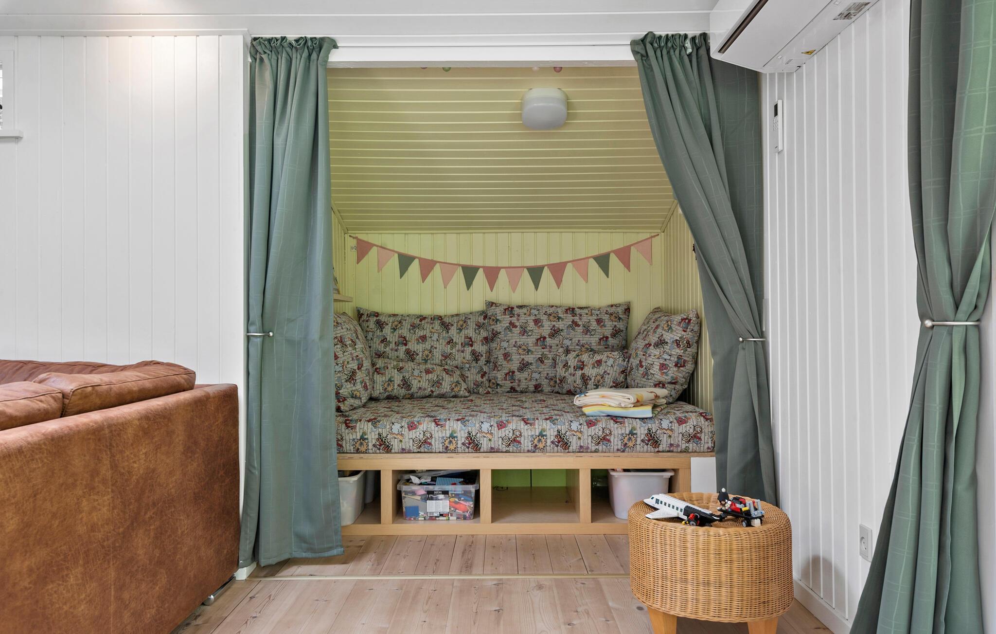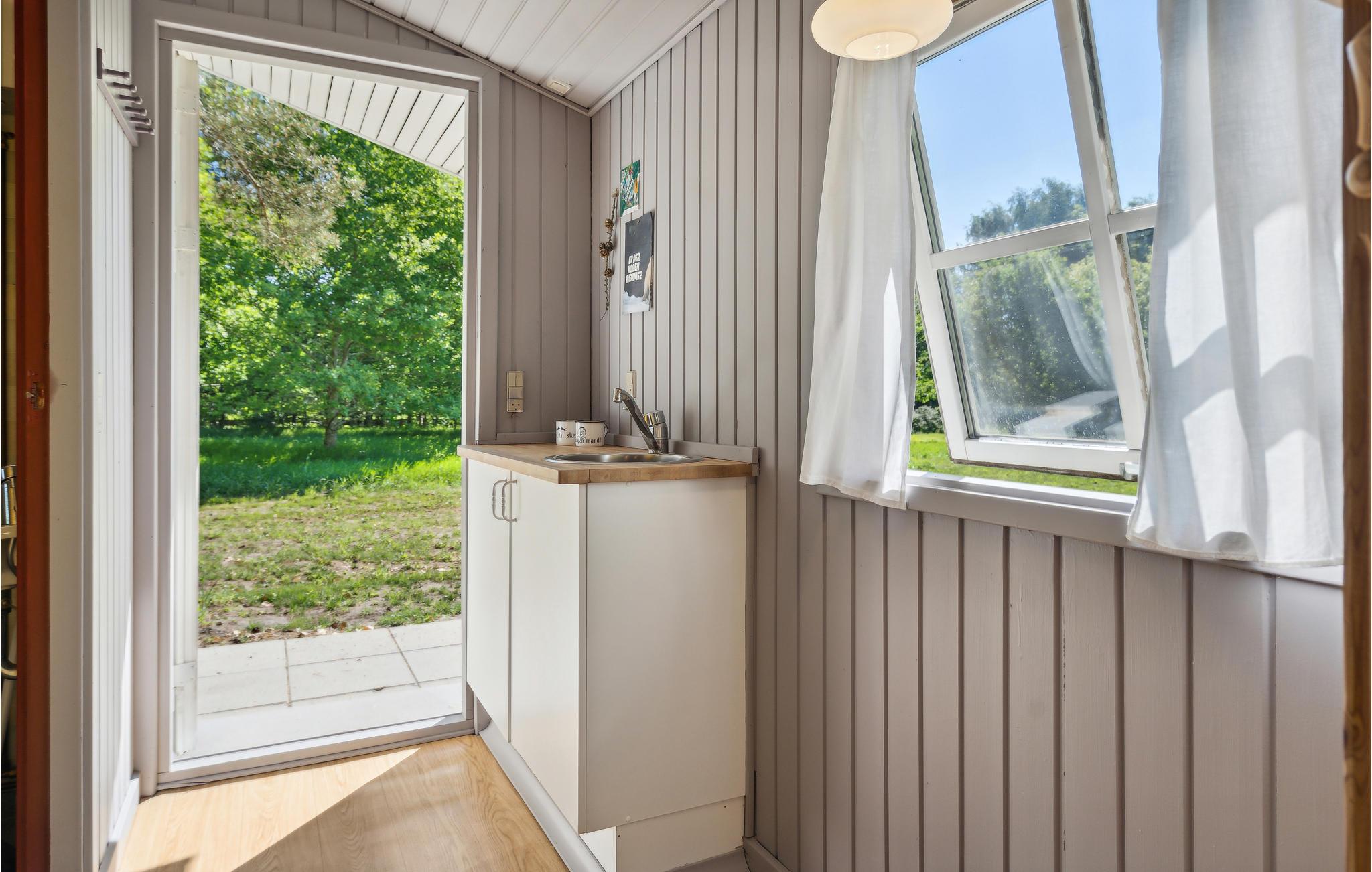 Das komfortable Haus empfängt Sie in schöner Lage auf einem von Bäumen umgebenen Grundstück. Die hellen Räume mit ruhiger Farbgebung und dekorativen Balken im Wohnbereich bilden einen gemütlichen Rahmen, in dem Sie den Alltag weit hinter sich lassen können. Entspannen Sie hier mit schönem Blick in die Natur durch große Panoramafenster. Machen Sie es sich mit einem Film oder Spielen auf dem Sofa gemütlich und genießen Sie die Urlaubsabende, während Sie bis spät am Kaminofen plaudern.