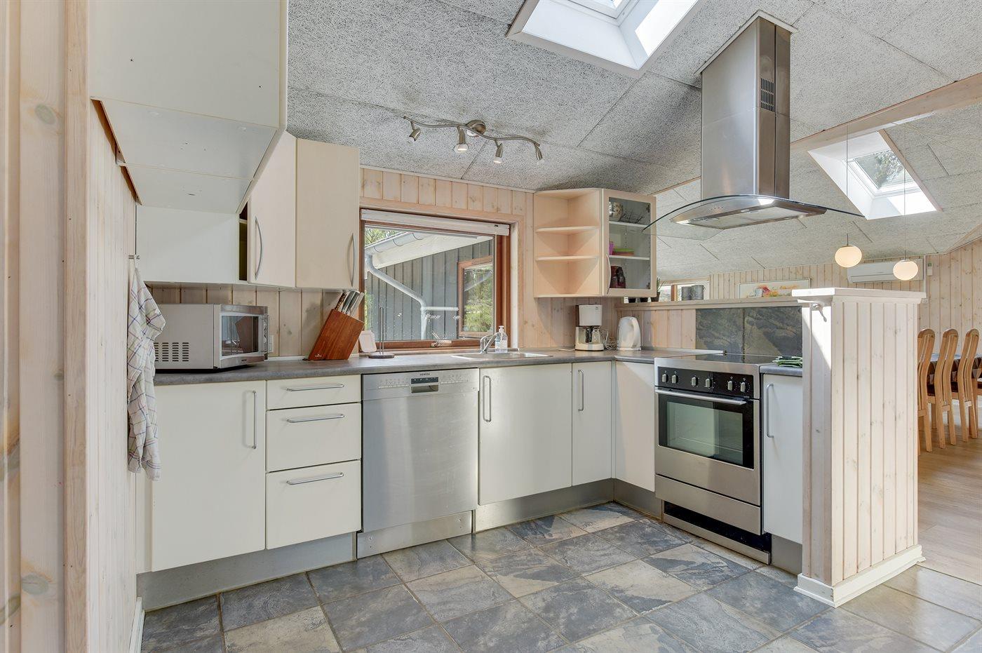 Die Küche ist mit Kühlschrank ausgestattet. Außerdem gibt es 4 Keramik-Kochfelder, Umluftofen, Mikrowelle sowie Geschirrspüler.