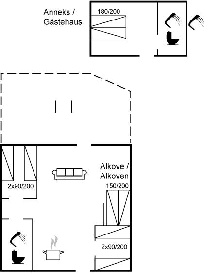 Die Schlafplätze verteilen sich auf 4 Schlafräume. 2 Schlafplätze in einem Doppelbett. 4 Schlafplätze in Einzelbetten.2 Schlafplätze im Alkoven. 2 von diesen Schlafplätzen befinden sich im Wohnzimmer des Ferienhauses, und 2 Schlafplätzen befinden sich im Gästehaus.