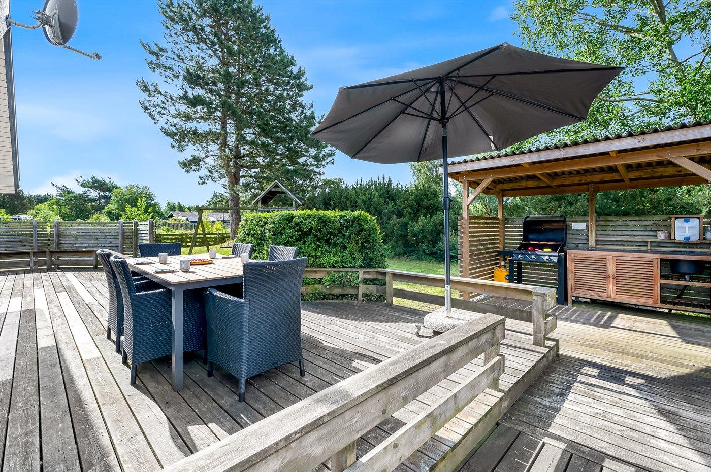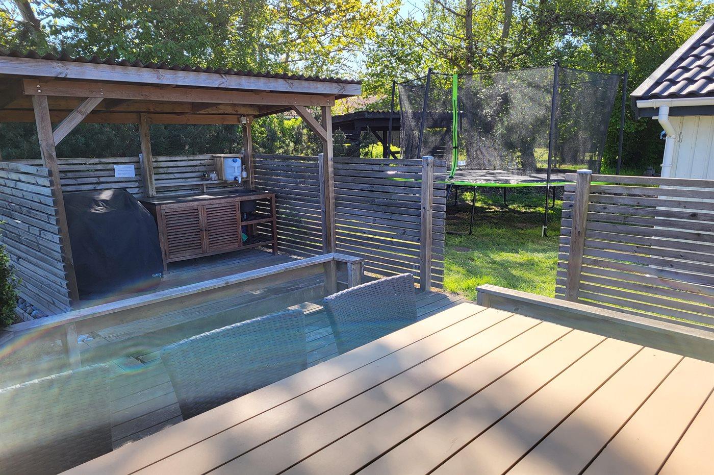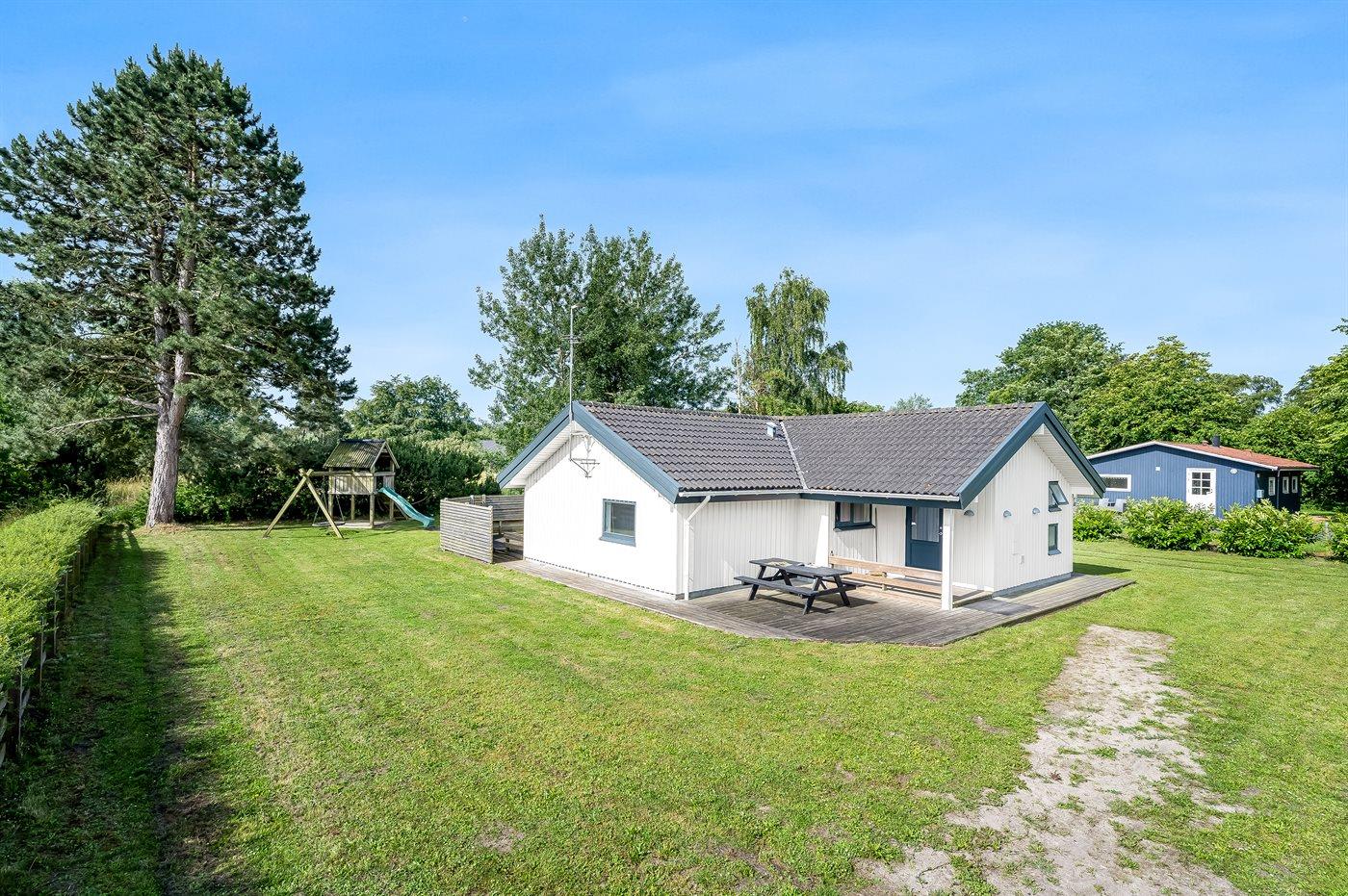 Die Ferienunterkunft liegt auf einem 900 m² großen Naturgrundstück. Die Entfernung zum Meer beträgt 800 m. Die nächste Einkaufsmöglichkeit liegt 900 m entfernt. Es steht ein 20 m² Terrassenareal zur Verfügung. Außerdem gibt es 8 m² überdachte Terrasse. Schaukel. Sandkasten. Spielturm. Rutsche. Parkplatz auf dem Grundstück.